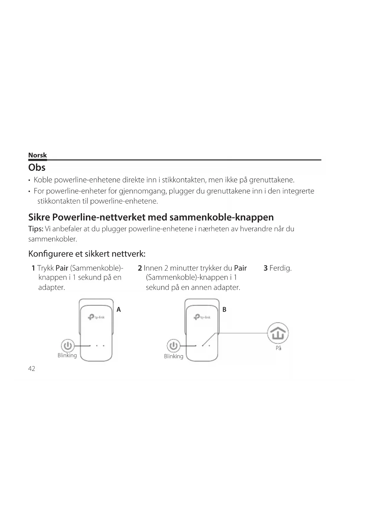 - For powerline-enheter for gjennomgang, plugger du grenuttakene inn i den integrerte stikkontakten til powerline-enhetene. Sikre Powerline-nettverket med sammenkoble-knappen Tips: Vi anbefaler at du plugger powerline-enhetene i nærheten av hverandre når du sammenkobler. Kongurere et sikkert nettverk: 1 Trykk Pair (Sammenkoble)- knappen i 1 sekund på en adapter. 2 Innen 2 minutter trykker du Pair (Sammenkoble)-knappen i 1 sekund på en annen adapter. 3 Ferdig. A B BlinkingBlinking PåNorsk