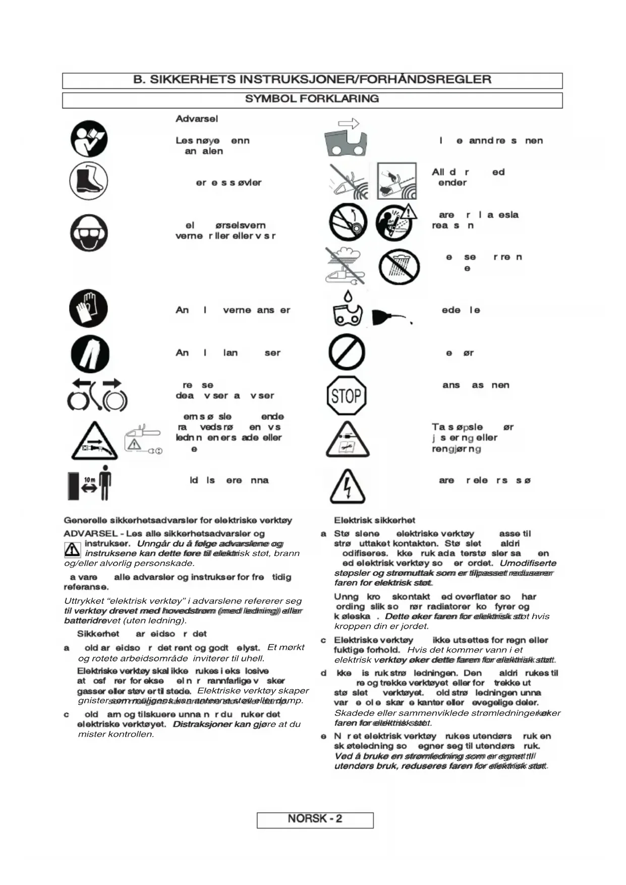 YMBOL FORKLARING NORSK - 2 Advarsel Les nøye gjennom manualen Sikkerhets støvler Hjelm, hørselsvern og vernebriller eller visir Anti-klipp vernehansker Anti-klipp lang bukser Bremse deaktivisert,aktivisert Fjern støpslet omgående fra hovedstrømmen hvis ledningen er skadet eller kuttet Hold tilskuere unna Klippe tanndireksjonen Alltid bruk med to hender. Fare for tilbakeslag reaksjon. Ikke utsett for regn og fuktighet Kjede olje Ikke gjør