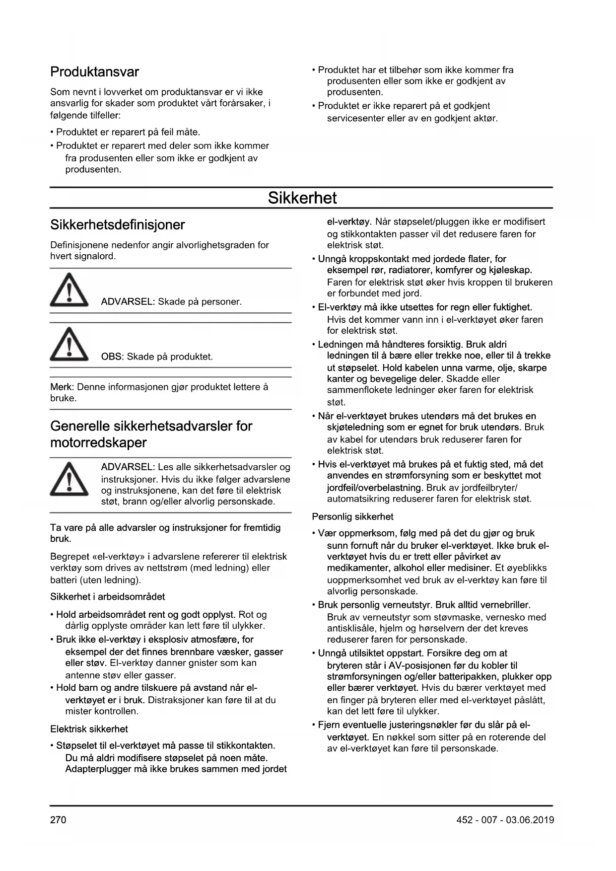 452 - 007 - 03.06.2019Sikkerhetsinstruksjoner for drift