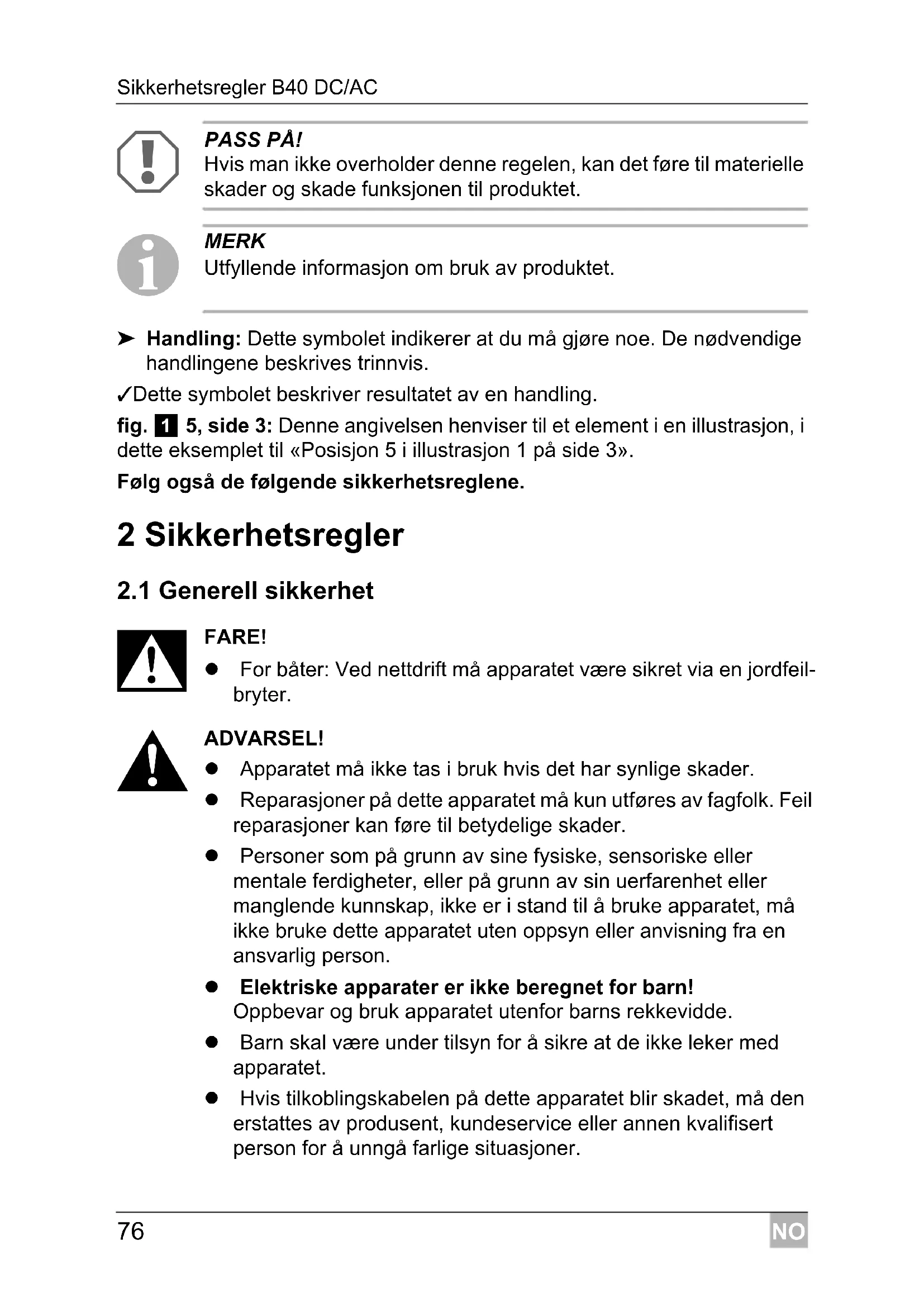 ADVARSEL! Apparatet må ikke tas i bruk hvis det har synlige skader. Reparasjoner på dette apparatet må kun utføres av fagfolk. Feil reparasjoner kan føre til betydelige skader. Personer som på grunn av sine fysiske, sensoriske eller mentale ferdigheter, eller på grunn av sin uerfarenhet eller manglende kunnskap, ikke er i stand til å bruke apparatet, må ikke bruke dette apparatet uten oppsyn eller anvisning fra en ansvarlig person. Elektriske apparater er ikke beregnet for barn! Oppbevar og bruk apparatet utenfor barns rekkevidde. Barn skal være under tilsyn for å sikre at de ikke leker med apparatet. Hvis tilkoblingskabelen på dette apparatet blir skadet, må den erstattes av produsent, kundeservice eller annen kvalifisert person for å unngå farlige situasjoner. _B40.book Seite 76 Mittwoch, 20. April 2011 3:28 15NO B40 DC/AC Sikkerhetsregler