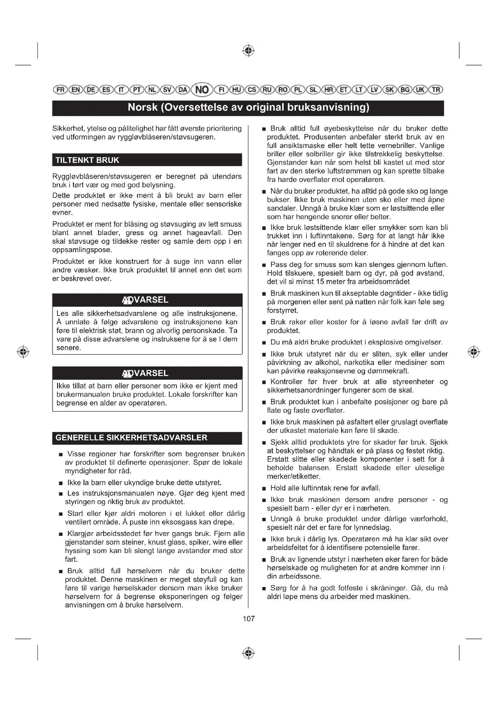 BEMÆRKNINGER: ■ Vedligeholdelse bør udføres mere regelmæssigt, når produktet anvendes på støvede områder. ■ Når produktet har overskredet de maksimale tal, der er angivet i tabellen, bør vedligeholdelse stadig gennemgå cyklusser i henhold til de tidsintervaller eller timer angivet heri.107 Norsk (Oversettelse av original bruksanvisning) Sikkerhet, ytelse og pålitelighet har fått øverste prioritering ved utformingen av ryggløvblåseren/støvsugeren. TILTENKT BRUK Ryggløvblåseren/støvsugeren er beregnet på utendørs bruk i tørt vær og med god belysning. Dette produktet er ikke ment å bli brukt av barn eller personer med nedsatte fysiske, mentale eller sensoriske evner. Produktet er ment for blåsing og støvsuging av lett smuss blant annet blader, gress og annet hageavfall. Den skal støvsuge og tildekke rester og samle dem opp i en oppsamlingspose. Produktet er ikke konstruert for å suge inn vann eller andre væsker. Ikke bruk produktet til annet enn det som er beskrevet over. ADVARSEL Les alle sikkerhetsadvarslene og alle instruksjonene. Å unnlate å følge advarslene og instruksjonene kan føre til elektrisk støt, brann og alvorlig personskade. Ta vare på disse advarslene og instruksene for å se I dem senere. ADVARSEL Ikke tillat at barn eller personer som ikke er kjent med brukermanualen bruke produktet. Lokale forskrifter kan begrense en alder av operatøren. GENERELLE SIKKERHETSADVARSLER ■ Visse regioner har forskrifter som begrenser bruken av produktet til definerte operasjoner. Spør de lokale myndigheter for råd. ■ Ikke la barn eller ukyndige bruke dette utstyret. ■ Les instruksjonsmanualen nøye. Gjør deg kjent med styringen og riktig bruk av produktet. ■ Start eller kjør aldri motoren i et lukket eller dårlig ventilert område. Å puste inn eksosgass kan drepe. ■ Klargjør arbeidsstedet før hver gangs bruk. Fjern alle gjenstander som steiner, knust glass, spiker, wire eller hyssing som kan bli slengt lange avstander med stor fart. ■ Bruk alltid full hørselvern når du bruker dette produktet. Denne maskinen er meget støyfull og kan føre til varige hørselskader dersom man ikke bruker hørselvern for å begrense eksponeringen og følger anvisningen om å bruke hørselvern. ■ Bruk alltid full øyebeskyttelse når du bruker dette produktet. Produsenten anbefaler sterkt bruk av en full ansiktsmaske eller helt tette vernebriller. Vanlige briller eller solbriller gir ikke tilstrekkelig beskyttelse. Gjenstander kan når som helst bli kastet ut med stor fart av den sterke luftstrømmen og kan sprette tilbake fra harde overflater mot operatøren. ■ Når du bruker produktet, ha alltid på gode sko og lange bukser. Ikke bruk maskinen uten sko eller med åpne sandaler. Unngå å bruke klær som er løstsittende eller som har hengende snorer eller belter. ■ Ikke bruk løstsittende klær eller smykker som kan bli trukket inn i luftinntakene. Sørg for at langt hår ikke når lenger ned en til skuldrene for å hindre at det kan fanges opp av roterende deler. ■ Pass deg for smuss som kan slenges gjennom luften. Hold tilskuere, spesielt barn og dyr, på god avstand, det vil si minst 15 meter fra arbeidsområdet ■ Bruk maskinen kun til akseptable døgntider - ikke tidlig på morgenen eller sent på natten når folk kan føle seg forstyrret. ■ Bruk raker eller koster for å løsne avfall før drift av produktet. ■ Du må aldri bruke produktet i eksplosive omgivelser. ■ Ikke bruk utstyret når du er sliten, syk eller under påvirkning av alkohol, narkotika eller medisiner som kan påvirke reaksjonsevne og dømmekraft. ■ Kontroller før hver bruk at alle styreenheter og sikkerhetsanordninger fungerer som de skal. ■ Bruk produktet kun i anbefalte posisjoner og bare på flate og faste overflater. ■ Ikke bruk maskinen på asfaltert eller gruslagt overflate der utkastet materiale kan føre til skade. ■ Sjekk alltid produktets ytre for skader før bruk. Sjekk at beskyttelser og håndtak er på plass og festet riktig. Erstatt slitte eller skadede komponenter i sett for å beholde balansen. Erstatt skadede eller uleselige merker/etiketter. ■ Hold alle luftinntak rene for avfall. ■ Ikke bruk maskinen dersom andre personer - og spesielt barn - eller dyr er i nærheten. ■ Unngå å bruke produktet under dårlige værforhold, spesielt når det er fare for lynnedslag. ■ Ikke bruk i dårlig lys. Operatøren må ha klar sikt over arbeidsfeltet for å identifisere potensielle farer. ■ Bruk av lignende utstyr i nærheten øker faren for både hørselskade og muligheten for at andre kommer inn i din arbeidssone. ■ Sørg for å ha godt fotfeste i skråninger. Gå, du må aldri løpe mens du arbeider med maskinen.108 Norsk (Oversettelse av original bruksanvisning) ■ Sørg for godt fotfeste og god balanse til enhver tid. Ikke len deg for langt. Hvis du lener deg for langt, kan du miste balansen. ■ Ikke la hender eller noen annen del av kroppen eller klær komme inn i matekammeret, utkastkurven eler i kontakt med noen bevegelig del. ■ Du må aldri bruke produktet med ødelagte vern eller beskyttelser eller uten sikkerhetsanordninger, for eksempel hvis avfallsoppsamleren ikke er på plass. ■ Du må ikke endre maskinen på noe måte eller bruke deler og tilbehør som ikke er anbefalt brukt av produsenten. ADVARSEL Før bruk av produktet i sugemodus må du sette sammen de øvre og nedre sugetubene. Dette skal kun utføres én gang. Bruk aldri støvsugeren med kun øvre innsugsrør påsatt. Risikoen for personskade øker veldig dersom disse advarslene ikke overholdes. ADVARSEL Dersom produktet faller i bakken, får et sterkt slag eller starter å vibrere unormalt, stans produktet omgående og sjekk for skader eller fi nn ut hva som er årsaken for vibrasjonene. Enhver skade må reparere helt eller delen skiftes av et autorisert serviceverksted. ■ Ikke berør området rundt lyddemperen eller sylinder på produktet, da disse delene