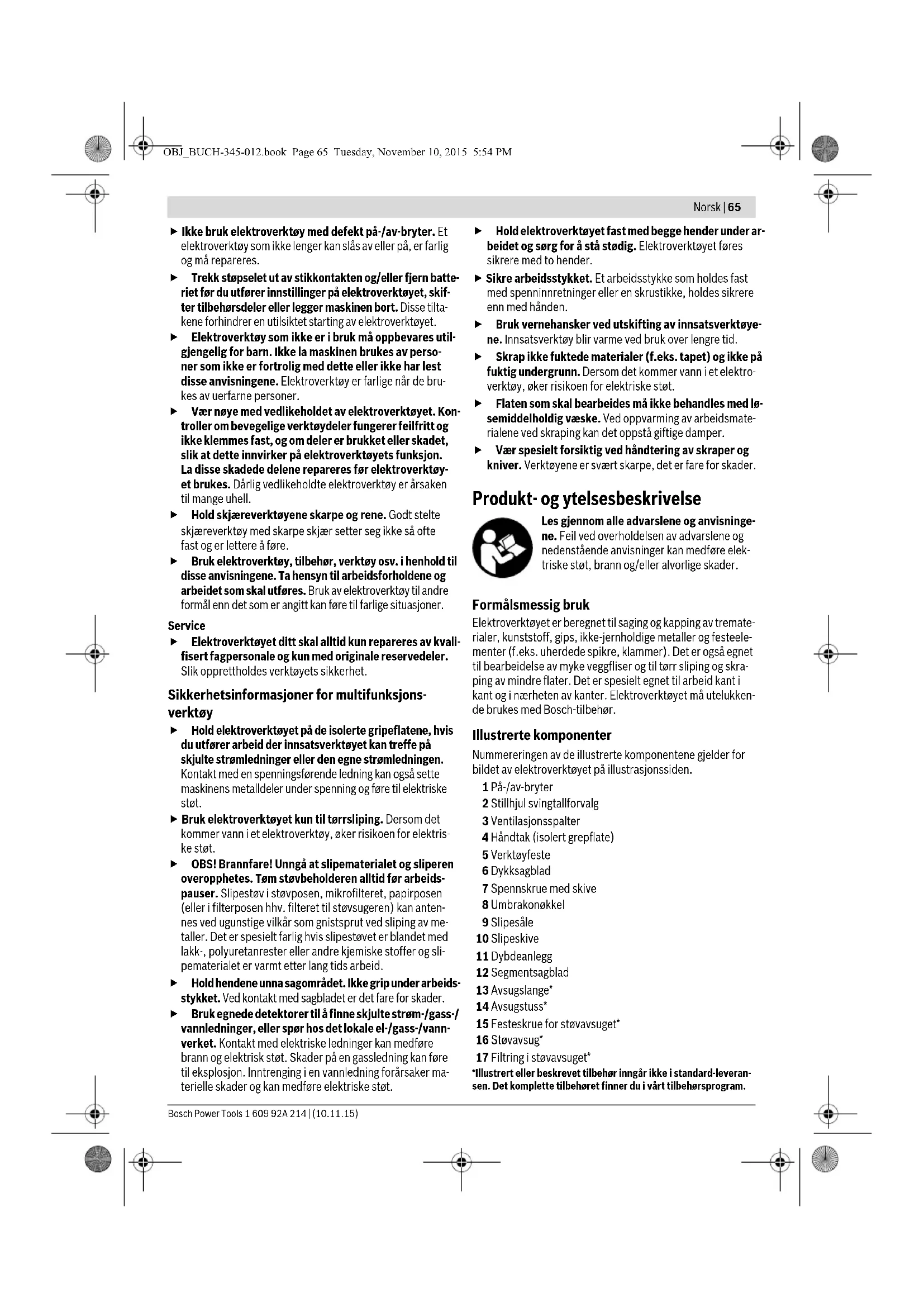 rmed kan du kontrollere elektroverk- tøyet bedre i uventede situasjoner. Bruk alltid egnede klær. Ikke bruk vide klær eller smyk- ker. Hold hår, tøy og hansker unna deler som beveger seg. Løstsittende tøy, smykker eller langt hår kan komme inn i deler som beveger seg. Hvis det kan monteres støvavsug- og oppsamlingsinn- retninger, må du forvisse deg om at disse er tilkoblet og brukes på korrekt måte. Bruk av et støvavsug reduserer farer på grunn av støv. Omhyggelig bruk og håndtering av elektroverktøy Ikke overbelast verktøyet. Bruk et elektroverktøy som er beregnet til den type arbeid du vil utføre. Med et pas- sende elektroverktøy arbeider du bedre og sikrere i det an- gitte effektområdet. ADVARSEL OBJ_BUCH-345-012.book Page 64 Tuesday, November 10, 2015 5:54 PMNorsk | 65 Bosch Power Tools 1 609 92A 214 | (10.11.15) Ikke bruk elektroverktøy med defekt på-/av-bryter. Et elektroverktøy som ikke lenger kan slås av eller på, er farlig og må repareres. Trekk støpselet ut av stikkontakten og/eller fjern batte- riet før du utfører innstillinger på elektroverktøyet, skif- ter tilbehørsdeler eller legger maskinen bort. Disse tilta- kene forhindrer en utilsiktet starting av elektroverktøyet. Elektroverktøy som ikke er i bruk må oppbevares util- gjengelig for barn. Ikke la maskinen brukes av perso- ner som ikke er fortrolig med dette eller ikke har lest disse anvisningene. Elektroverktøy er farlige når de bru- kes av uerfarne personer. Vær nøye med vedlikeholdet av elektroverktøyet. Kon- troller om bevegelige verktøydeler fungerer feilfritt og ikke klemmes fast, og om deler er brukket eller skadet, slik at dette innvirker på elektroverktøyets funksjon. La disse skadede delene repareres før elektroverktøy- et brukes. Dårlig vedlikeholdte elektroverktøy er årsaken til mange uhell. Hold skjæreverktøyene skarpe og rene. Godt stelte skjæreverktøy med skarpe skjær setter seg ikke så ofte fast og er lettere å føre. Bruk elektroverktøy, tilbehør, verktøy osv. i henhold til disse anvisningene. Ta hensyn til arbeidsforholdene og arbeidet som skal utføres. Bruk av elektroverktøy til andre formål enn det som er angitt kan føre til farlige situasjoner. Service Elektroverktøyet ditt skal alltid kun repareres av kvali- fisert fagpersonale og kun med originale reservedeler. Slik opprettholdes verktøyets sikkerhet. Sikkerhetsinformasjoner for multifunksjons- verktøy Hold elektroverktøyet på de isolerte gripeflatene, hvis du utfører arbeid der innsatsverktøyet kan treffe på skjulte strømledninger eller den egne strømledningen. Kontakt med en spenningsførende ledning kan også sette maskinens metalldeler under spenning og føre til elektriske støt. Bruk elektroverktøyet kun til tørrsliping. Dersom det kommer vann i et elektroverktøy, øker risikoen for elektris- ke støt. OBS! Brannfare! Unngå at slipematerialet og sliperen overopphetes. Tøm støvbeholderen alltid før arbeids- pauser. Slipestøv i støvposen, mikrofilteret, papirposen (eller i filterposen hhv. filteret til støvsugeren) kan anten- nes ved ugunstige vilkår som gnistsprut ved sliping av me- taller. Det er spesielt farlig hvis slipestøvet er blandet med lakk-, polyuretanrester eller andre kjemiske stoffer og sli- pematerialet er varmt etter lang tids arbeid. Hold hendene unna sagområdet. Ikke grip under arbeids- stykket. Ved kontakt med sagbladet er det fare for skader. Bruk egnede detektorer til å finne skjulte strøm-/gass-/ vannledninger, eller spør hos det lokale el-/gass-/vann- verket. Kontakt med elektriske ledninger kan medføre brann og elektrisk støt. Skader på en gassledning kan føre til eksplosjon. Inntrenging i en vannledning forårsaker ma- terielle skader og kan medføre elektriske støt. Hold elektroverktøyet fast med begge hender under ar- beidet og sørg for å stå stødig. Elektroverktøyet føres sikrere med to hender. Sikre arbeidsstykket. Et arbeidsstykke som holdes fast med spenninnretninger eller en skrustikke, holdes sikrere enn med hånden. Bruk vernehansker ved utskifting av innsatsverktøye- ne. Innsatsverktøy blir varme ved bruk over lengre tid. Skrap ikke fuktede materialer (f.eks. tapet) og ikke på fuktig undergrunn. Dersom det kommer vann i et elektro- verktøy, øker risikoen for elektriske støt. Flaten som skal bearbeides må ikke behandles med lø- semiddelholdig væske. Ved oppvarming av arbeidsmate- rialene ved skraping kan det oppstå giftige damper. Vær spesielt forsiktig ved håndtering av skraper og kniver. Verktøyene er svært skarpe, det er fare for skader. Produkt- og ytelsesbeskrivelse Les gjennom alle advarslene og anvisninge- ne. Feil ved overholdelsen av advarslene og nedenstående anvisninger kan medføre elek- triske støt, brann og/eller alvorlige skader. Formålsmessig bruk Elektroverktøyet er beregnet til saging og kapping av tremate- rialer, kunststoff, gips, ikke-jernholdige metaller og festeele- menter (f.eks. uherdede spikre, klammer). Det er også egnet til bearbeidelse av myke veggfliser og til tørr sliping og skra- ping av mindre flater. Det er spesielt egnet til arbeid kant i kant og i nærheten av kanter. Elektroverktøyet må utelukken- de brukes med Bosch-tilbehør. Illustrerte komponenter Nummereringen av de illustrerte komponentene gjelder for bildet av elektroverktøyet på illustrasjonssiden. 1 På-/av-bryter 2 Stillhjul svingtallforvalg 3 Ventilasjonsspalter 4 Håndtak (isolert grepflate) 5 Verktøyfeste 6 Dykksagblad 7 Spennskrue med skive 8 Umbrakonøkkel 9 Slipesåle 10 Slipeskive 11 Dybdeanlegg 12 Segmentsagblad 13 Avsugslange* 14 Avsugstuss* 15 Festeskrue for støvavsuget* 16 Støvavsug* 17 Filtring i støvavsuget* *Illustrert eller beskrevet tilbehør inngår ikke i standard-leveran- sen. Det komplette tilbehøret finner du i vårt tilbehørsprogram. OBJ_BUCH-345-012.book Page 65 Tuesday, November 10, 2015 5:54 PM66 | Norsk 1 609 92A 214 | (10.11.15) Bosch Power Tools Tekniske data