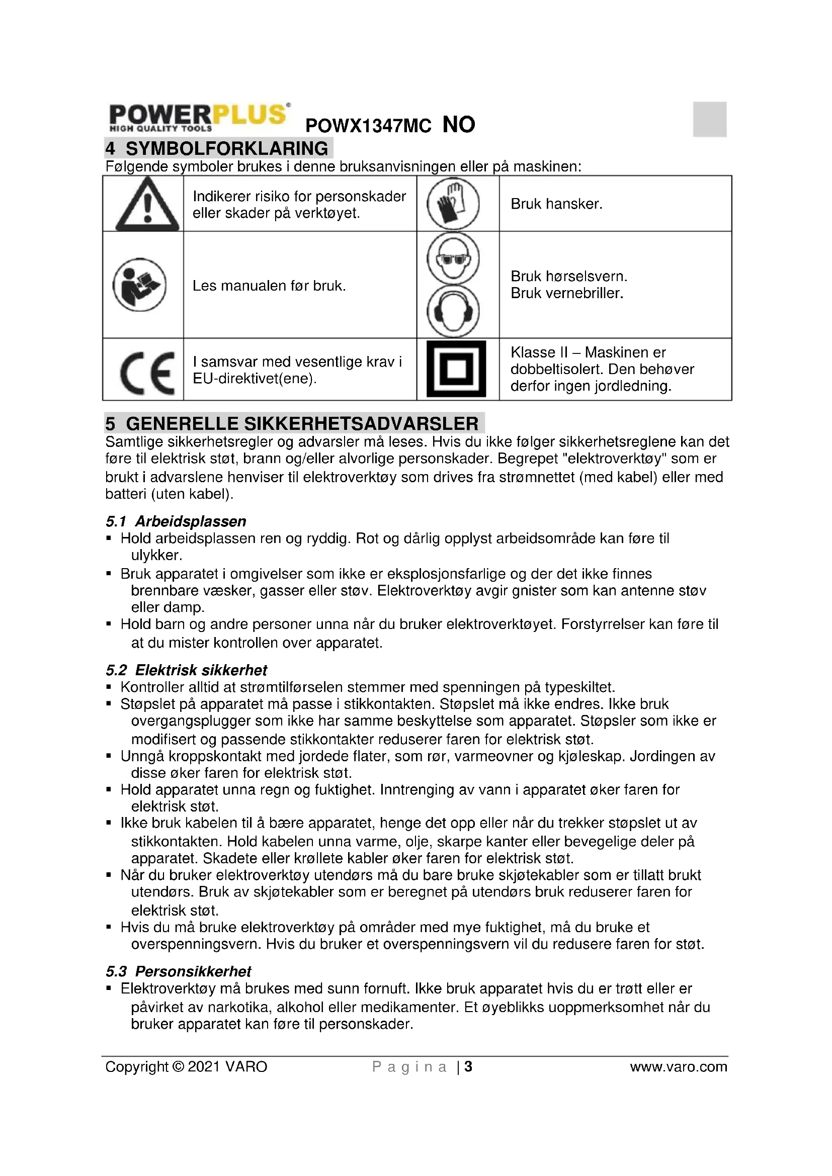 Trekk støpslet ut av stikkontakten før du utfører noe arbeid på maskinen. Hold ventilasjonssporene på maskinen rene for å unngå at motoren overopphetes. Rengjør maskinhuset regelmessig jevnlig med en myk klut, helst etter hver gangs bruk. Sørg for at ventilasjonssporene er fri for støv og skitt. Gjenstridig skitt fjernes med en myk klut som er fuktet med såpevann. Bruk ikke løsemidler som bensin, alkohol, ammoniakk osv. Slike stoffer skader kunststoffdelene. Pass på at det ikke kommer vann inn i et elektrisk verktøy.POWX1347MC NO Copyright © 2021 VARO P a g i n a | 8 www.varo.com 10 TEKNISKE DATA Modellnr. POWX1347MC Spenning 220-240 V Nettfrekvens 50 Hz Effekt 300 W Turtall uten belastning 15 000-22 000 min-1 11 STØY Støyemisjonsverdier målt i samsvar med relevant standard. (K=3) Lydtrykknivå LpA 81 dB(A) Lydeffektnivå LwA 92 dB(A) VIKTIG! Bruk hørselsvern når lydtrykket er over 85 dB(A). Vibrasjon aw 3 m/s² K = 1,5 m/s² 12 GARANTI Dette produktet garanteres for en periode på 36 måneder fra datoen produktet ble kjøpt av første bruker. Denne garantien dekker alle material- eller produksjonsfeil, med unntak av: batterier, ladere, vanlige slitasjefeil på deler som lagre, børster, ledninger og plugger eller på tilbehør som bor, borebits, sagblader osv. eller skade eller feil som skyldes misbruk, uhell eller endringer. Garantien dekker heller ikke kostnader ved forsendelse. Skader og/eller defekter som skyldes ukorrekt bruk dekkes heller ikke av garantien. Vi fraskriver oss også alt ansvar for personskader som skyldes ukorrekt bruk av verktøyet. Reparasjoner må utføres ved et autorisert kundeservicesenter for Powerplus verktøy. Du kan alltid få flere opplysninger ved å ringe 00 32 3 292 92 90. Alle transportkostnader skal alltid betales av kunden, med mindre noe annet er skriftlig avtalt. Garantien dekker ikke skader som skyldes manglende vedlikehold eller overbelastning. Garantien dekker bestemt ikke skader som skyldes inntrenging av væsker, inntrenging av mye støv, overlagt skade (med hensikt eller ved grov uaktsomhet), feilaktig bruk (bruk til noe produktet ikke er beregnet på), ikke-kompetent bruk (for eksempel ved at anvisningene i håndboken ignoreres), feilaktig montering, lynnedslag eller feil nettspenning. Denne listen er ikke begrensende. Garantikrav som aksepteres vil aldri føre til en forlengelse av garantiperioden. Heller ikke vil en ny garantiperiode starte dersom produktet erstattes. Produkter eller deler som erstattes under garantien, tilfaller Varo NV. Vi forbeholder oss retten til å avvise ethvert krav der kjøpet ikke kan verifiseres, eller når det er åpenbart at produktet ikke har blitt korrekt vedlikeholdt (rene ventilasjonsåpninger, kullbørster skiftet regelmessig, osv.). Du må ta vare på kvitteringen som bevis på datoen for kjøpet. Verktøyet må returneres til din forhandler (uten demontering) i en akseptabel, ren tilstand (i originalemballasjen), sammen med kvittering på kjøpet. 13 MILJØ Hvis det skulle være nødvendig å skifte ut maskinen etter lang tids bruk, må den ikke kastes i husholdningsavfallet. Kast den på en miljømessig forsvarlig måte. Avfall produsert av elektriske maskiner bør ikke bli behandlet som normalt husholdningsavfall. Sørg for å resirkulere der hvor spesialanlegg eksisterer. Be lokale myndigheter eller forhandler om råd angående tømming og resirkulering.POWX1347MC NO Copyright © 2021 VARO P a g i n a | 9 www.varo.com 14 SAMSVARSERKLÆRING VARO N.V. –- Vic. Van Rompuy N.V. Joseph Van Instraat 9 – BE2500 Lier – Belgia, erklærer at, Produkt: Multiverktøy Merke: POWERplus Modell: POWX1347MC oppfyller de vesentlige kravene og andre relevante bestemmelser i gjeldende EU-direktiver, basert på bruken av europeiske, harmoniserte standarder. Enhver uautorisert endring av apparatet vil annullere denne erklæringen. EU-Direktiver (med eventuelle endringer inntil dato for underskrift): 2011/65/EU 2006/42/EC 2014/30/EU Europeiske harmoniserte standarder (med eventuelle endringer inntil dato for underskrift): EN62841-1 : 2015 EN62841-2-4 : 2014 EN55014-1 : 2017 EN55014-2 : 2015 EN61000-3-2 : 2014 EN61000-3-3 : 2013 Oppbevarer av teknisk dokumentasjon: Philippe Vankerkhove, VARO – Vic. Van Rompuy N.V. Undertegnede handler på vegne av selskapets CEO, Ludo Mertens Regulatoriske saker - Samsvarsleder 10/03/2021, Lier - BelgiumPOWX1347MC DA Copyright © 2021 VARO S i d e | 1 www.varo.com 1 ANVENDELSE ................................................................................ 2