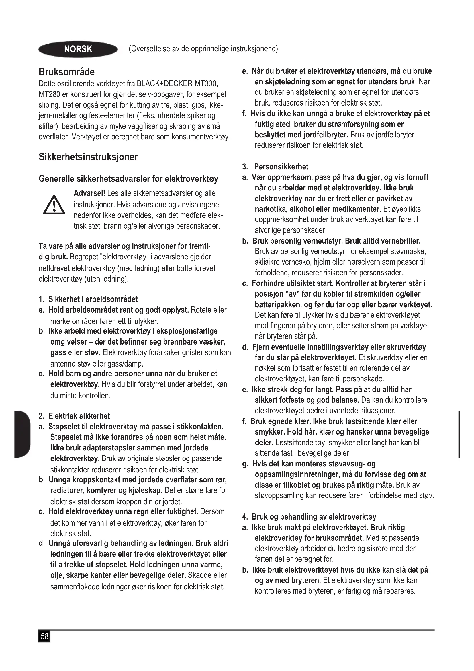 verktøyfritt tilbe- hørsfeste. Bruk Advarsel! La verktøyet arbeide med sin egen hastighet. Ikke overbelast det. Advarsel! Før du kutter i vegger, gulv eller tak, må du kon- trollere plasseringen av kabler og rør. Hastighetskontroll (gur G) Med hastighetskontrollen kan du tilpasse verktøyets hastighet til oppgaven. u Sett hastighetskontrollen (2) på ønsket innstilling. Ved innstilling 1 fungerer verktøyet med lav hastighet, 10 000 min-1. Ved innstilling 6 fungerer verktøyet med maksimal hastighet, 22 000 min-1. Slå på og av (gur H) u Når du skal slå verktøyet på, skyver du på/av-bryteren (1) fremover (posisjon I).62 (Oversettelse av de opprinnelige instruksjonene) NORSK u Når du skal slå verktøyet av, skyver du på/av-bryteren (1) bakover (posisjon O). Råd for optimal bruk u Hold alltid verktøyet sikkert. Ved presisjonsarbeid holdes verktøyet nær fronten. u Klem fast verktøyet når det er mulig, særlig ved bruk av kutteblader. u Ikke trykk for hardt på verktøyet. u Bruk alltid tilbehør som egner seg for arbeidsstykkets materiale og typen kutt. u Kontroller tilstanden til tilbehøret regelmessig. Bytt etter behov. u Merk det ønskede startpunktet. u Slå på verktøyet, og før tilbehøret langsomt inn i ar- beidsstykket ved det ønskede startpunktet. u Klem fast et stykke ner eller bløtt tre på baksiden av arbeidsstykket, og sag gjennom kombinasjonen for å få et rent kutt. u Ikke tving skjærebladet inn i arbeidsstykket. Legg merke til at det normalt vil ta lengre tid å kutte metallplater enn tykke trestykker. u Når du kutter metall, legger du en tynn oljelm langs kut- telinjen før kutting. u Når du skal slipe nye malingsstrøk før du skal male et nytt strøk, bruker du ekstra nkornet slipepapir. u På veldig ujevne overater, eller når du skal fjerne ere lag med maling, begynner du med et grovere slipepapir. På andre overater begynner du med et middels grovkor- net slipepapir. I begge tilfeller bytter du gradvis til mer nkornet slipepapir for å få en glattere overate. u Kontakt forhandleren for å få mer informasjon om tilgjengelig tilbehør. Vedlikehold Det nettdrevne/batteridrevne BLACK+DECKER-apparatet/ verktøyet er konstruert for å være i drift over lengre tid med et minimum av vedlikehold. Det er avhengig av riktig stell og regelmessig rengjøring for å fungere som det skal til enhver tid. Advarsel! Før du utfører vedlikehold på nettdrevet/batter- idrevet elektroverktøy: u Slå av apparatet/verktøyet og trekk ut støpselet. u Eller slå av apparatet/verktøyet og fjern batteriet fra dette hvis apparatet/verktøyet har separat batteripakke. u Eller la batteriet gå helt tomt hvis det er innebygd, og slå deretter av. u Rengjør ventilasjonsåpningene i apparatet/verktøyet/ laderen jevnlig med en myk børste eller tørr klut. u Rengjør motorhuset regelmessig med en fuktig klut. Ikke bruk slipende eller løsemiddelbaserte rengjøringsmidler. Bytte nettstøpsel (gjelder bare Storbritannia og Irland) Hvis ny nettplugg må settes på: u Kast det gamle støpselet på en trygg måte. u Koble den brune ledningen til den strømførende termina- len i det nye støpselet. u Koble den blå ledningen til den nøytrale terminalen. Advarsel! Du skal ikke koble til jordterminalen. Følg monter- ingsinstruksjonene som følger med støpsler av god kvalitet. Anbefalt sikring: 5 A. Miljø