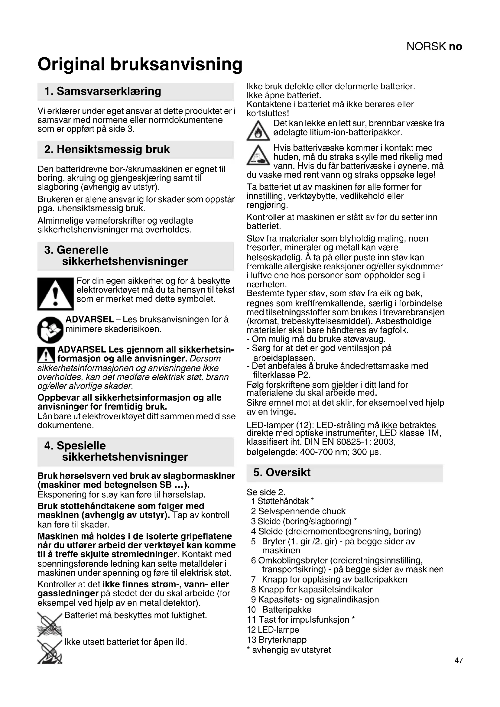 Original bruksanvisning Vi erklærer under eget ansvar at dette produktet er i samsvar med normene eller normdokumentene som er oppført på side 3. Den batteridrevne bor-/skrumaskinen er egnet til boring, skruing og gjengeskjæring samt til slagboring (avhengig av utstyr). Brukeren er alene ansvarlig for skader som oppstår pga. uhensiktsmessig bruk. Alminnelige verneforskrifter og vedlagte sikkerhetshenvisninger må overholdes. For din egen sikkerhet og for å beskytte elektroverktøyet må du ta hensyn til tekst som er merket med dette symbolet. ADVARSEL – Les bruksanvisningen for å minimere skaderisikoen. ADVARSEL Les gjennom all sikkerhetsin- formasjon og alle anvisninger. Dersom sikkerhetsinformasjonen og anvisningene ikke overholdes, kan det medføre elektrisk støt, brann og/eller alvorlige skader. Oppbevar all sikkerhetsinformasjon og alle anvisninger for fremtidig bruk. Lån bare ut elektroverktøyet ditt sammen med disse dokumentene. Bruk hørselsvern ved bruk av slagbormaskiner (maskiner med betegnelsen SB …). Eksponering for støy kan føre til hørselstap. Bruk støttehåndtakene som følger med maskinen (avhengig av utstyr). Tap av kontroll kan føre til skader. Maskinen må holdes i de isolerte gripeflatene når du utfører arbeid der verktøyet kan komme til å treffe skjulte strømledninger. Kontakt med spenningsførende ledning kan sette metalldeler i maskinen under spenning og føre til elektrisk støt. Kontroller at det ikke finnes strøm-, vann- eller gassledninger på stedet der du skal arbeide (for eksempel ved hjelp av en metalldetektor). Batteriet må beskyttes mot fuktighet. Ikke utsett batteriet for åpen ild. Ikke bruk defekte eller deformerte batterier. Ikke åpne batteriet. Kontaktene i batteriet må ikke berøres eller kortsluttes! Det kan lekke en lett sur, brennbar væske fra ødelagte litium-ion-batteripakker. Hvis batterivæske kommer i kontakt med huden, må du straks skylle med rikelig med vann. Hvis du får batterivæske i øynene, må du vaske med rent vann og straks oppsøke lege! Ta batteriet ut av maskinen før alle former for innstilling, verktøybytte, vedlikehold eller rengjøring. Kontroller at maskinen er slått av før du setter inn batteriet. Støv fra materialer som blyholdig maling, noen tresorter, mineraler og metall kan være helseskadelig. Å ta på eller puste inn støv kan fremkalle allergiske reaksjoner og/eller sykdommer i luftveiene hos personer som oppholder seg i nærheten. Bestemte typer støv, som støv fra eik og bøk, regnes som kreftfremkallende, særlig i forbindelse med tilsetningsstoffer som brukes i trevarebransjen (kromat, trebeskyttelsesmiddel). Asbestholdige materialer skal bare håndteres av fagfolk. - Om mulig må du bruke støvavsug. - Sørg for at det er god ventilasjon på arbeidsplassen. - Det anbefales å bruke åndedrettsmaske med filterklasse P2. Følg forskriftene som gjelder i ditt land for materialene du skal arbeide med. Sikre emnet mot at det sklir, for eksempel ved hjelp av en tvinge. LED-lamper (12): LED-stråling må ikke betraktes direkte med optiske instrumenter, LED klasse 1M, klassifisert iht. DIN EN 60825-1: 2003, bølgelengde: 400-700 nm; 300 µs. Se side 2. 1 Støttehåndtak * 2 Selvspennende chuck 3 Sleide (boring/slagboring) * 4 Sleide (dreiemomentbegrensning, boring)