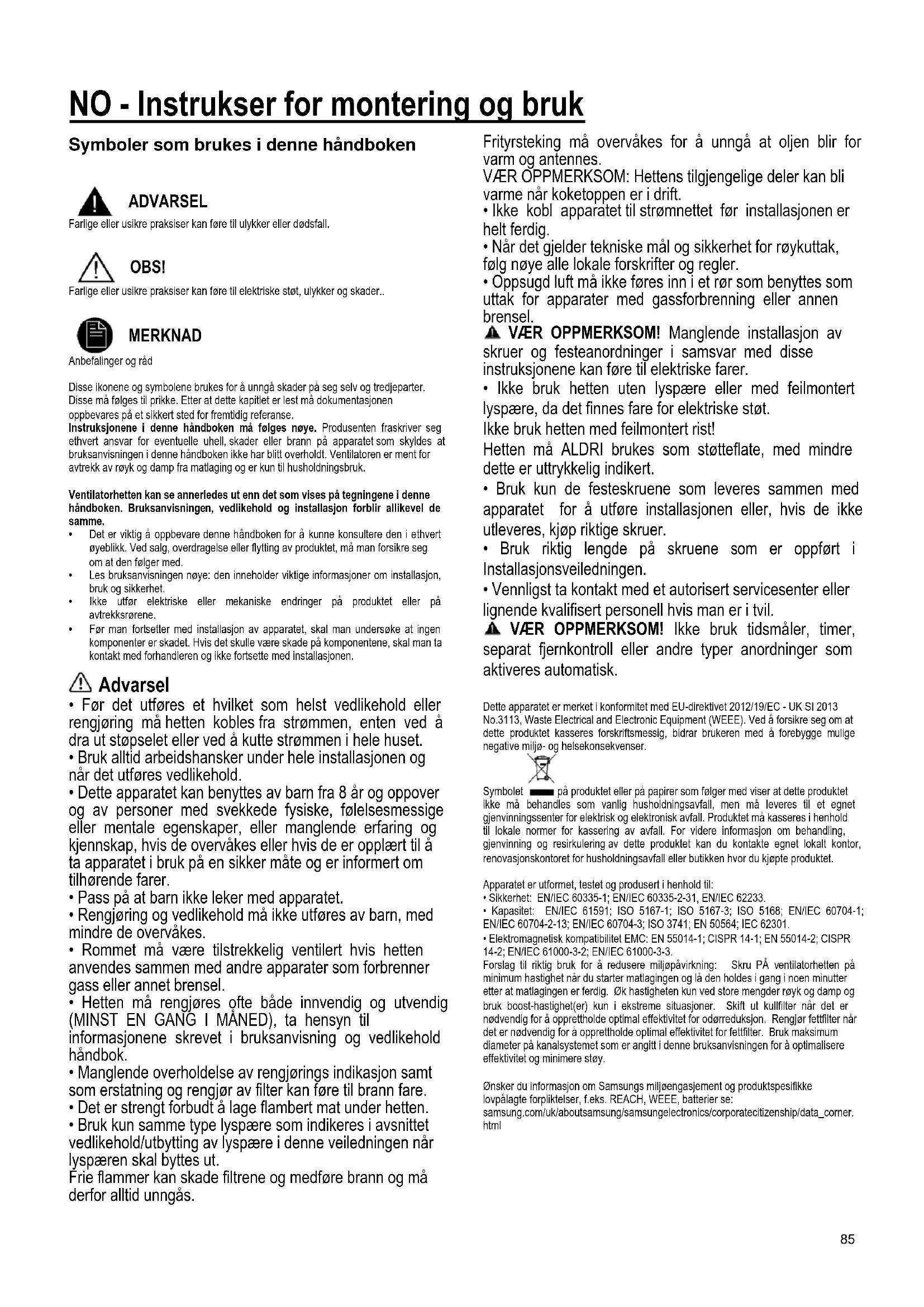 - Elektromagnetisk kompatibilitet EMC: EN 55014-1; CISPR 14-1; EN 55014-2; CISPR 14-2; EN/IEC 61000-3-2; EN/IEC 61000-3-3. Forslag til riktig bruk for å redusere miljøpåvirkning: Skru PÅ ventilatorhetten på minimum hastighet når du starter matlagingen og lå den holdes i gang i noen minutter etter at matlagingen er ferdig. Øk hastigheten kun ved store mengder røyk og damp og bruk boost-hastighet(er) kun i ekstreme situasjoner. Skift ut kullfilter når det er nødvendig for å opprettholde optimal effektivitet for odørreduksjon. Rengjør fettfilter når det er nødvendig for å opprettholde optimal effektivitet for fettfilter. Bruk maksimum diameter på kanalsystemet som er angitt i denne bruksanvisningen for å optimalisere effektivitet og minimere støy. Ønsker du informasjon om Samsungs miljøengasjement og produktspesifikke lovpålagte forpliktelser, f.eks. REACH, WEEE, batterier se: samsung.com/uk/aboutsamsung/samsungelectronics/corporatecitizenship/data_corner. html86 Bruksmåte Ventilatoren er ment for avtrekk av røyk og damp fra matlaging og er kun til husholdningsbruk. Ventilatorhetten er laget for å brukes med direkte avtrekk der avtrekksluften føres ut i friluft, eller med resirkulering av avtrekksluften. Avtrekksversjon Dampene føres ut i friluft gjennom et avløpsrør som er festet til koblingsflensen. MERK! Avløpsrøret er ikke medlevert, men må kjøpes separat. Diameteren i avløpsrøret må tilsvare diameteren på tilslutningsringen. MERK! Hvis ventilatoren er utstyrt med kullfiltre, må disse fjernes. Koble ventilatoren til rør og avtrekksåpning i veggen med en diameter tilsvarende luftuttaket (koblingsflensen). Bruk av rør og avtrekksåpning på veggen med en mindre diameter, vil medføre en minsking i avtrekksytelsene og en drastisk økning av støyen. Ethvert ansvar gjeldende dette fraskrives derfor. ! Bruk et så kort rør som mulig. ! Bruk et rør med færrest mulig vinkler (vinkelen må aldri være skarpere enn 90°). ! Unngå drastiske endringer i rørets tverrsnitt. Filterversjon Luften som suges opp blir renset, og fett og lukter fjernes før den føres tilbake i rommet. Hvis man vil bruke ventilatoren i denne versjonen, er det nødvendig å installere et ekstra filtersystem basert på aktivt kull.