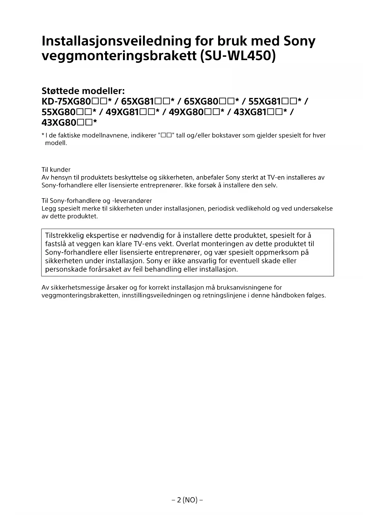 - I de faktiske modellnavnene, indikerer "" tall og/eller bokstaver som gjelder spesielt for hver modell. Til kunder Av hensyn til produktets beskyttelse og sikkerheten, anbefaler Sony sterkt at TV-en installeres av Sony-forhandlere eller lisensierte entreprenører. Ikke forsøk å installere den selv. Til Sony-forhandlere og -leverandører Legg spesielt merke til sikkerheten under installasjonen, periodisk vedlikehold og ved undersøkelse av dette produktet. Tilstrekkelig ekspertise er nødvendig for å installere dette produktet, spesielt for å fastslå at veggen kan klare TV-ens vekt. Overlat monteringen av dette produktet til Sony-forhandlere eller lisensierte entreprenører, og vær spesielt oppmerksom på sikkerheten under installasjon. Sony er ikke ansvarlig for eventuell skade eller personskade forårsaket av feil behandling eller installasjon. Av sikkerhetsmessige årsaker og for korrekt installasjon må bruksanvisningene for veggmonteringsbraketten, innstillingsveiledningen og retningslinjene i denne håndboken følges.− 3 (NO) −