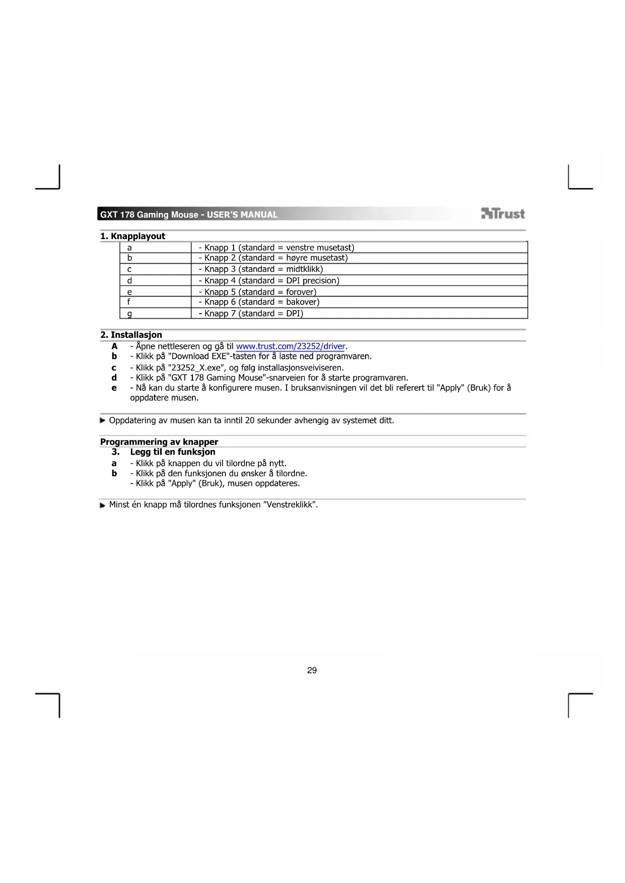 - Åpne nettleseren og gå til www.trust.com/23252/driver. - Klikk på "Download EXE"-tasten for å laste ned programvaren. - Klikk på "23252_X.exe", og følg installasjonsveiviseren. - Klikk på "GXT 178 Gaming Mouse"-snarveien for å starte programvaren. - Nå kan du starte å konfigurere musen. I bruksanvisningen vil det bli referert til "Apply" (Bruk) for å oppdatere musen. Oppdatering av musen kan ta inntil 20 sekunder avhengig av systemet ditt. Programmering av knapper