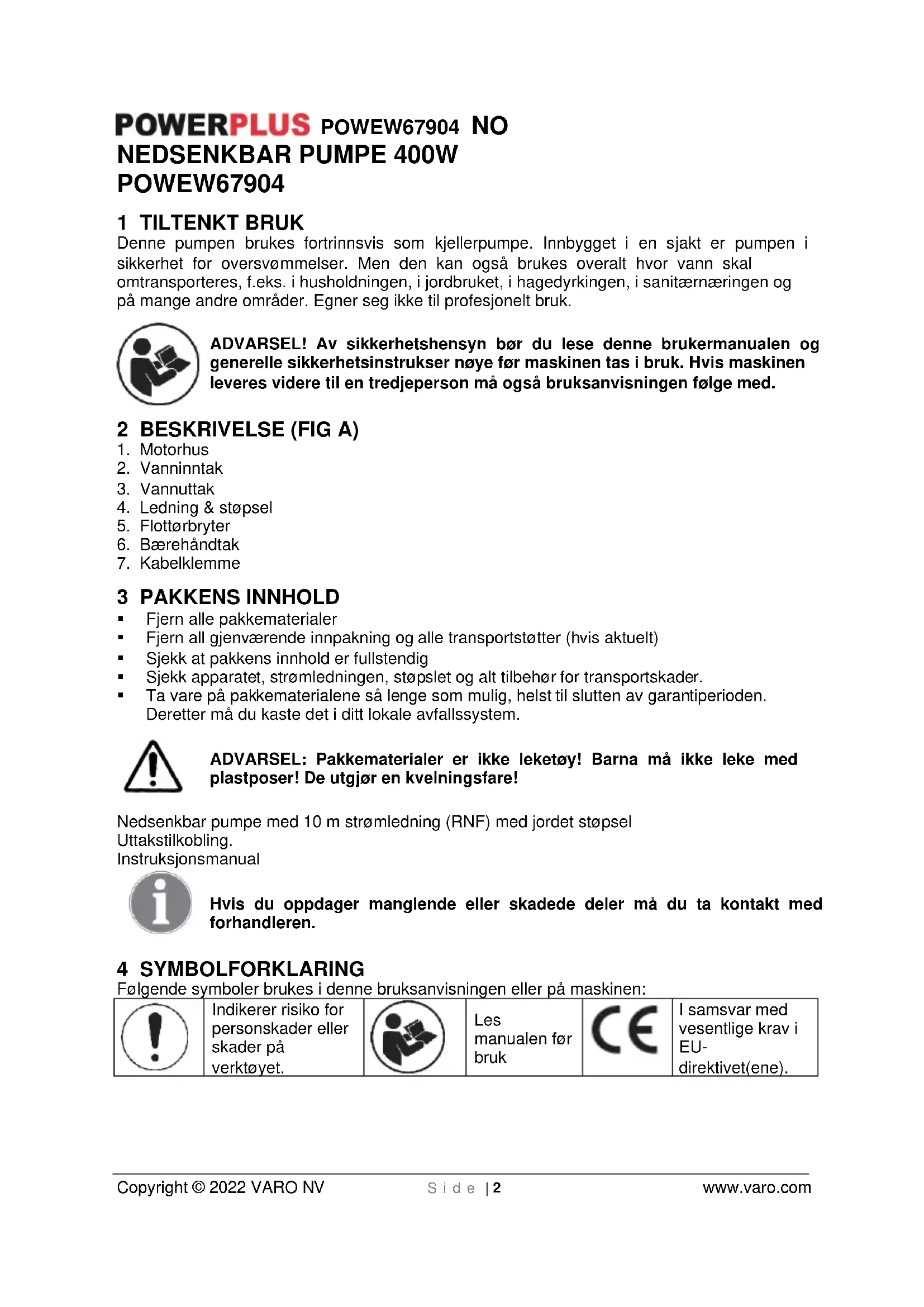 OBS! Trekk støpslet ut av stikkontakten før du utfører noe arbeid på maskinen. Bruk ikke løsemidler som bensin, alkohol, ammoniakk osv. Slike stoffer skader kunststoffdelene. Vedlikeholdsanvisninger! Dykkermotorpumpen er et vedlikeholdsfritt og gjennomprøvet produkt, som er utsatt for streng sluttkontroll. For at den skal få lang levetid og ubrutt drift anbefales likevel en regelmessig kontroll og vedlikehold.POWEW67904 NO Copyright © 2022 VARO NV S i d e | 5 www.varo.com Advarsel! Viktig! Før ethvert vedlikeholdsarbeid påbegynnes må stikkontakten dras ut.