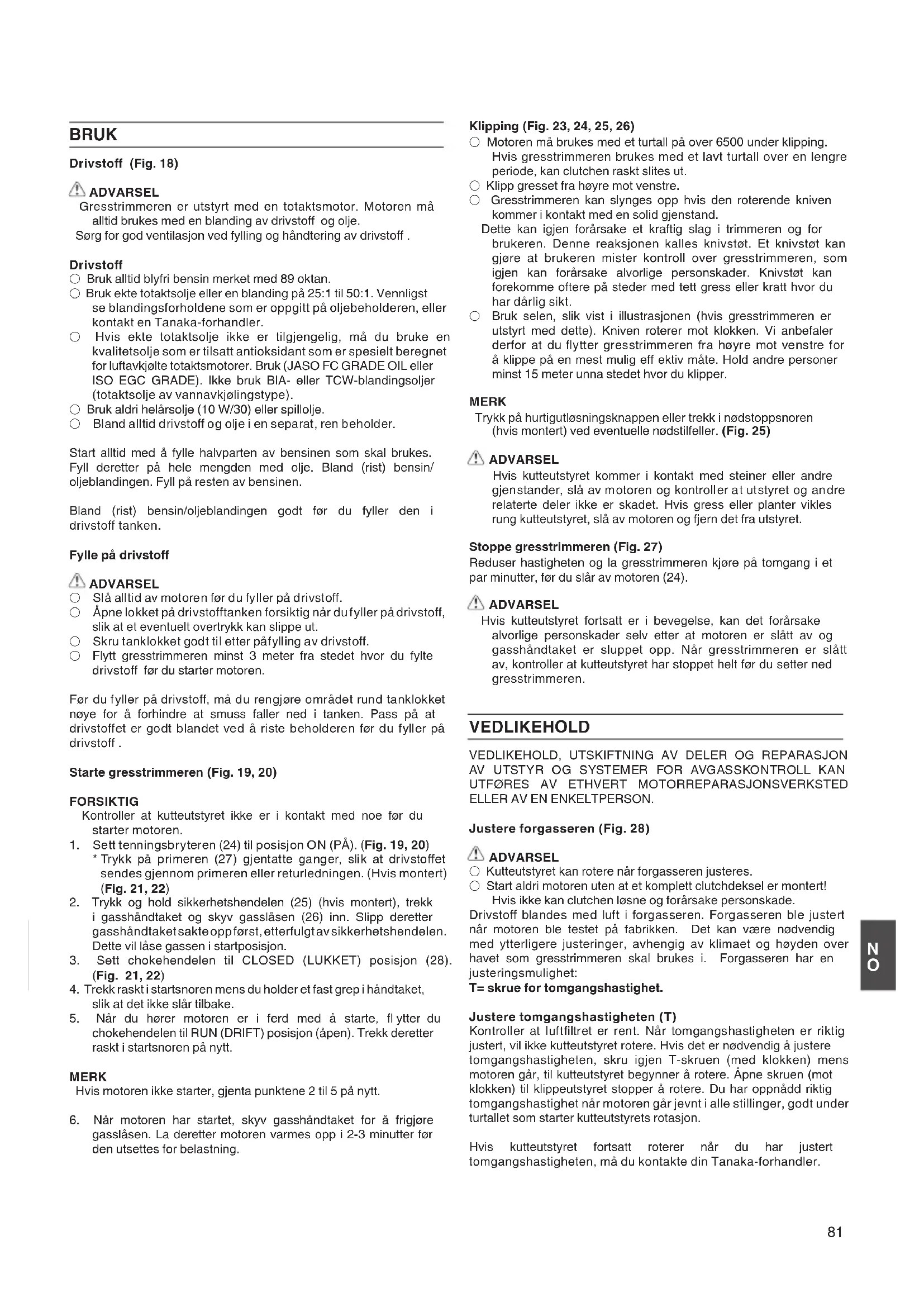 gasslåsen. La deretter motoren varmes opp i 2-3 minutter før den utsettes for belastning. Klipping (Fig. 23, 24, 25, 26) ○ Motoren må brukes med et turtall på over 6500 under klipping. Hvis gresstrimmeren brukes med et lavt turtall over en lengre periode, kan clutchen raskt slites ut. ○ Klipp gresset fra høyre mot venstre. ○ Gresstrimmeren kan slynges opp hvis den roterende kniven kommer i kontakt med en solid gjenstand. Dette kan igjen forårsake et kraftig slag i trimmeren og for brukeren. Denne reaksjonen kalles knivstøt. Et knivstøt kan gjøre at brukeren mister kontroll over gresstrimmeren, som igjen kan forårsake alvorlige personskader. Knivstøt kan forekomme oftere på steder med tett gress eller kratt hvor du har dårlig sikt. ○ Bruk selen, slik vist i illustrasjonen (hvis gresstrimmeren er utstyrt med dette). Kniven roterer mot klokken. Vi anbefaler derfor at du fl ytter gresstrimmeren fra høyre mot venstre for å klippe på en mest mulig eff ektiv måte. Hold andre personer minst 15 meter unna stedet hvor du klipper. MERK Trykk på hurtigutløsningsknappen eller trekk i nødstoppsnoren (hvis montert) ved eventuelle nødstilfeller. (Fig. 25) ADVARSEL Hvis kutteutstyret kommer i kontakt med steiner eller andre gjenstander, slå av motoren og kontroller at utstyret og andre relaterte deler ikke er skadet. Hvis gress eller planter vikles rung kutteutstyret, slå av motoren og fjern det fra utstyret. Stoppe gresstrimmeren (Fig. 27) Reduser hastigheten og la gresstrimmeren kjøre på tomgang i et par minutter, før du slår av motoren (24). ADVARSEL Hvis kutteutstyret fortsatt er i bevegelse, kan det forårsake alvorlige personskader selv etter at motoren er slått av og gasshåndtaket er sluppet opp. Når gresstrimmeren er slått av, kontroller at kutteutstyret har stoppet helt før du setter ned gresstrimmeren. VEDLIKEHOLD