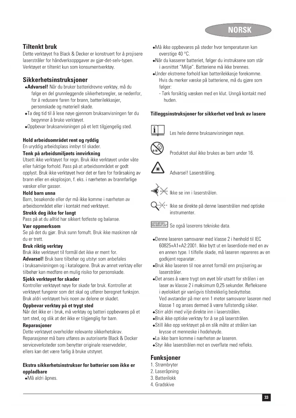 Last ned instruksjonene for din Avstandsmåler i PDF-format gratis! Finn veiledningen din BDL100P - BLACK & DECKER og ta den elektroniske enheten tilbake i hendene. På denne siden er alle dokumenter som er nødvendige for bruken av enheten din publisert. BDL100P av merket BLACK & DECKER.