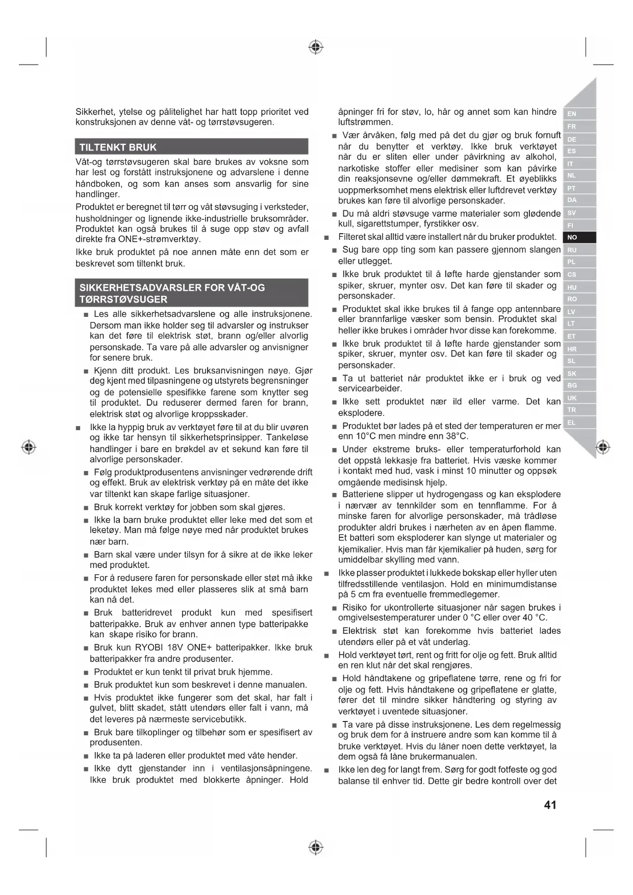 ■ Les alle sikkerhetsadvarslene og alle instruksjonene. Dersom man ikke holder seg til advarsler og instrukser kan det føre til elektrisk støt, brann og/eller alvorlig personskade. Ta vare på alle advarsler og anvisnigner for senere bruk. ■ Kjenn ditt produkt. Les bruksanvisningen nøye. Gjør deg kjent med tilpasningene og utstyrets begrensninger og de potensielle spesifikke farene som knytter seg til produktet. Du reduserer dermed faren for brann, elektrisk støt og alvorlige kroppsskader. ■ Ikke la hyppig bruk av verktøyet føre til at du blir uvøren og ikke tar hensyn til sikkerhetsprinsipper. Tankeløse handlinger i bare en brøkdel av et sekund kan føre til alvorlige personskader. ■ Følg produktprodusentens anvisninger vedrørende drift og effekt. Bruk av elektrisk verktøy på en måte det ikke var tiltenkt kan skape farlige situasjoner. ■ Bruk korrekt verktøy for jobben som skal gjøres. ■ Ikke la barn bruke produktet eller leke med det som et leketøy. Man må følge nøye med når produktet brukes nær barn. ■ Barn skal være under tilsyn for å sikre at de ikke leker med produktet. ■ For å redusere faren for personskade eller støt må ikke produktet lekes med eller plasseres slik at små barn kan nå det. ■ Bruk batteridrevet produkt kun med spesifisert batteripakke. Bruk av enhver annen type batteripakke kan skape risiko for brann. ■ Bruk kun RYOBI 18V ONE+ batteripakker. Ikke bruk batteripakker fra andre produsenter. ■ Produktet er kun tenkt til privat bruk hjemme. ■ Bruk produktet kun som beskrevet i denne manualen. ■ Hvis produktet ikke fungerer som det skal, har falt i gulvet, blitt skadet, stått utendørs eller falt i vann, må det leveres på nærmeste servicebutikk. ■ Bruk bare tilkoplinger og tilbehør som er spesifisert av produsenten. ■ Ikke ta på laderen eller produktet med våte hender. ■ Ikke dytt gjenstander inn i ventilasjonsåpningene. Ikke bruk produktet med blokkerte åpninger. Hold åpninger fri for støv, lo, hår og annet som kan hindre luftstrømmen. ■ Vær årvåken, følg med på det du gjør og bruk fornuft når du benytter et verktøy. Ikke bruk verktøyet når du er sliten eller under påvirkning av alkohol, narkotiske stoffer eller medisiner som kan påvirke din reaksjonsevne og/eller dømmekraft. Et øyeblikks uoppmerksomhet mens elektrisk eller luftdrevet verktøy brukes kan føre til alvorlige personskader. ■ Du må aldri støvsuge varme materialer som glødende kull, sigarettstumper, fyrstikker osv. ■ Filteret skal alltid være installert når du bruker produktet. ■ Sug bare opp ting som kan passere gjennom slangen eller utlegget. ■ Ikke bruk produktet til å løfte harde gjenstander som spiker, skruer, mynter osv. Det kan føre til skader og personskader. ■ Produktet skal ikke brukes til å fange opp antennbare eller brannfarlige væsker som bensin. Produktet skal heller ikke brukes i områder hvor disse kan forekomme. ■ Ikke bruk produktet til å løfte harde gjenstander som spiker, skruer, mynter osv. Det kan føre til skader og personskader. ■ Ta ut batteriet når produktet ikke er i bruk og ved servicearbeider. ■ Ikke sett produktet nær ild eller varme. Det kan eksplodere. ■ Produktet bør lades på et sted der temperaturen er mer enn 10°C men mindre enn 38°C. ■ Under ekstreme bruks- eller temperaturforhold kan det oppstå lekkasje fra batteriet. Hvis væske kommer i kontakt med hud, vask i minst 10 minutter og oppsøk omgående medisinsk hjelp. ■ Batteriene slipper ut hydrogengass og kan eksplodere i nærvær av tennkilder som en tennflamme. For å minske faren for alvorlige personskader, må trådløse produkter aldri brukes i nærheten av en åpen flamme. Et batteri som eksploderer kan slynge ut materialer og kjemikalier. Hvis man får kjemikalier på huden, sørg for umiddelbar skylling med vann. ■ Ikke plasser produktet i lukkede bokskap eller hyller uten tilfredsstillende ventilasjon. Hold en minimumdistanse på 5 cm fra eventuelle fremmedlegemer. ■ Risiko for ukontrollerte situasjoner når sagen brukes i omgivelsestemperaturer under 0 °C eller over 40 °C. ■ Elektrisk støt kan forekomme hvis batteriet lades utendørs eller på et våt underlag. ■ Hold verktøyet tørt, rent og fritt for olje og fett. Bruk alltid en ren klut når det skal rengjøres. ■ Hold håndtakene og gripeflatene tørre, rene og fri for olje og fett. Hvis håndtakene og gripeflatene er glatte, fører det til mindre sikker håndtering og styring av verktøyet i uventede situasjoner. ■ Ta vare på disse instruksjonene. Les dem regelmessig og bruk dem for å instruere andre som kan komme til å bruke verktøyet. Hvis du låner noen dette verktøyet, la dem også få låne brukermanualen. ■ Ikke len deg for langt frem. Sørg for godt fotfeste og god balanse til enhver tid. Dette gir bedre kontroll over det42 | Norsk elektriske verktøyet i en uventet situasjon. Du risikerer å miste balansen hvis du strekker deg for langt, noe som kan føre til at du utsettes for varme overflater. ■ Når produktet repareres må det kun brukes produsentens originale erstatningsdeler, tilbehør og tilkoplinger. Følg instruksjonene i vedlikeholdsseksjonen i denne manualen. Bruk av uautoriserte deler eller ikke- overholdelse av vedlikeholdsanvisningene kan skape en risiko for sjokk eller skade.
