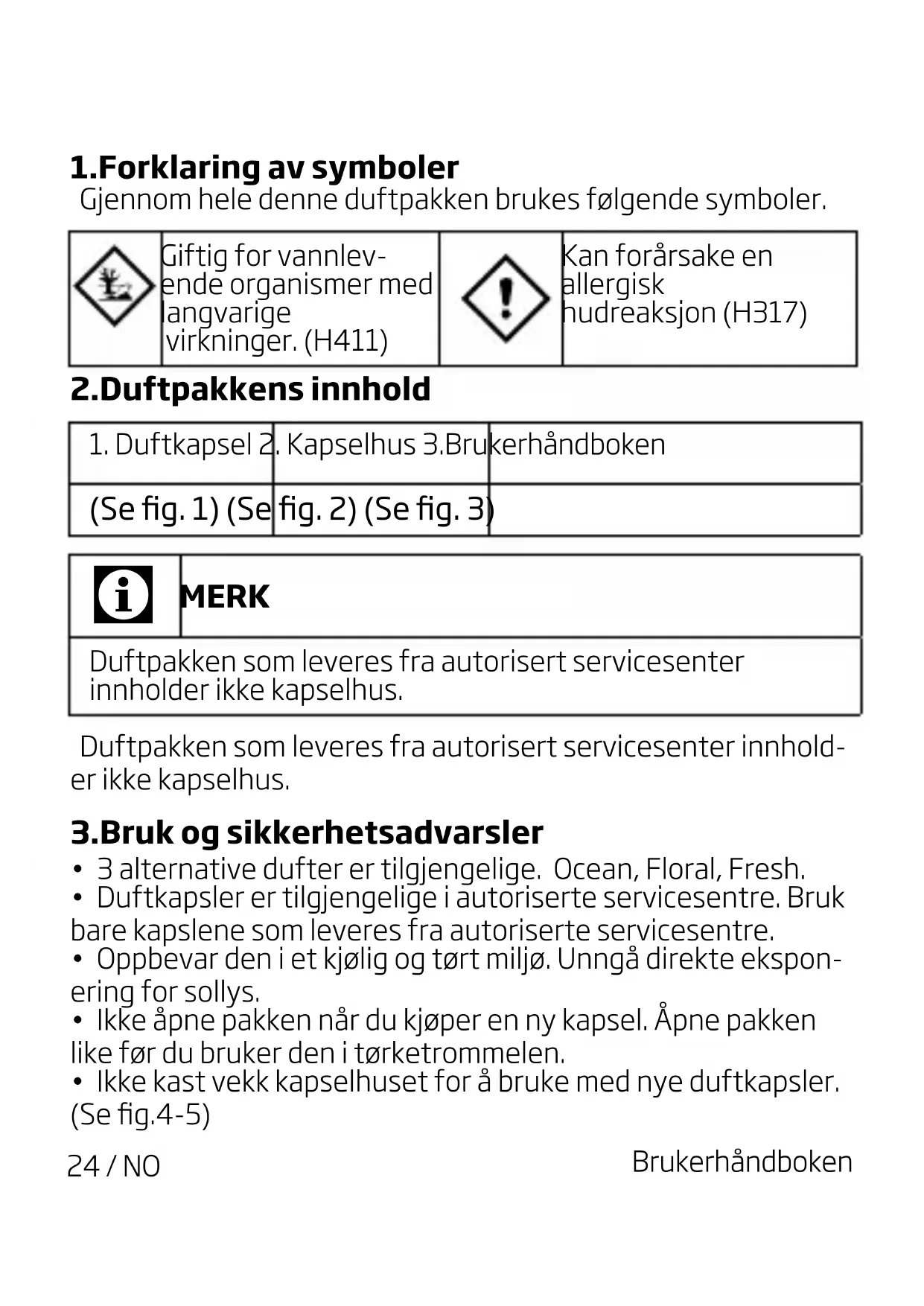 MERK Duftpakken som leveres fra autorisert servicesenter innholder ikke kapselhus. Duftpakken som leveres fra autorisert servicesenter innhold- er ikke kapselhus. 3.Bruk og sikkerhetsadvarsler