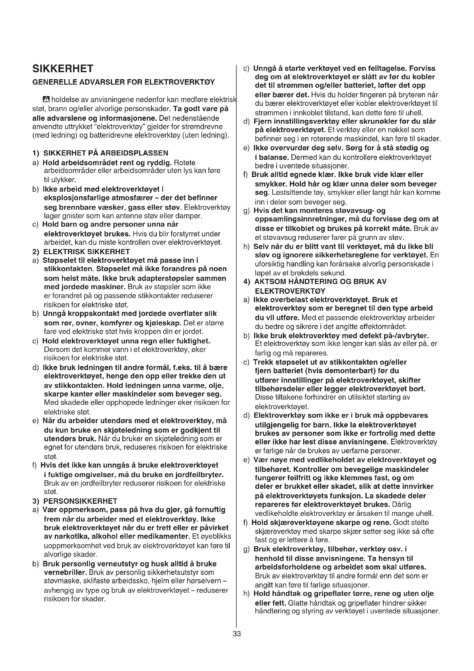A holdelse av anvisingene nedenfor kan medfrole elektrisk stot,brann og/eller alvorlige personskader.Ta godt varpe alle advarslene og informasjonene.Det nedenstaende anvendte uttrykket "elektroverktoy" gjelder for strondrevne (med ledning) og batteridrevne elektronvertoy (uten ledning).