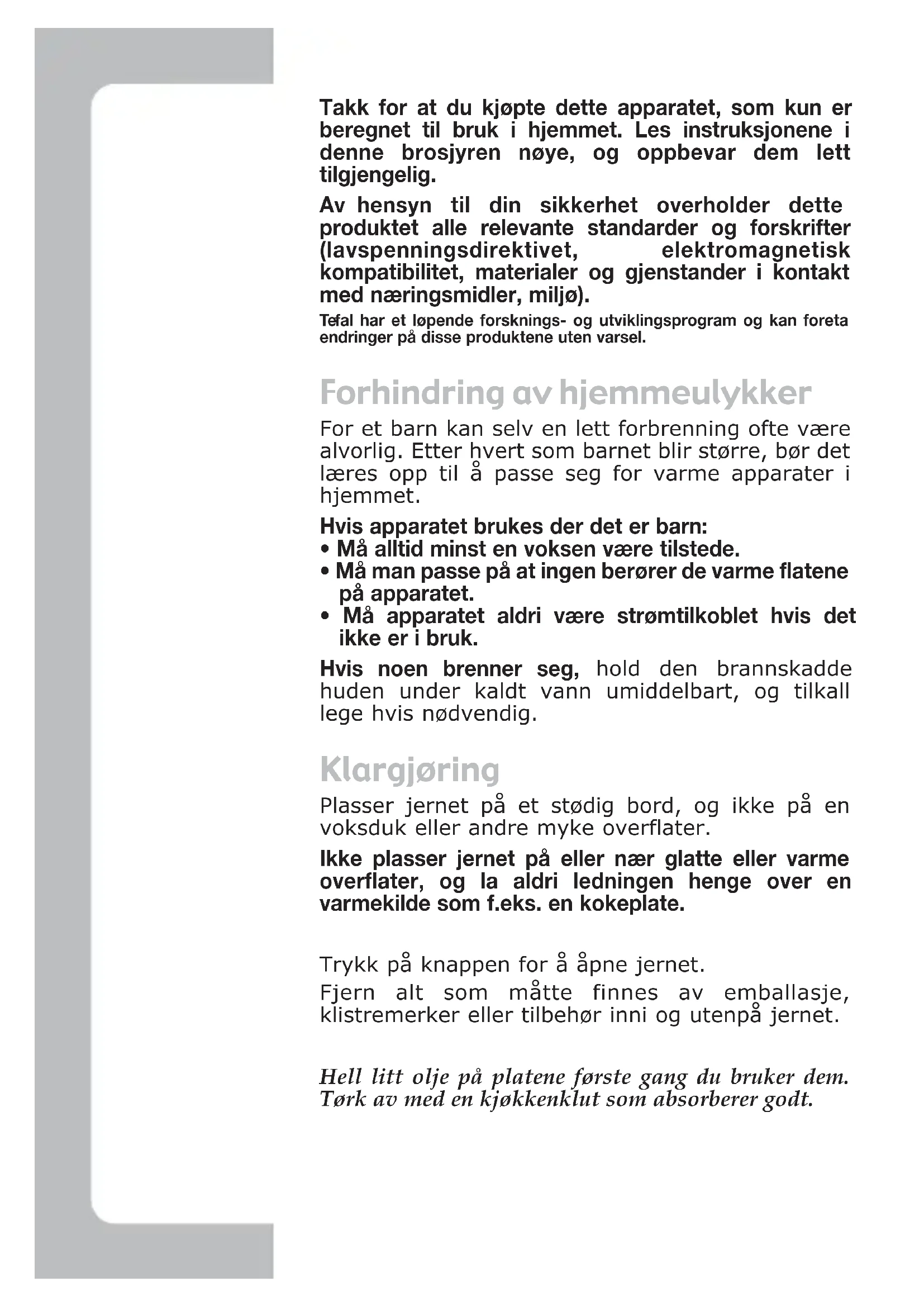 - Må apparatet aldri være strømtilkoblet hvis det ikke er i bruk. Hvis noen brenner seg, hold den brannskadde huden under kaldt vann umiddelbart, og tilkall lege hvis nødvendig. Klargjøring Plasser jernet på et stødig bord, og ikke på en voksduk eller andre myke overflater. Ikke plasser jernet på eller nær glatte eller varme overflater, og la aldri ledningen henge over en varmekilde som f.eks. en kokeplate. Trykk på knappen for å åpne jernet. Fjern alt som måtte finnes av emballasje, klistremerker eller tilbehør inni og utenpå jernet. Hell litt olje på platene første gang du bruker dem. Tørk av med en kjøkkenklut som absorberer godt. Gaufr ultracomp 08/05 12/10/05 16:57 Page 30Français Tilkopling og forvarming Lukk jernet. Plugg ledningen inn i stikkontakten. Den røde lampen tennes . Det kan komme en svak lukt og litt røyk fra jernet første gang du bruker det. Dette er normalt. Kontroller at det elektriske anlegget har riktig strøm og spenning for jernet (vist på apparatets underside). Kople jernet til en jordet kontakt. Dersom nettledningen er skadet, må den byttes av produsenten, dens service agent eller av en autorisert elektrohandler. Dette for å unngå fare ved bruk senere. Tilberedning La jernet få varme seg opp. Den grønne lampen tennes når riktig tilberedningstemperatur er nådd . Ikke berør metalldelene på apparatet under oppvarming, fordi de er veldig varme. Når apparatet oppnår riktig temperatur vil den grønne indikatorlampen slukke . Åpne apparatet. Hell vaffelrøre i midten av hver stekeflate . Lukk umiddelbart apparatet ved hjelp av håndtaket slik at røren fordeler seg jevnt på hele stekeflaten . Ikke hold på håndtaket under steking, for da får ikke vaffelen hevet. Merk: Under tilberedning vil den grønne indikatorlampen tennes og slukkes med jevne mellomrom for å sikre at tilberednings- temperaturen forblir jevn. Du kan når som helst under stekingen regulere termostaten hvis du synes temperaturen er for lav eller for høy.