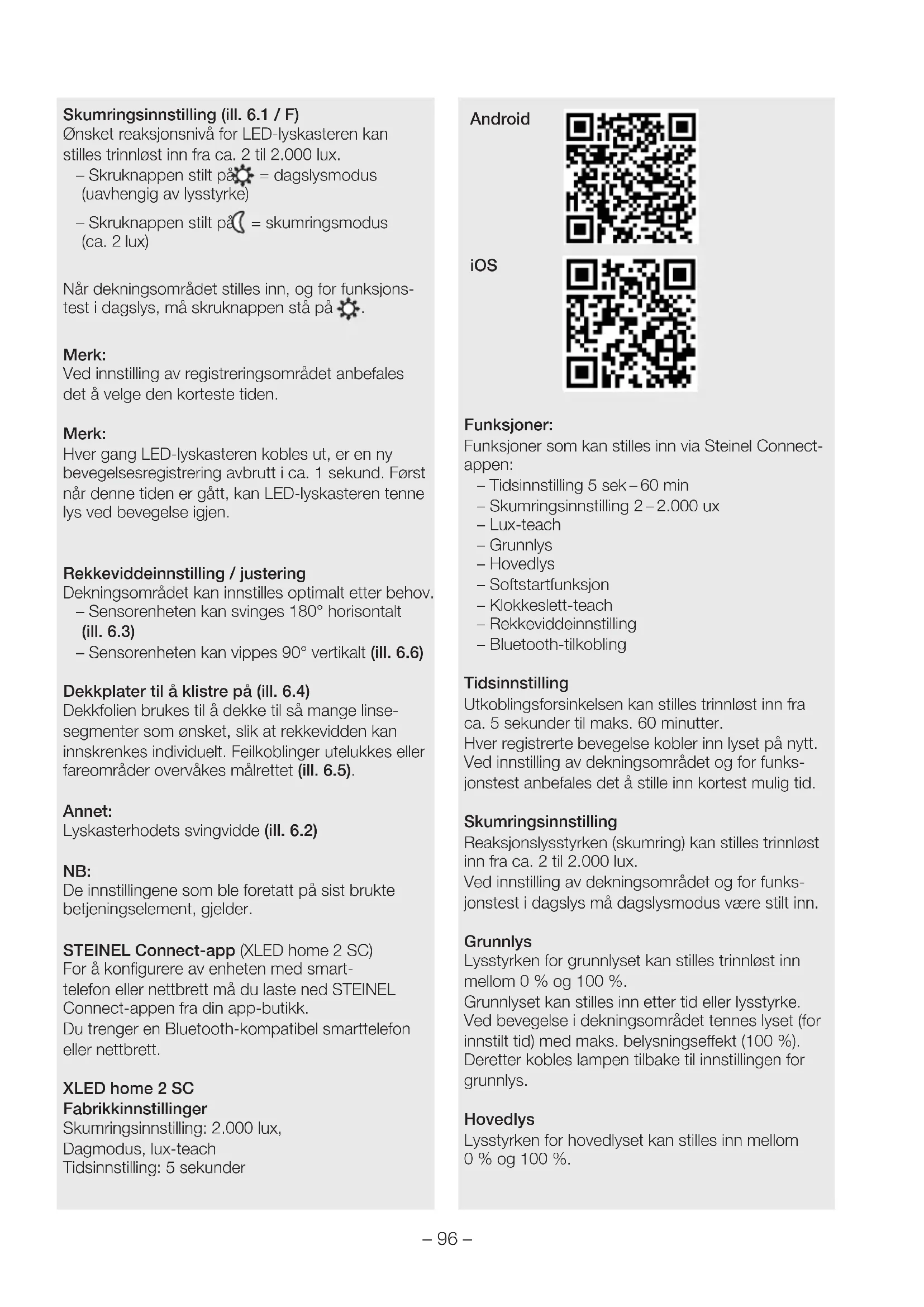 Merk: Ved innstilling av registreringsområdet anbefales det å velge den korteste tiden. Merk: Hver gang LED-lyskasteren kobles ut, er en ny bevegelsesregistrering avbrutt i ca. 1 sekund. Først når denne tiden er gått, kan LED-lyskasteren tenne lys ved bevegelse igjen. Rekkeviddeinnstilling/justering Dekningsområdet kan innstilles optimalt etter behov. – Sensorenheten kan svinges180° horisontalt (ill.6.3) – Sensorenheten kan vippes90° vertikalt (ill.6.6) Dekkplater til å klistre på (ill.6.4) Dekkfolien brukes til å dekke til så mange linse- segmenter som ønsket, slik at rekkevidden kan innskrenkes individuelt. Feilkoblinger utelukkes eller fareområder overvåkes målrettet (ill.6.5). Annet: Lyskasterhodets svingvidde (ill.6.2) NB: De innstillingene som ble foretatt på sist brukte betjeningselement, gjelder. STEINEL Connect-app (XLED home 2 SC) For å konfigurere av enheten med smart- telefon eller nettbrett må du laste ned STEINEL Connect-appen fra din app-butikk. Du trenger en Bluetooth-kompatibel smarttelefon eller nettbrett. XLEDhome2SC Fabrikkinnstillinger Skumringsinnstilling: 2.000lux, Dagmodus, lux-teach Tidsinnstilling: 5sekunder Android iOS Funksjoner: Funksjoner som kan stilles inn via Steinel Connect- appen: – Tidsinnstilling 5sek – 60min – Skumringsinnstilling 2 – 2.000ux – Lux-teach – Grunnlys – Hovedlys – Softstartfunksjon – Klokkeslett-teach – Rekkeviddeinnstilling – Bluetooth-tilkobling Tidsinnstilling Utkoblingsforsinkelsen kan stilles trinnløst inn fra ca. 5 sekunder til maks. 60 minutter. Hver registrerte bevegelse kobler inn lyset på nytt. Ved innstilling av dekningsområdet og for funks- jonstest anbefales det å stille inn kortest mulig tid. Skumringsinnstilling Reaksjonslysstyrken (skumring) kan stilles trinnløst inn fra ca. 2 til 2.000 lux. Ved innstilling av dekningsområdet og for funks- jonstest i dagslys må dagslysmodus være stilt inn. Grunnlys Lysstyrken for grunnlyset kan stilles trinnløst inn mellom 0% og 100%. Grunnlyset kan stilles inn etter tid eller lysstyrke. Ved bevegelse i dekningsområdet tennes lyset (for innstilt tid) med maks. belysningseekt (100%). Deretter kobles lampen tilbake til innstillingen for grunnlys. Hovedlys Lysstyrken for hovedlyset kan stilles inn mellom 0% og 100%.– 97 –