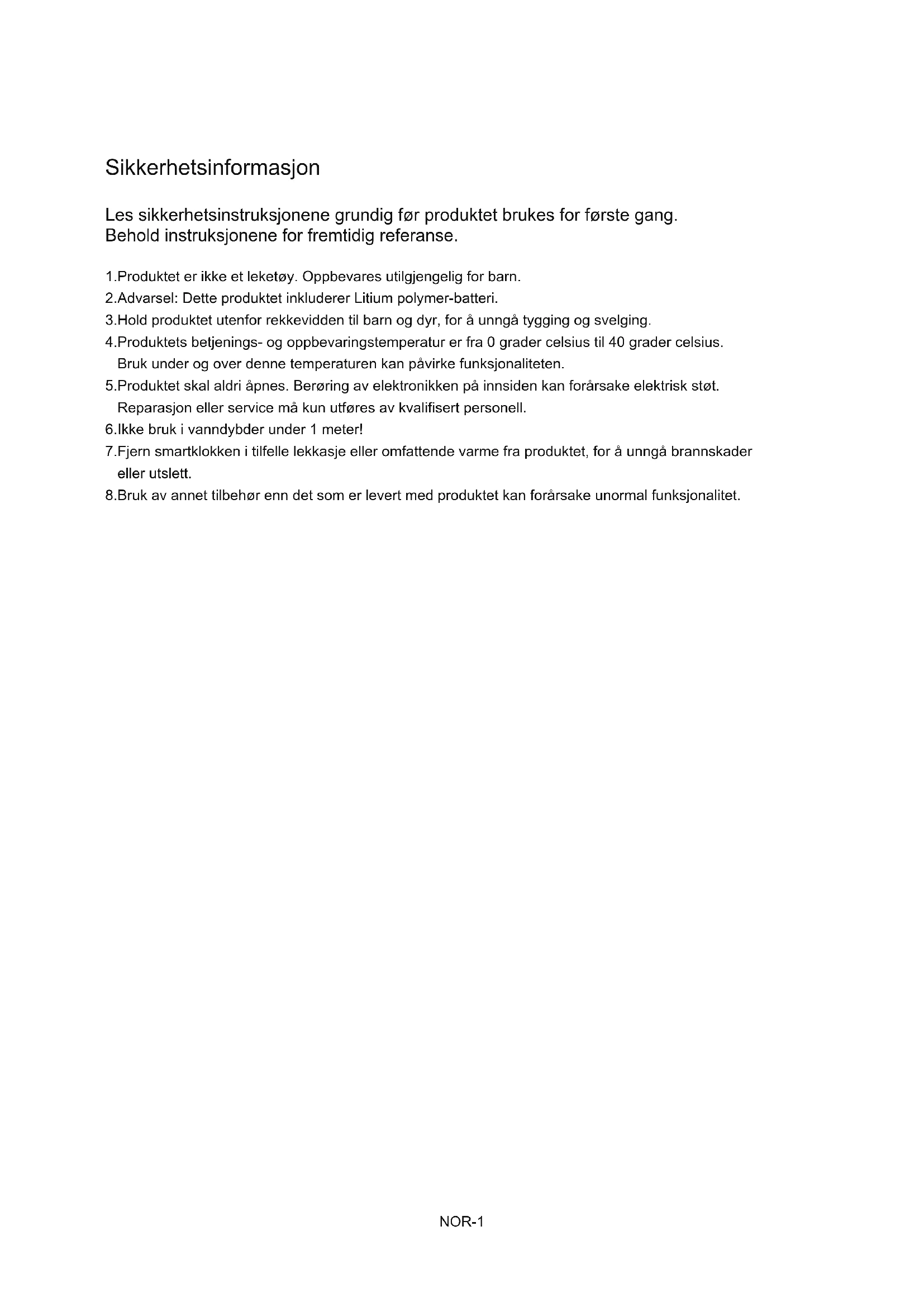 Påminnelse om anrop: Åpne funksjonen i APP-en, armbåndet vibrerer under innkommende anrop Vær: Værsiden kan vise værinfo om dagens og morgendagens vær. Værinfo synkroniseres etter tilkobling med APP-en, den vil ikke oppdateres etter en lang periode med frakobling. Musikk: Etter tilkobling med smartklokken, kan du styre musikkspilleren på telefonen din med fjernkontroll.NOR-6 Vennligst merk at vi kan gjøre endringer på alle våre produkter uten forvarsel. Vi tar forbehold om eventuelle feil og mangler i denne manualen.