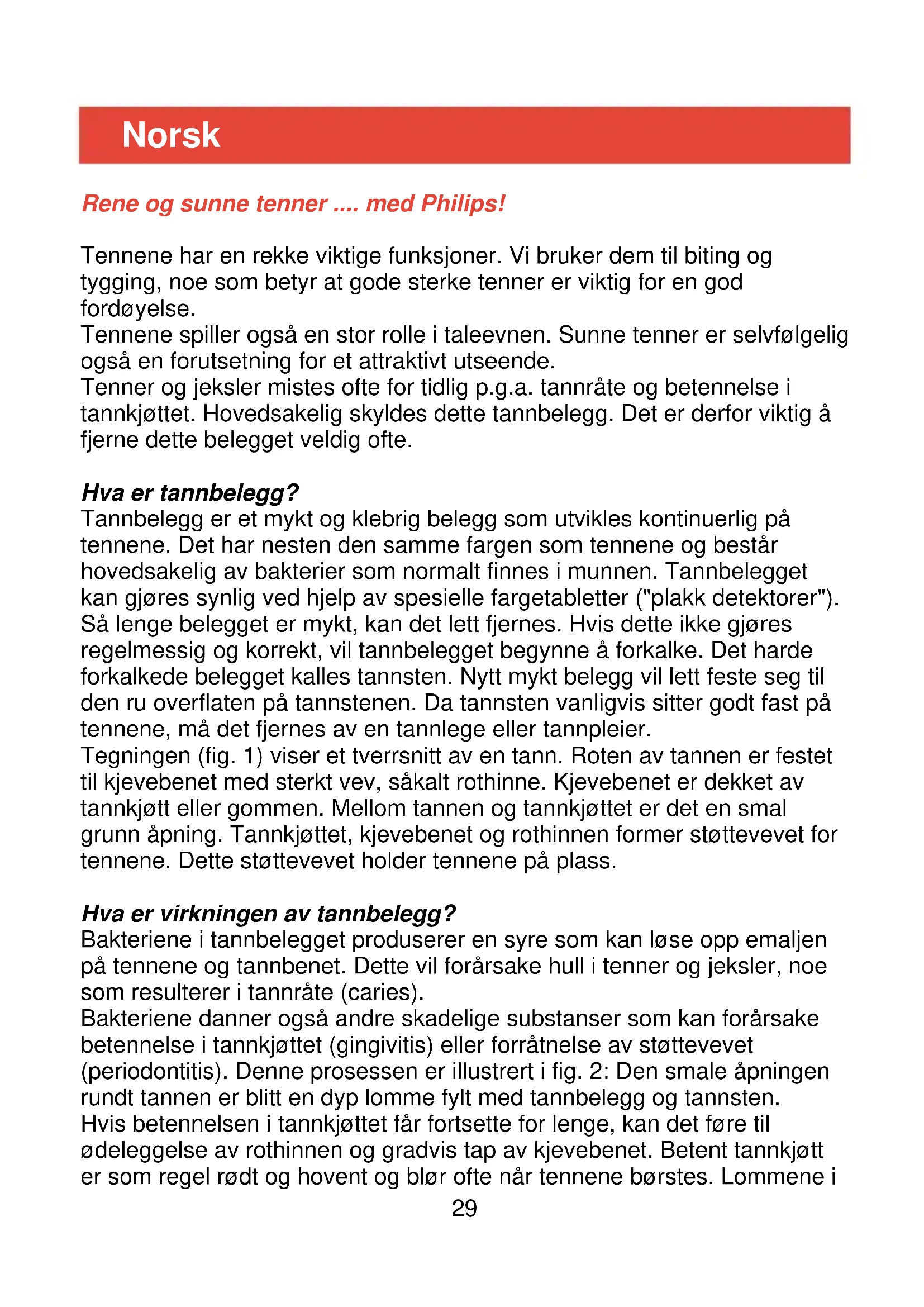 - Venligst bemærk: Skru kun bunden af, når batteriet skal tages ud. Når først bunden har været skruet af, er motorenheden muligvis ikke længere vandtæt, hvorfor garantien bortfalder. 28Rene og sunne tenner .... med Philips! Tennene har en rekke viktige funksjoner. Vi bruker dem til biting og tygging, noe som betyr at gode sterke tenner er viktig for en god fordøyelse. Tennene spiller også en stor rolle i taleevnen. Sunne tenner er selvfølgelig også en forutsetning for et attraktivt utseende. Tenner og jeksler mistes ofte for tidlig p.g.a. tannråte og betennelse i tannkjøttet. Hovedsakelig skyldes dette tannbelegg. Det er derfor viktig å fjerne dette belegget veldig ofte. Hva er tannbelegg? Tannbelegg er et mykt og klebrig belegg som utvikles kontinuerlig på tennene. Det har nesten den samme fargen som tennene og består hovedsakelig av bakterier som normalt finnes i munnen. Tannbelegget kan gjøres synlig ved hjelp av spesielle fargetabletter ("plakk detektorer"). Så lenge belegget er mykt, kan det lett fjernes. Hvis dette ikke gjøres regelmessig og korrekt, vil tannbelegget begynne å forkalke. Det harde forkalkede belegget kalles tannsten. Nytt mykt belegg vil lett feste seg til den ru overflaten på tannstenen. Da tannsten vanligvis sitter godt fast på tennene, må det fjernes av en tannlege eller tannpleier. Tegningen (fig. 1) viser et tverrsnitt av en tann. Roten av tannen er festet til kjevebenet med sterkt vev, såkalt rothinne. Kjevebenet er dekket av tannkjøtt eller gommen. Mellom tannen og tannkjøttet er det en smal grunn åpning. Tannkjøttet, kjevebenet og rothinnen former støttevevet for tennene. Dette støttevevet holder tennene på plass. Hva er virkningen av tannbelegg? Bakteriene i tannbelegget produserer en syre som kan løse opp emaljen på tennene og tannbenet. Dette vil forårsake hull i tenner og jeksler, noe som resulterer i tannråte (caries). Bakteriene danner også andre skadelige substanser som kan forårsake betennelse i tannkjøttet (gingivitis) eller forråtnelse av støttevevet (periodontitis). Denne prosessen er illustrert i fig. 2: Den smale åpningen rundt tannen er blitt en dyp lomme fylt med tannbelegg og tannsten. Hvis betennelsen i tannkjøttet får fortsette for lenge, kan det føre til ødeleggelse av rothinnen og gradvis tap av kjevebenet. Betent tannkjøtt er som regel rødt og hovent og blør ofte når tennene børstes. Lommene i Norsk 29tannkjøttet blir dypere og belegg og tannsten vil spre seg ned over siden på tannen. Til slutt vil dette eventuelt resultere i at tannen løsner eller faller ut (fig. 3). Regelmessig fjerning av tannbelegg vil hindre gingivitis og vil hjelpe å stoppe spredningen av periodontitis. Philips oppladbar tannbørste HP 405 og HP 355 "Clean & Clear" børstebevegelse (fig. 4 a) Børsten beveger seg i to retninger og ved to hastigheter samtidig: