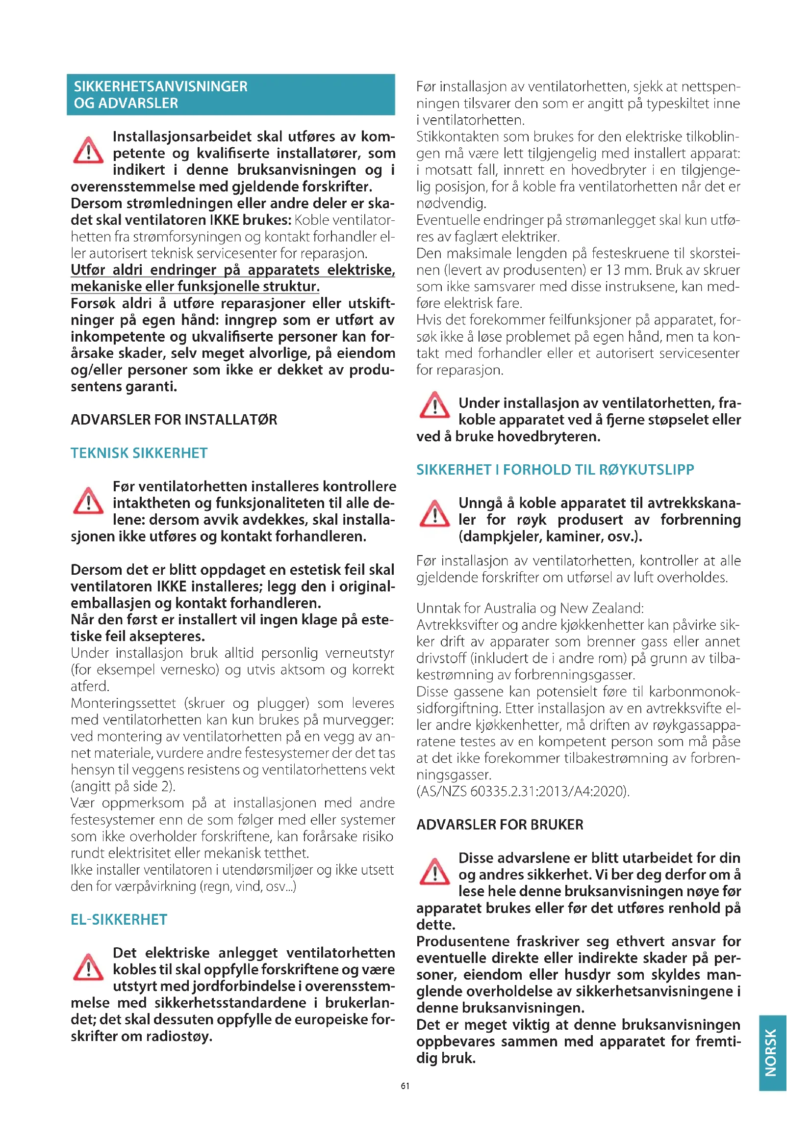 Unngå å koble apparatet til avtrekkskana- ler for røyk produsert av forbrenning (dampkjeler, kaminer, osv.). Før installasjon av ventilatorhetten, kontroller at alle gjeldende forskrifter om utførsel av luft overholdes. Unntak for Australia og New Zealand: Avtrekksvifter og andre kjøkkenhetter kan påvirke sik- ker drift av apparater som brenner gass eller annet drivstoff (inkludert de i andre rom) på grunn av tilba- kestrømning av forbrenningsgasser. Disse gassene kan potensielt føre til karbonmonok- sidforgiftning. Etter installasjon av en avtrekksvifte el- ler andre kjøkkenhetter, må driften av røykgassappa- ratene testes av en kompetent person som må påse at det ikke forekommer tilbakestrømning av forbren- ningsgasser. (AS/NZS 60335.2.31:2013/A4:2020).