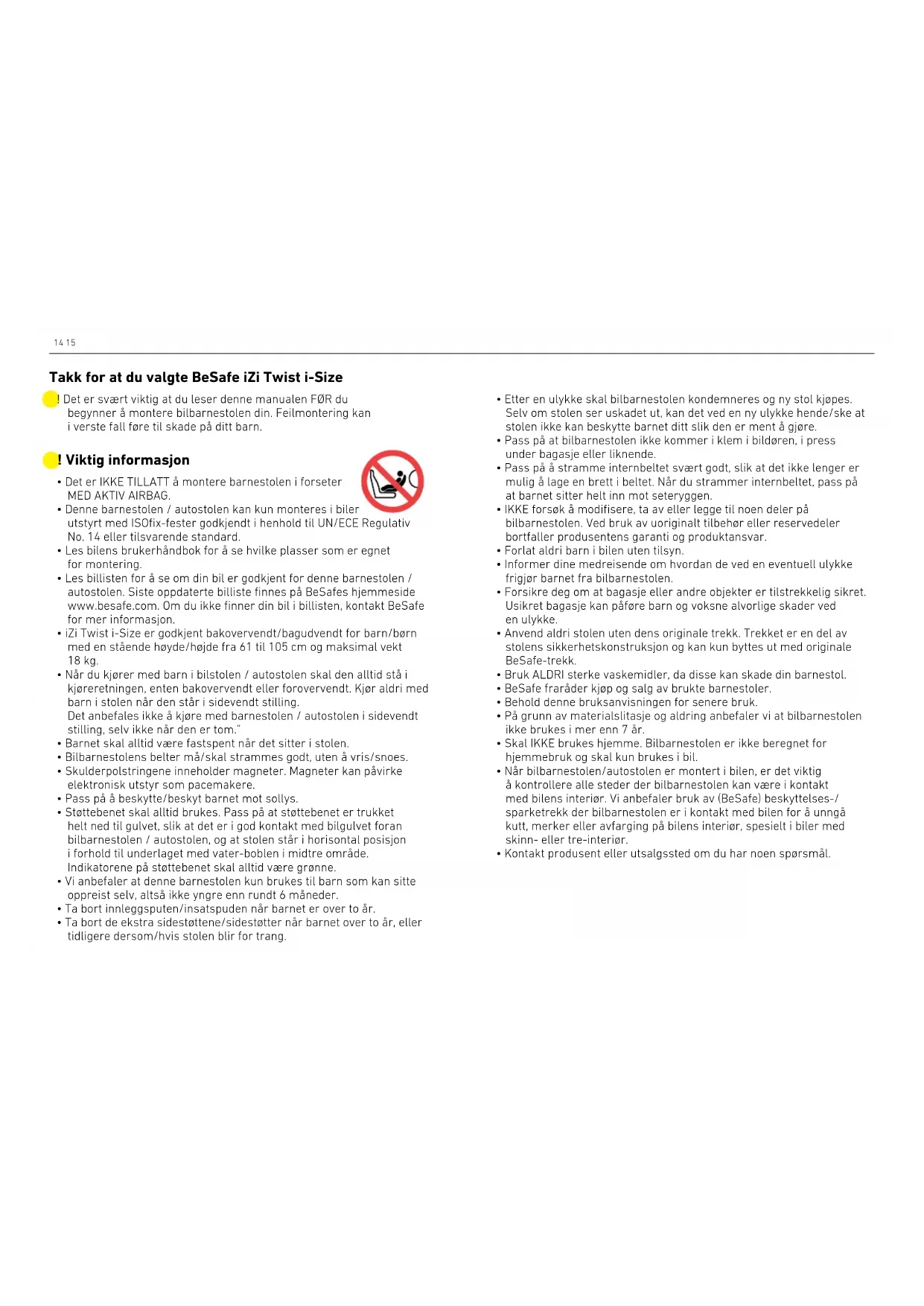 - Kontakt produsent eller utsalgssted om du har noen spørsmål. ! Det er svært viktig at du leser denne manualen FØR du begynner å montere bilbarnestolen din. Feilmontering kan i verste fall føre til skade på ditt barn. Takk for at du valgte BeSafe iZi Twist i-Size16 17