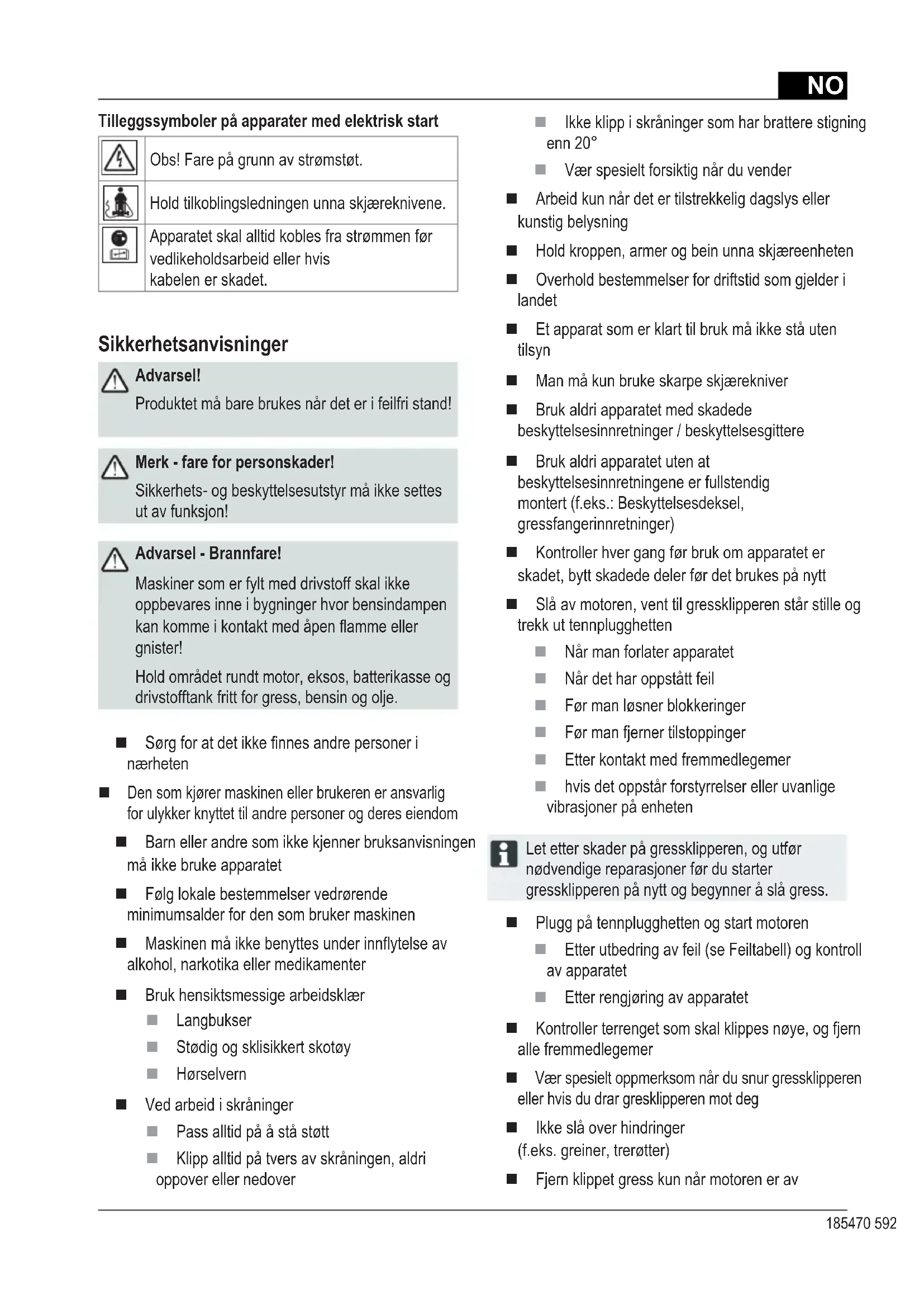 Beskyttelsesdeksel Beskyttelsesdekslet beskytter mot deler som slynges ut.NO 185470 592_f Sikkerhetsanvisninger Advarsel! Produktet må bare brukes når det er i feilfri stand! Merk - fare for personskader! Sikkerhets- og beskyttelsesutstyr må ikke settes ut av funksjon! Advarsel - Brannfare! Maskiner som er fylt med drivstoff skal ikke oppbevares inne i bygninger hvor bensindampen kankommeikontaktmedåpenammeeller gnister! Hold området rundt motor, eksos, batterikasse og drivstofftank fritt for gress, bensin og olje. Sørgforatdetikkennesandrepersoneri nærheten Den som kjører maskinen eller brukeren er ansvarlig for ulykker knyttet til andre personer og deres eiendom Barn eller andre som ikke kjenner bruksanvisningen må ikke bruke apparatet Følg lokale bestemmelser vedrørende minimumsalder for den som bruker maskinen Maskinenmåikkebenyttesunderinnytelseav alkohol, narkotika eller medikamenter Bruk hensiktsmessige arbeidsklær Langbukser Stødig og sklisikkert skotøy Hørselvern Ved arbeid i skråninger Pass alltid på å stå støtt Klipp alltid på tvers av skråningen, aldri oppover eller nedover Ikke klipp i skråninger som har brattere stigning enn 20° Vær spesielt forsiktig når du vender Arbeid kun når det er tilstrekkelig dagslys eller kunstig belysning Hold kroppen, armer og bein unna skjæreenheten Overhold bestemmelser for driftstid som gjelder i landet Et apparat som er klart til bruk må ikke stå uten tilsyn Man må kun bruke skarpe skjærekniver Bruk aldri apparatet med skadede beskyttelsesinnretninger / beskyttelsesgittere Bruk aldri apparatet uten at beskyttelsesinnretningene er fullstendig montert (f.eks.: Beskyttelsesdeksel, gressfangerinnretninger) Kontroller hver gang før bruk om apparatet er skadet, bytt skadede deler før det brukes på nytt Slå av motoren, vent til gressklipperen står stille og trekk ut tennplugghetten Når man forlater apparatet Når det har oppstått feil Før man løsner blokkeringer Før man fjerner tilstoppinger Etter kontakt med fremmedlegemer hvis det oppstår forstyrrelser eller uvanlige vibrasjoner på enheten Let etter skader på gressklipperen, og utfør nødvendige reparasjoner før du starter gressklipperen på nytt og begynner å slå gress. Plugg på tennplugghetten og start motoren Etter utbedring av feil (se Feiltabell) og kontroll av apparatet Etter rengjøring av apparatet Kontroller terrenget som skal klippes nøye, og fjern alle fremmedlegemer Vær spesielt oppmerksom når du snur gressklipperen eller hvis du drar gresklipperen mot deg Ikke slå over hindringer (f.eks. greiner, trerøtter) Fjern klippet gress kun når motoren er av Tilleggssymboler på apparater med elektrisk start Obs! Fare på grunn av strømstøt. Hold tilkoblingsledningen unna skjæreknivene. Apparatet skal alltid kobles fra strømmen før vedlikeholdsarbeid eller hvis kabelen er skadet.NO Oversettelse av original bruksanvisning