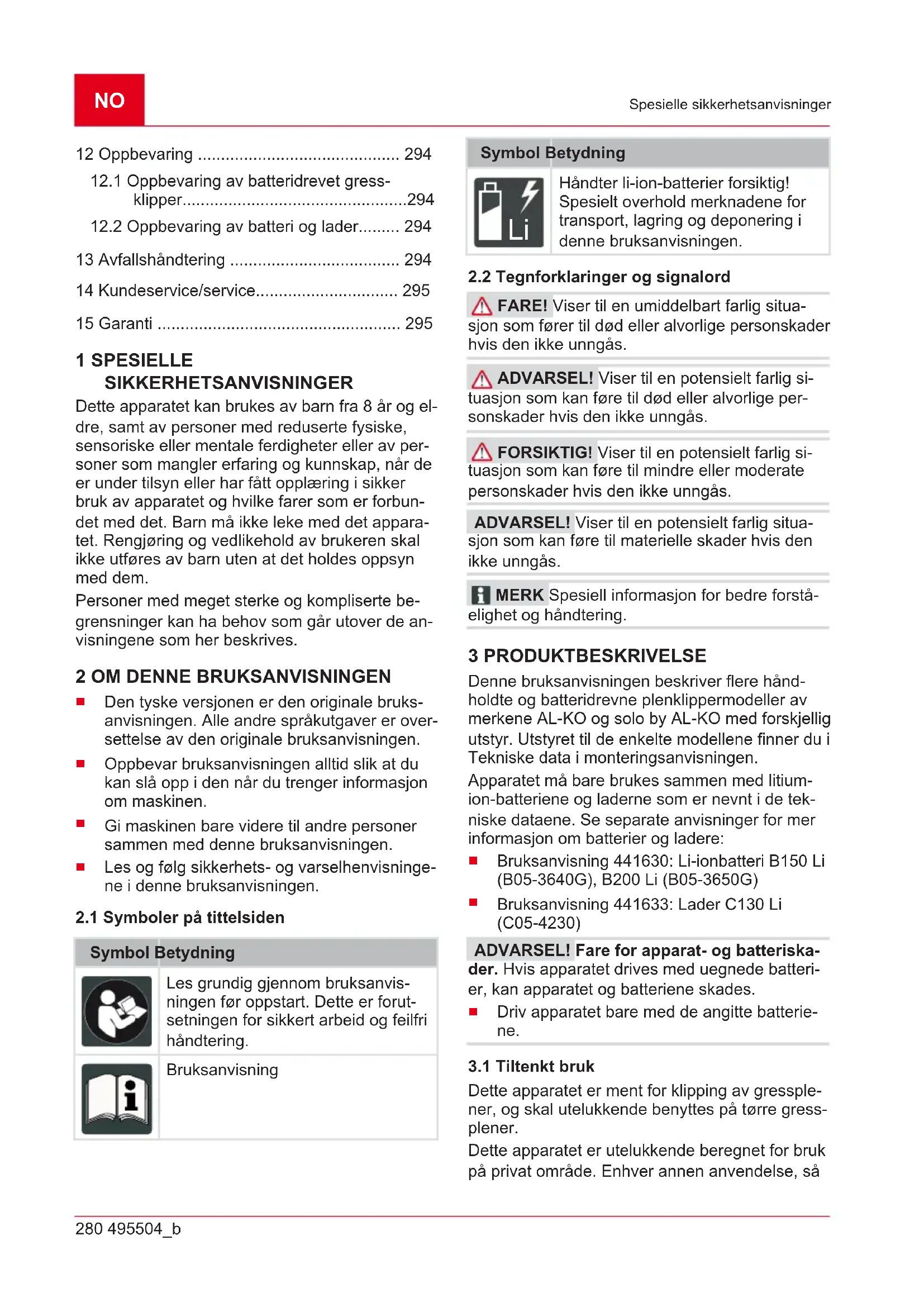 FARE! Viser til en umiddelbart farlig situa- sjon som fører til død eller alvorlige personskader hvis den ikke unngås. ADVARSEL! Viser til en potensielt farlig si- tuasjon som kan føre til død eller alvorlige per- sonskader hvis den ikke unngås. FORSIKTIG! Viser til en potensielt farlig si- tuasjon som kan føre til mindre eller moderate personskader hvis den ikke unngås. ADVARSEL! Viser til en potensielt farlig situa- sjon som kan føre til materielle skader hvis den ikke unngås. MERK Spesiell informasjon for bedre forstå- elighet og håndtering. 3 PRODUKTBESKRIVELSE Denne bruksanvisningen beskriver flere hånd- holdte og batteridrevne plenklippermodeller av merkene AL‑KO og solobyAL‑KO med forskjellig utstyr. Utstyret til de enkelte modellene finner du i Tekniske data i monteringsanvisningen. Apparatet må bare brukes sammen med litium- ion-batteriene og laderne som er nevnt i de tek- niske dataene. Se separate anvisninger for mer informasjon om batterier og ladere: