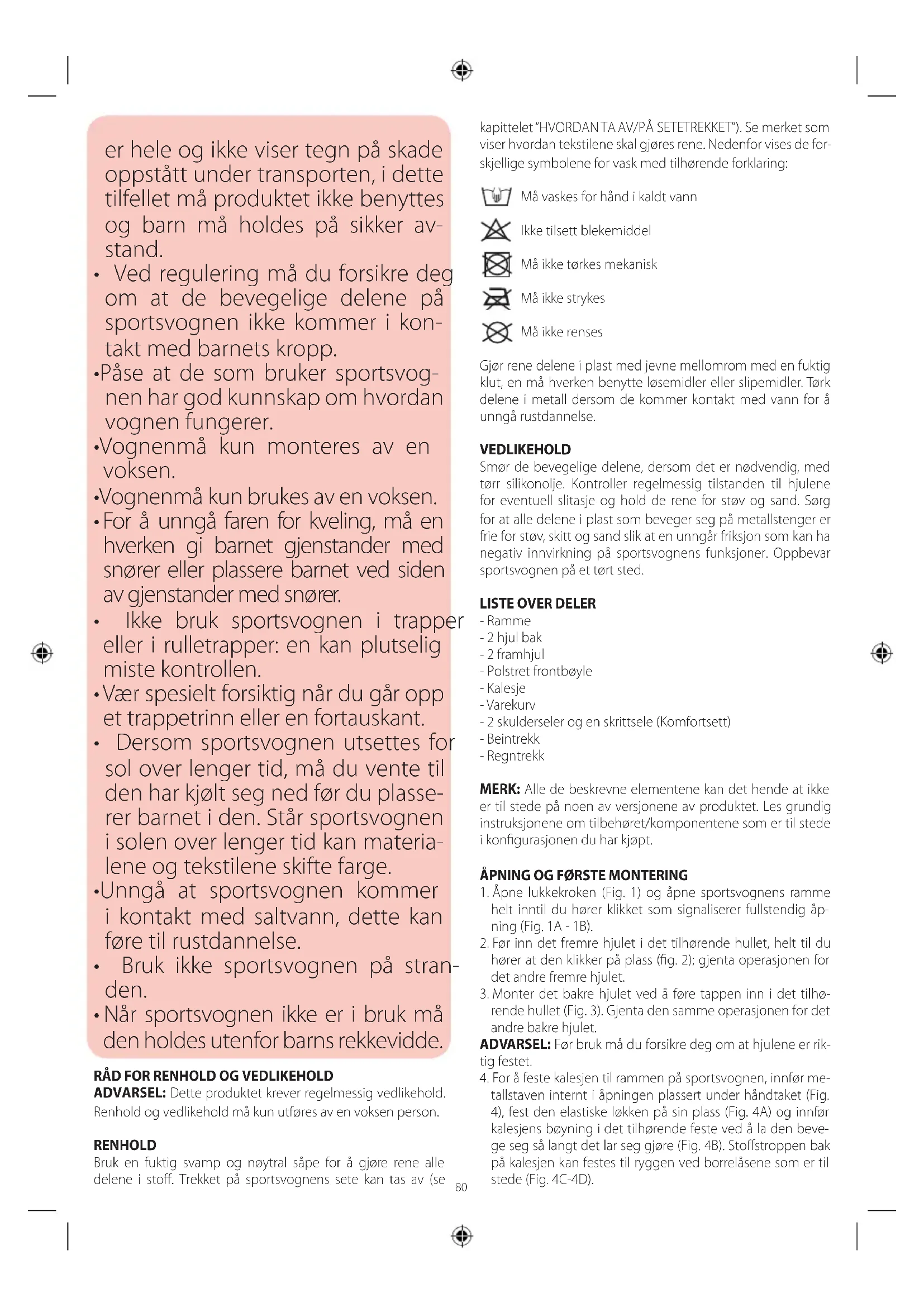ADVARSEL: Dette produktet krever regelmessig vedlikehold. Renhold og vedlikehold må kun utføres av en voksen person. RENHOLD Bruk en fuktig svamp og nøytral såpe for å gjøre rene alle delene i sto. Trekket på sportsvognens sete kan tas av (se kapittelet “HVORDAN TA AV/PÅ SETETREKKET”). Se merket som viser hvordan tekstilene skal gjøres rene. Nedenfor vises de for- skjellige symbolene for vask med tilhørende forklaring: Må vaskes for hånd i kaldt vann Ikke tilsett blekemiddel Må ikke tørkes mekanisk Må ikke strykes Må ikke renses Gjør rene delene i plast med jevne mellomrom med en fuktig klut, en må hverken benytte løsemidler eller slipemidler. Tørk delene i metall dersom de kommer kontakt med vann for å unngå rustdannelse. VEDLIKEHOLD Smør de bevegelige delene, dersom det er nødvendig, med tørr silikonolje. Kontroller regelmessig tilstanden til hjulene for eventuell slitasje og hold de rene for støv og sand. Sørg for at alle delene i plast som beveger seg på metallstenger er frie for støv, skitt og sand slik at en unngår friksjon som kan ha negativ innvirkning på sportsvognens funksjoner. Oppbevar sportsvognen på et tørt sted.
