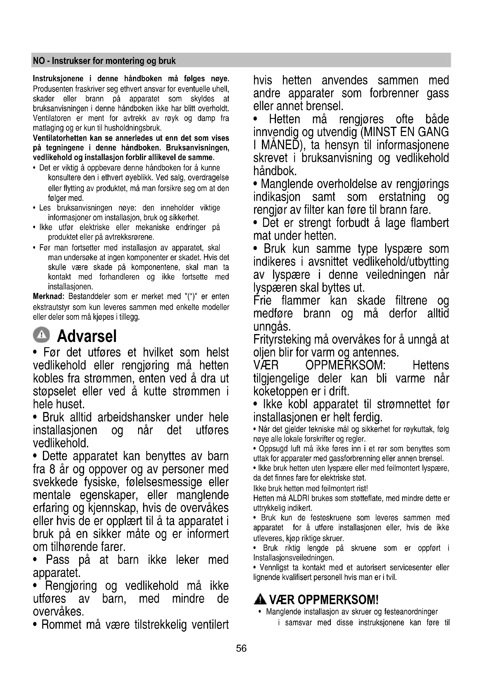 - Rommet må være tilstrekkelig ventilert hvis hetten anvendes sammen med andre apparater som forbrenner gass eller annet brensel.