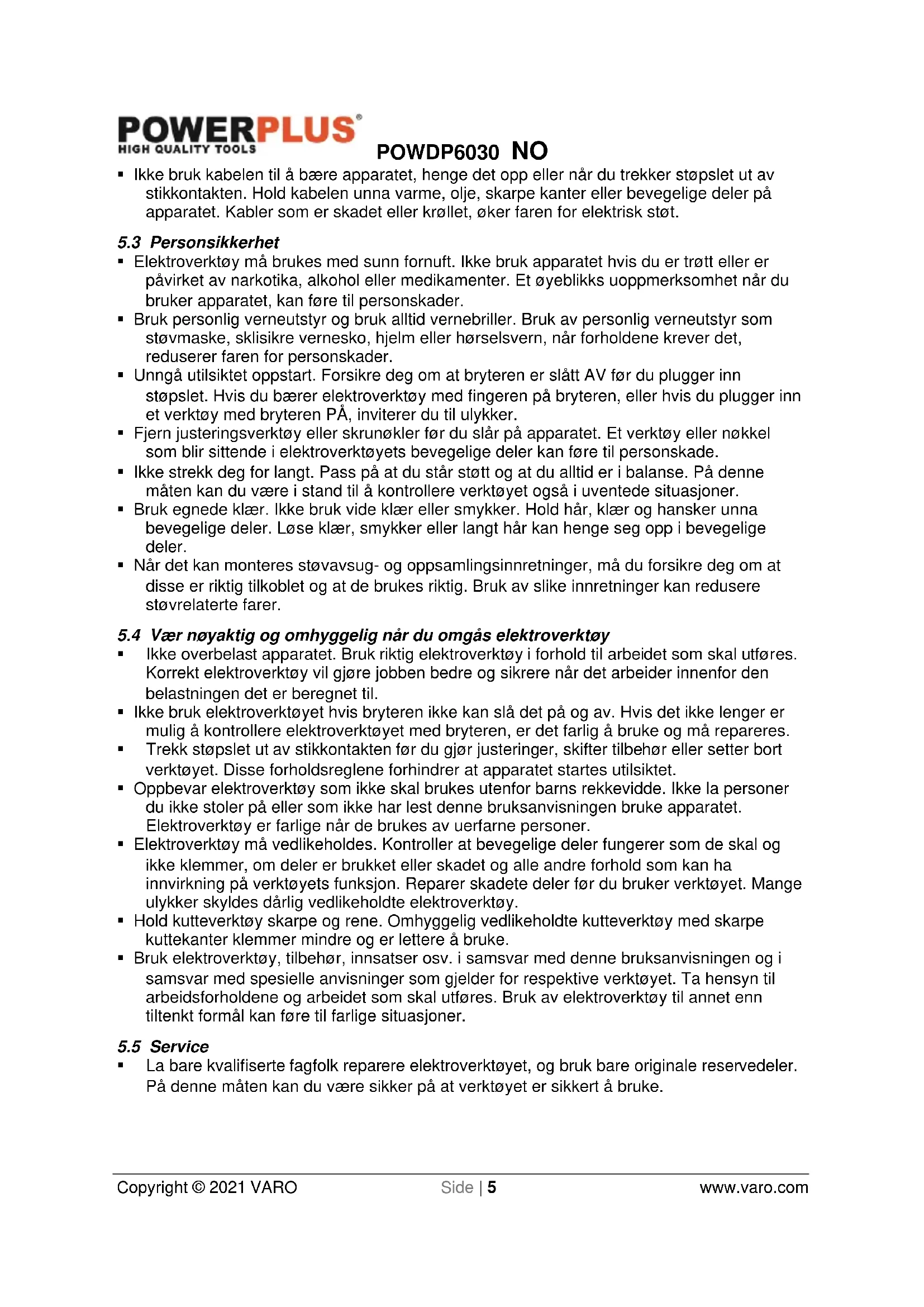 - La bare kvalifiserte fagfolk reparere elektroverktøyet, og bruk bare originale reservedeler. På denne måten kan du være sikker på at verktøyet er sikkert å bruke.POWDP6030 NO Copyright © 2021 VARO Side | 6 www.varo.com