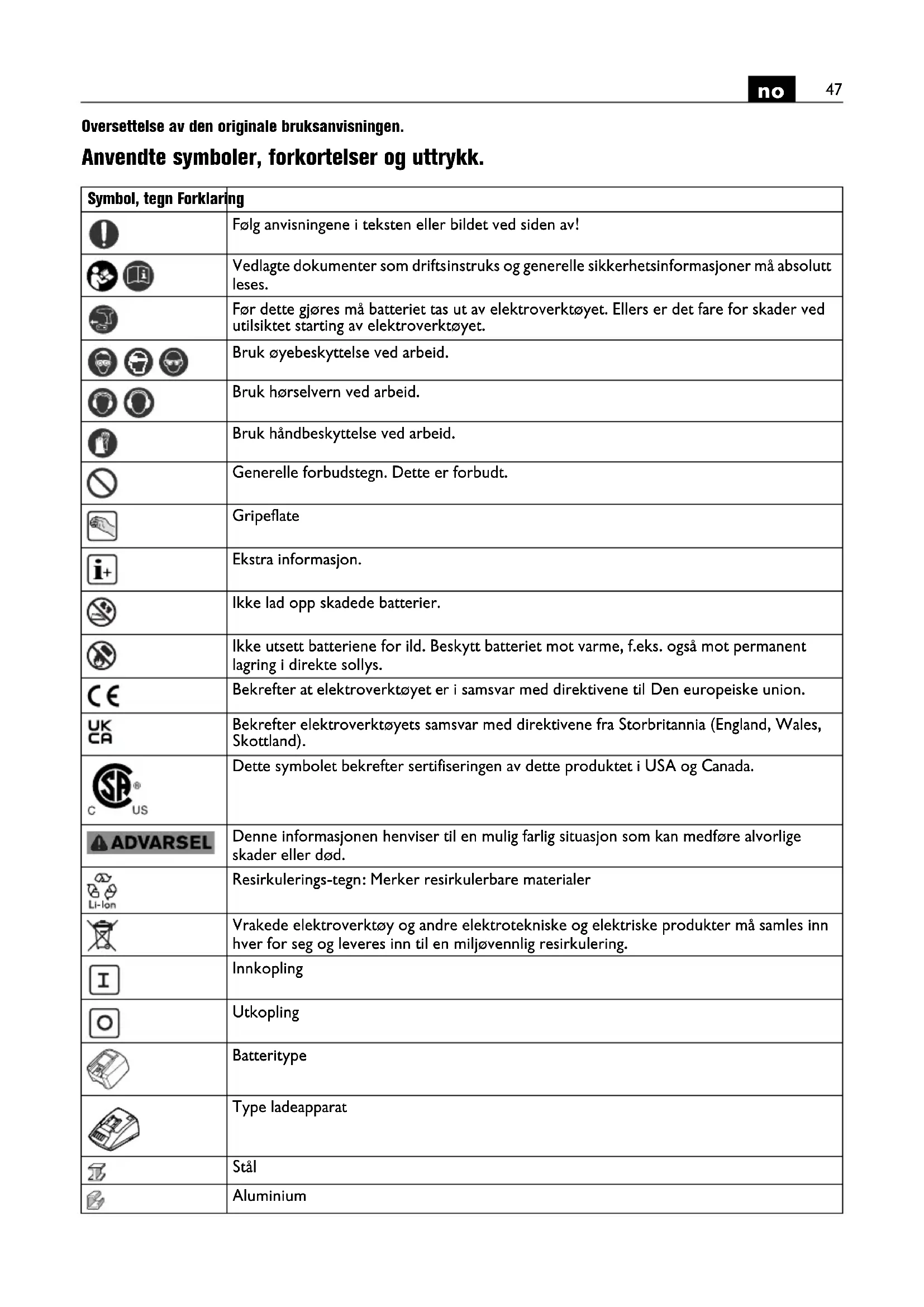 Oversettelse av den originale bruksanvisningen. Anvendte symboler, forkortelser og uttrykk. Symbol, tegn Forklaring Følg anvisningene i teksten eller bildet ved siden av! Vedlagte dokumenter som driftsinstruks og generelle sikkerhetsinformasjoner må absolutt leses. Før dette gjøres må batteriet tas ut av elektroverktøyet. Ellers er det fare for skader ved utilsiktet starting av elektroverktøyet. Bruk øyebeskyttelse ved arbeid. Bruk hørselvern ved arbeid. Bruk håndbeskyttelse ved arbeid. Generelle forbudstegn. Dette er forbudt. Gripeflate Ekstra informasjon. Ikke lad opp skadede batterier. Ikke utsett batteriene for ild. Beskytt batteriet mot varme, f.eks. også mot permanent lagring i direkte sollys. Bekrefter at elektroverktøyet er i samsvar med direktivene til Den europeiske union. Bekrefter elektroverktøyets samsvar med direktivene fra Storbritannia (England, Wales, Skottland). Dette symbolet bekrefter sertifiseringen av dette produktet i USA og Canada. Denne informasjonen henviser til en mulig farlig situasjon som kan medføre alvorlige skader eller død. Resirkulerings-tegn: Merker resirkulerbare materialer Vrakede elektroverktøy og andre elektrotekniske og elektriske produkter må samles inn hver for seg og leveres inn til en miljøvennlig resirkulering. Innkopling Utkopling Batteritype Type ladeapparat Stål Aluminium48