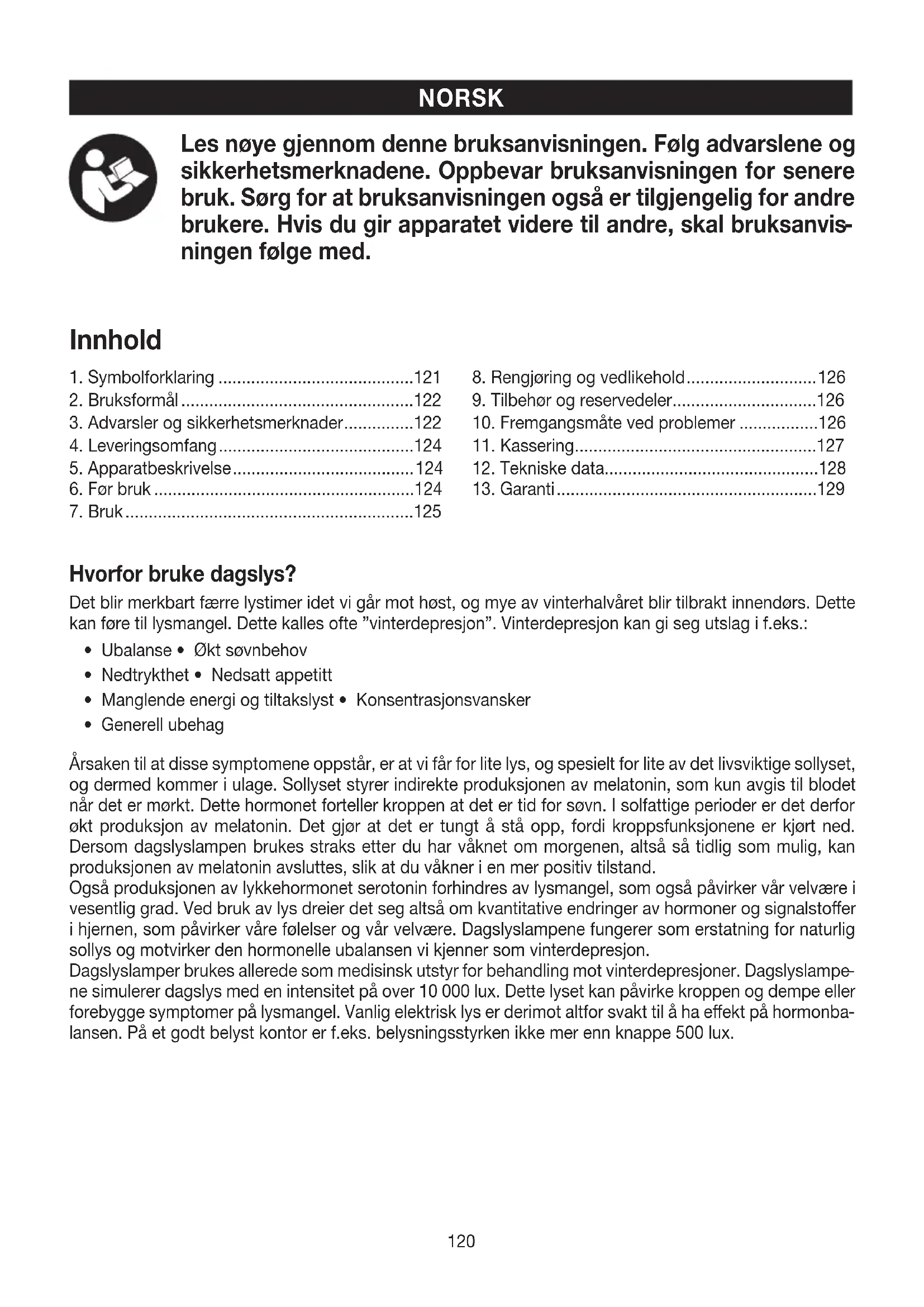 - Dagslyslampen skal bare benyttes til bestråling av menneskekroppen.
