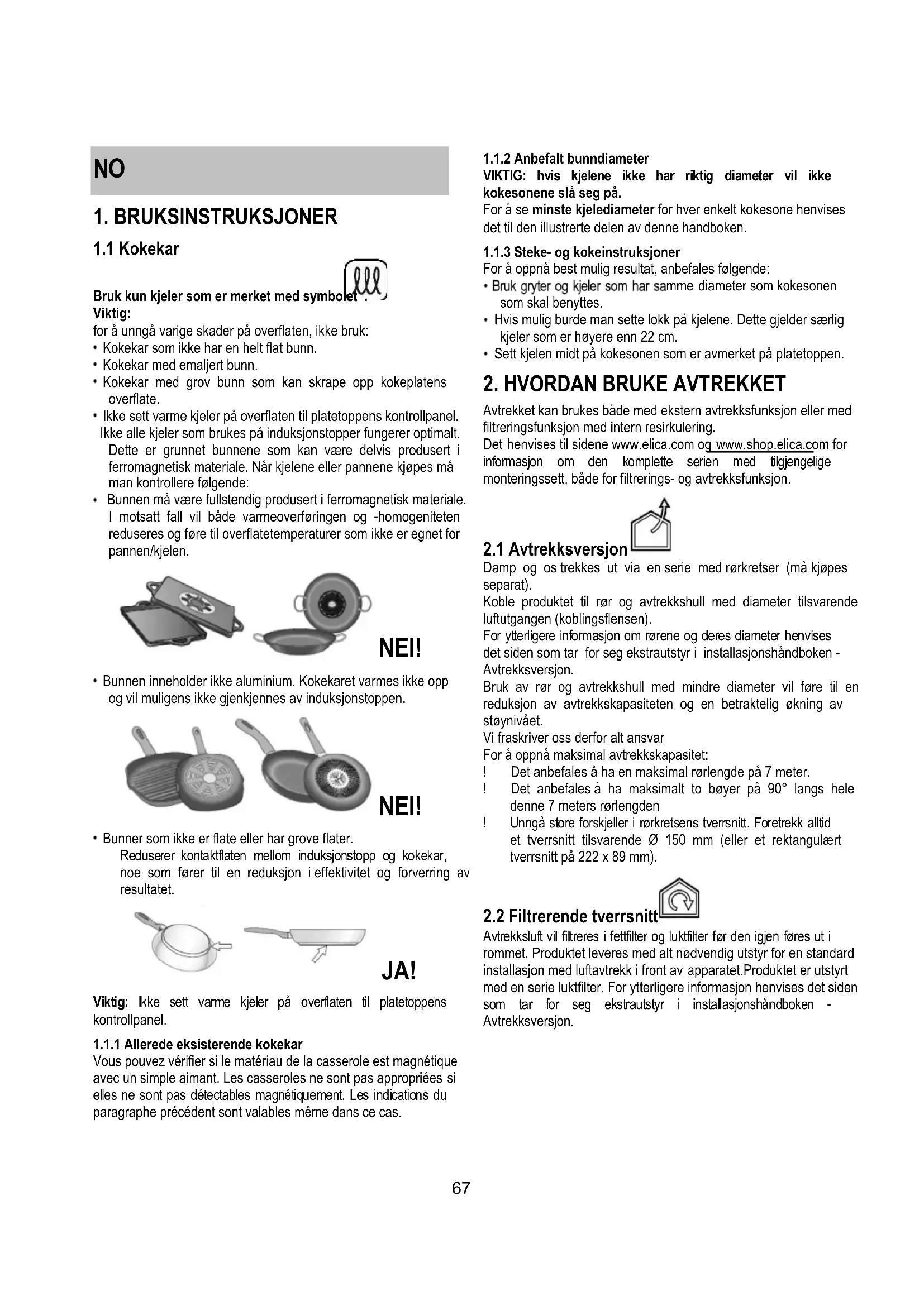 Bruk kun kjeler som er merket med symbolet . Viktig: for å unngå varige skader på overflaten, ikke bruk: Kokekar som ikke har en helt flat bunn. Kokekar med emaljert bunn. Kokekar med grov bunn som kan skrape opp kokeplatens overflate. Ikke sett varme kjeler på overflaten til platetoppens kontrollpanel. Ikke alle kjeler som brukes på induksjonstopper fungerer optimalt. Dette er grunnet bunnene som kan være delvis produsert i ferromagnetisk materiale. Når kjelene eller pannene kjøpes må man kontrollere følgende: Bunnen må være fullstendig produsert i ferromagnetisk materiale. I motsatt fall vil både varmeoverføringen og -homogeniteten reduseres og føre til overflatetemperaturer som ikke er egnet for pannen/kjelen. NEI! Bunnen inneholder ikke aluminium. Kokekaret varmes ikke opp og vil muligens ikke gjenkjennes av induksjonstoppen. NEI! Bunner som ikke er flate eller har grove flater. Reduserer kontaktflaten mellom induksjonstopp og kokekar, noe som fører til en reduksjon i effektivitet og forverring av resultatet. JA! Viktig: Ikke sett varme kjeler på overflaten til platetoppens kontrollpanel.