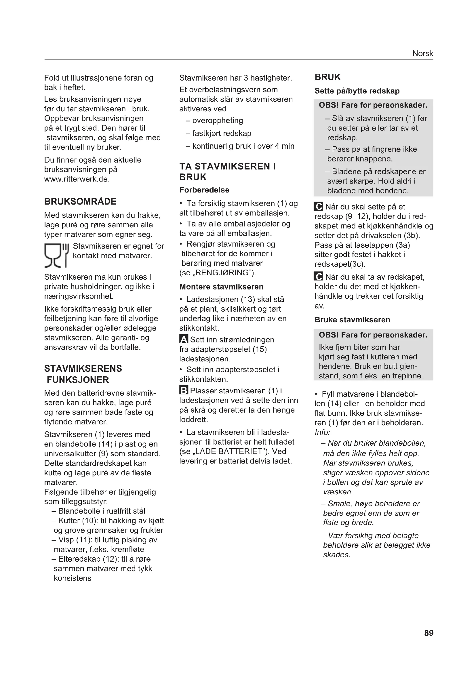 - Fyll matvarene i blandebol- len (14) eller i en beholder med at bunn. Ikke bruk stavmikse- ren (1) før den er i beholderen. Info: – Når du bruker blandebollen, må den ikke fylles helt opp. Når stavmikseren brukes, stiger væsken oppover sidene i bollen og det kan sprute av væsken. – Smale, høye beholdere er bedre egnet enn de som er ate og brede. – Vær forsiktig med belagte beholdere slik at belegget ikke skades. Fold ut illustrasjonene foran og bak i heftet. Les bruksanvisningen nøye før du tar stavmikseren i bruk. Oppbevar bruksanvisningen på et trygt sted. Den hører til stavmikseren, og skal følge med til eventuell ny bruker. Du nner også den aktuelle bruksanvisningen på www.ritterwerk.de. BRUKSOMRÅDE Med stavmikseren kan du hakke, lage puré og røre sammen alle typer matvarer som egner seg. Stavmikseren er egnet for kontakt med matvarer. Stavmikseren må kun brukes i private husholdninger, og ikke i næringsvirksomhet. Ikke forskriftsmessig bruk eller feilbetjening kan føre til alvorlige personskader og/eller ødelegge stavmikseren. Alle garanti- og ansvarskrav vil da bortfalle. STAVMIKSERENS FUNKSJONER Med den batteridrevne stavmik- seren kan du hakke, lage puré og røre sammen både faste og ytende matvarer. Stavmikseren (1) leveres med en blandebolle (14) i plast og en universalkutter (9) som standard. Dette standardredskapet kan kutte og lage puré av de este matvarer. Følgende tilbehør er tilgjengelig som tilleggsutstyr: – Blandebolle i rustfritt stål – Kutter (10): til hakking av kjøtt og grove grønnsaker og frukter – Visp (11): til luftig pisking av matvarer, f.eks. kremøte – Elteredskap (12): til å røre sammen matvarer med tykk konsistens Norsk90