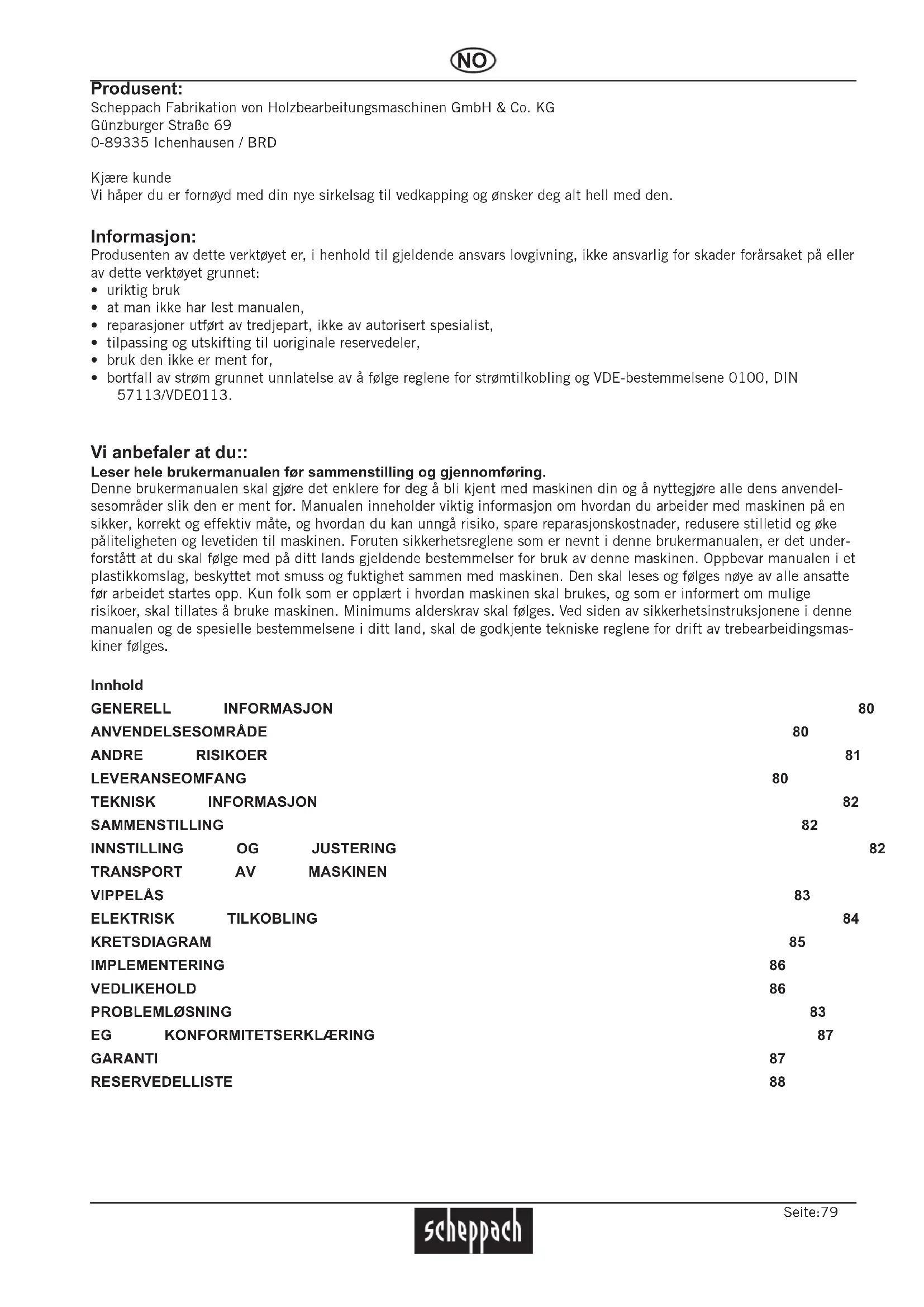 - bortfall av strøm grunnet unnlatelse av å følge reglene for strømtilkobling og VDE-bestemmelsene 0100, DIN 57113/VDE0113. Vi anbefaler at du:: Leser hele brukermanualen før sammenstilling og gjennomføring. Denne brukermanualen skal gjøre det enklere for deg å bli kjent med maskinen din og å nyttegjøre alle dens anvendel- sesområder slik den er ment for. Manualen inneholder viktig informasjon om hvordan du arbeider med maskinen på en sikker, korrekt og effektiv måte, og hvordan du kan unngå risiko, spare reparasjonskostnader, redusere stilletid og øke påliteligheten og levetiden til maskinen. Foruten sikkerhetsreglene som er nevnt i denne brukermanualen, er det under- forstått at du skal følge med på ditt lands gjeldende bestemmelser for bruk av denne maskinen. Oppbevar manualen i et plastikkomslag, beskyttet mot smuss og fuktighet sammen med maskinen. Den skal leses og følges nøye av alle ansatte før arbeidet startes opp. Kun folk som er opplært i hvordan maskinen skal brukes, og som er informert om mulige risikoer, skal tillates å bruke maskinen. Minimums alderskrav skal følges. Ved siden av sikkerhetsinstruksjonene i denne manualen og de spesielle bestemmelsene i ditt land, skal de godkjente tekniske reglene for drift av trebearbeidingsmas- kiner følges. Innhold GENERELL INFORMASJON 80 ANVENDELSESOMRÅDE 80 ANDRE RISIKOER 81 LEVERANSEOMFANG 80 TEKNISK INFORMASJON 82 SAMMENSTILLING 82