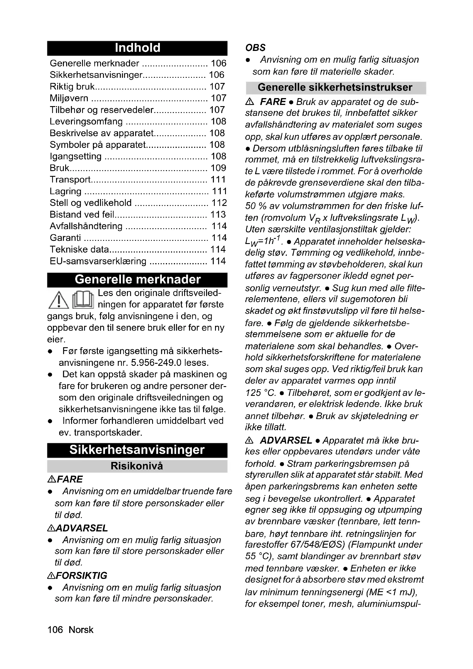 Kaapelin pituus m 10106 Norsk Indhold Generelle merknader Les den originale driftsveiled- ningen for apparatet før første gangs bruk, følg anvisningene i den, og oppbevar den til senere bruk eller for en ny eier. ● Før første igangsetting må sikkerhets- anvisningene nr. 5.956-249.0 leses. ● Det kan oppstå skader på maskinen og fare for brukeren og andre personer der- som den originale driftsveiledningen og sikkerhetsanvisningene ikke tas til følge. ● Informer forhandleren umiddelbart ved ev. transportskader. Sikkerhetsanvisninger Risikonivå FARE ● Anvisning om en umiddelbar truende fare som kan føre til store personskader eller til død. 몇 ADVARSEL ● Anvisning om en mulig farlig situasjon som kan føre til store personskader eller til død. 몇 FORSIKTIG ● Anvisning om en mulig farlig situasjon som kan føre til mindre personskader. OBS ● Anvisning om en mulig farlig situasjon som kan føre til materielle skader. Generelle sikkerhetsinstrukser FARE ● Bruk av apparatet og de sub- stansene det brukes til, innbefattet sikker avfallshåndtering av materialet som suges opp, skal kun utføres av opplært personale. ● Dersom utblåsningsluften føres tilbake til rommet, må en tilstrekkelig luftvekslingsra- te L være tilstede i rommet. For å overholde de påkrevde grenseverdiene skal den tilba- keførte volumstrømmen utgjøre maks. 50 % av volumstrømmen for den friske luf- ten (romvolum V