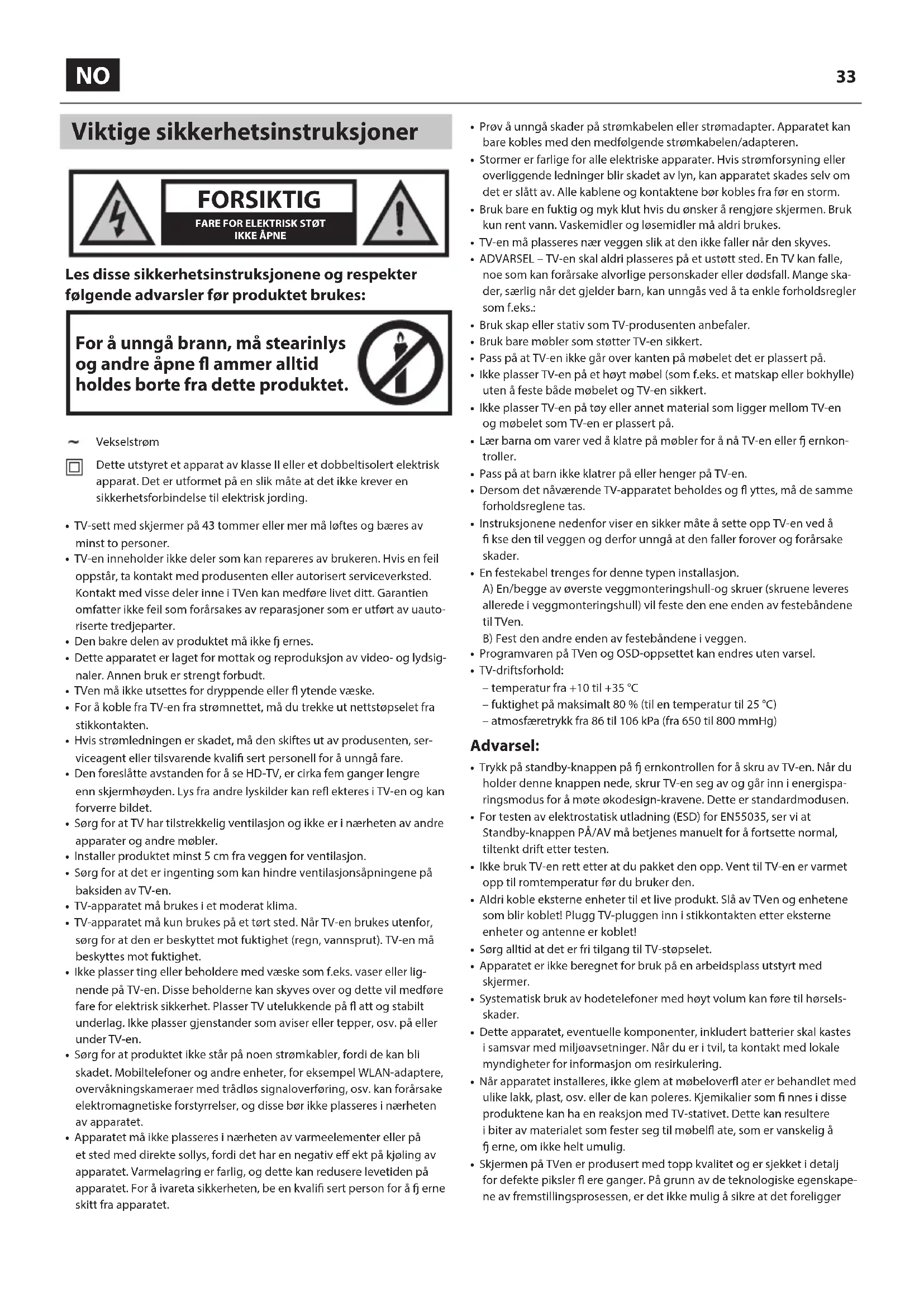 - ADVARSEL – TV-en skal aldri plasseres på et ustøtt sted. En TV kan falle, noe som kan forårsake alvorlige personskader eller dødsfall. Mange ska- der, særlig når det gjelder barn, kan unngås ved å ta enkle forholdsregler som f.eks.:
