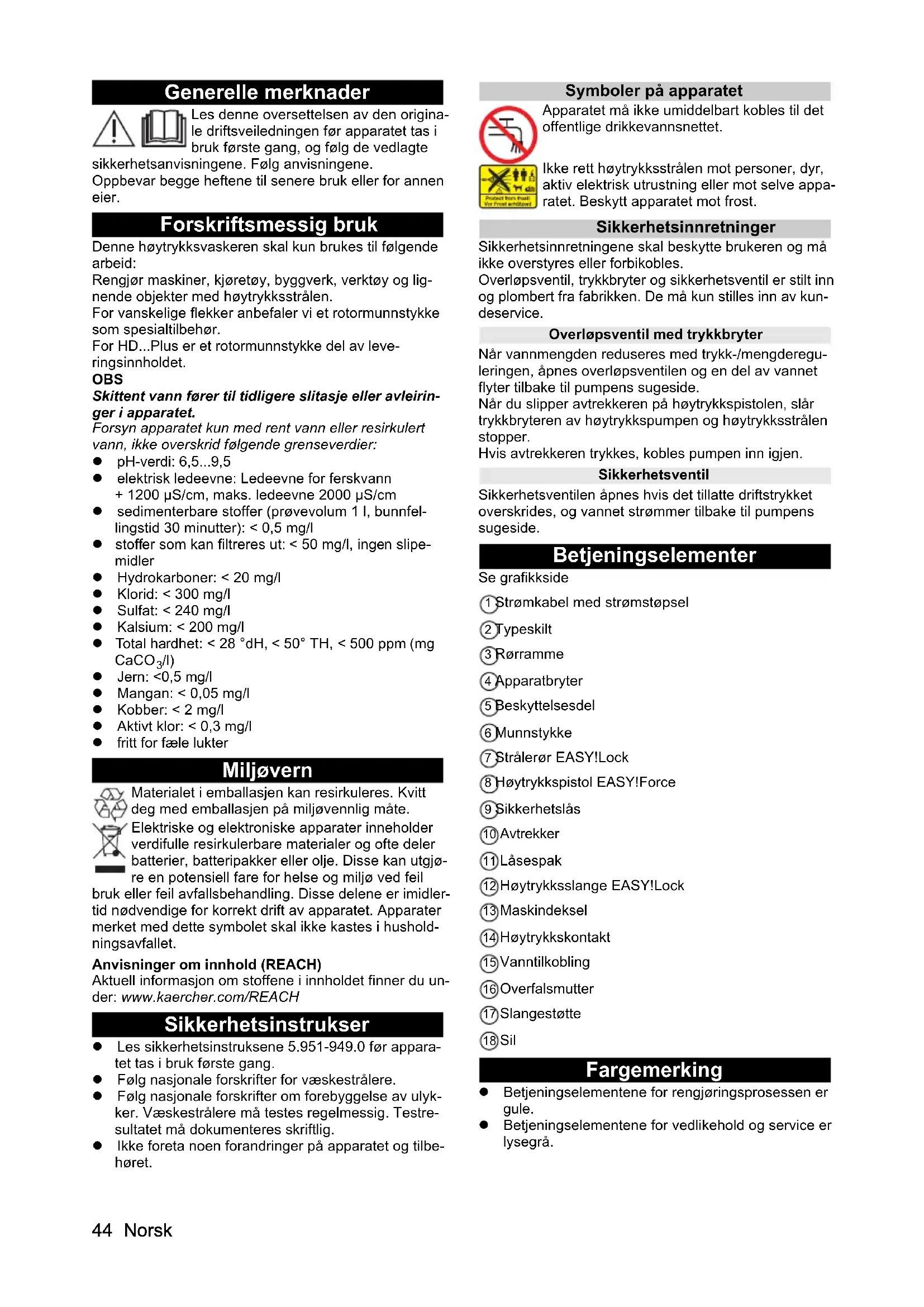 /l) Jern: <0,5 mg/l Mangan: < 0,05 mg/l Kobber: < 2 mg/l Aktivt klor: < 0,3 mg/l fritt for fæle lukter Miljøvern Materialet i emballasjen kan resirkuleres. Kvitt deg med emballasjen på miljøvennlig måte. Elektriske og elektroniske apparater inneholder verdifulle resirkulerbare materialer og ofte deler batterier, batteripakker eller olje. Disse kan utgjø- re en potensiell fare for helse og miljø ved feil bruk eller feil avfallsbehandling. Disse delene er imidler- tid nødvendige for korrekt drift av apparatet. Apparater merket med dette symbolet skal ikke kastes i hushold- ningsavfallet. Anvisninger om innhold (REACH) Aktuell informasjon om stoffene i innholdet finner du un- der: www.kaercher.com/REACH Sikkerhetsinstrukser Les sikkerhetsinstruksene 5.951-949.0 før appara- tet tas i bruk første gang. Følg nasjonale forskrifter for væskestrålere. Følg nasjonale forskrifter om forebyggelse av ulyk- ker. Væskestrålere må testes regelmessig. Testre- sultatet må dokumenteres skriftlig. Ikke foreta noen forandringer på apparatet og tilbe- høret. Symboler på apparatet Apparatet må ikke umiddelbart kobles til det offentlige drikkevannsnettet. Ikke rett høytrykksstrålen mot personer, dyr, aktiv elektrisk utrustning eller mot selve appa- ratet. Beskytt apparatet mot frost. Sikkerhetsinnretninger Sikkerhetsinnretningene skal beskytte brukeren og må ikke overstyres eller forbikobles. Overløpsventil, trykkbryter og sikkerhetsventil er stilt inn og plombert fra fabrikken. De må kun stilles inn av kun- deservice. Overløpsventil med trykkbryter Når vannmengden reduseres med trykk-/mengderegu- leringen, åpnes overløpsventilen og en del av vannet flyter tilbake til pumpens sugeside. Når du slipper avtrekkeren på høytrykkspistolen, slår trykkbryteren av høytrykkspumpen og høytrykksstrålen stopper. Hvis avtrekkeren trykkes, kobles pumpen inn igjen. Sikkerhetsventil Sikkerhetsventilen åpnes hvis det tillatte driftstrykket overskrides, og vannet strømmer tilbake til pumpens sugeside. Betjeningselementer Se grafikkside 1 Strømkabel med strømstøpsel 2 Typeskilt 3 Rørramme 4 Apparatbryter 5 Beskyttelsesdel 6 Munnstykke 7 Strålerør EASY!Lock 8 Høytrykkspistol EASY!Force 9 Sikkerhetslås 10 Avtrekker 11 Låsespak 12 Høytrykksslange EASY!Lock 13 Maskindeksel 14 Høytrykkskontakt 15 Vanntilkobling 16 Overfalsmutter 17 Slangestøtte 18 Sil Fargemerking Betjeningselementene for rengjøringsprosessen er gule. Betjeningselementene for vedlikehold og service er lysegrå.Norsk 45 Utpakking