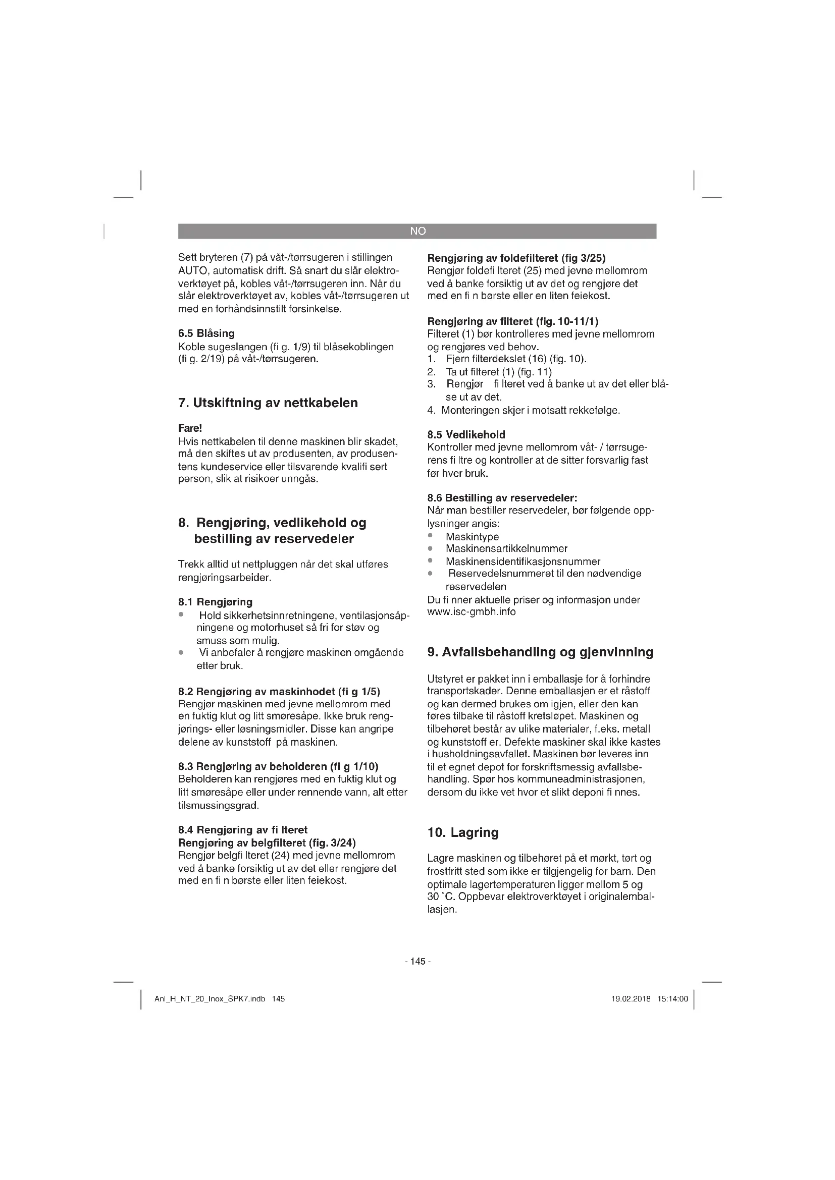 ressen: www.isc-gmbh.info. Hold tilgjengelig kvitteringen for kjøpet eller andre papirer som doku- menterer at du har kjøpt en ny maskin. Maskiner som sendes inn uten tilhørende dokumentasjon eller uten merkeplate, prekluderes fra garantiytelse på grunn av manglende mulighet for å tilordne dem. Dersom defekten på maskinen dekkes av vår garantiytelse, vil du omgående få i retur en re- parert eller en ny maskin. Når det gjelder slitedeler, forbruksdeler og manglende deler, henviser vi til de begrensningene som gjel- der for garantien i henhold til serviceinformasjonen i denne bruksanvisningen. Anl_H_NT_20_Inox_SPK7.indb 148Anl_H_NT_20_Inox_SPK7.indb 148 19.02.2018 15:14:0019.02.2018 15:14:00IS