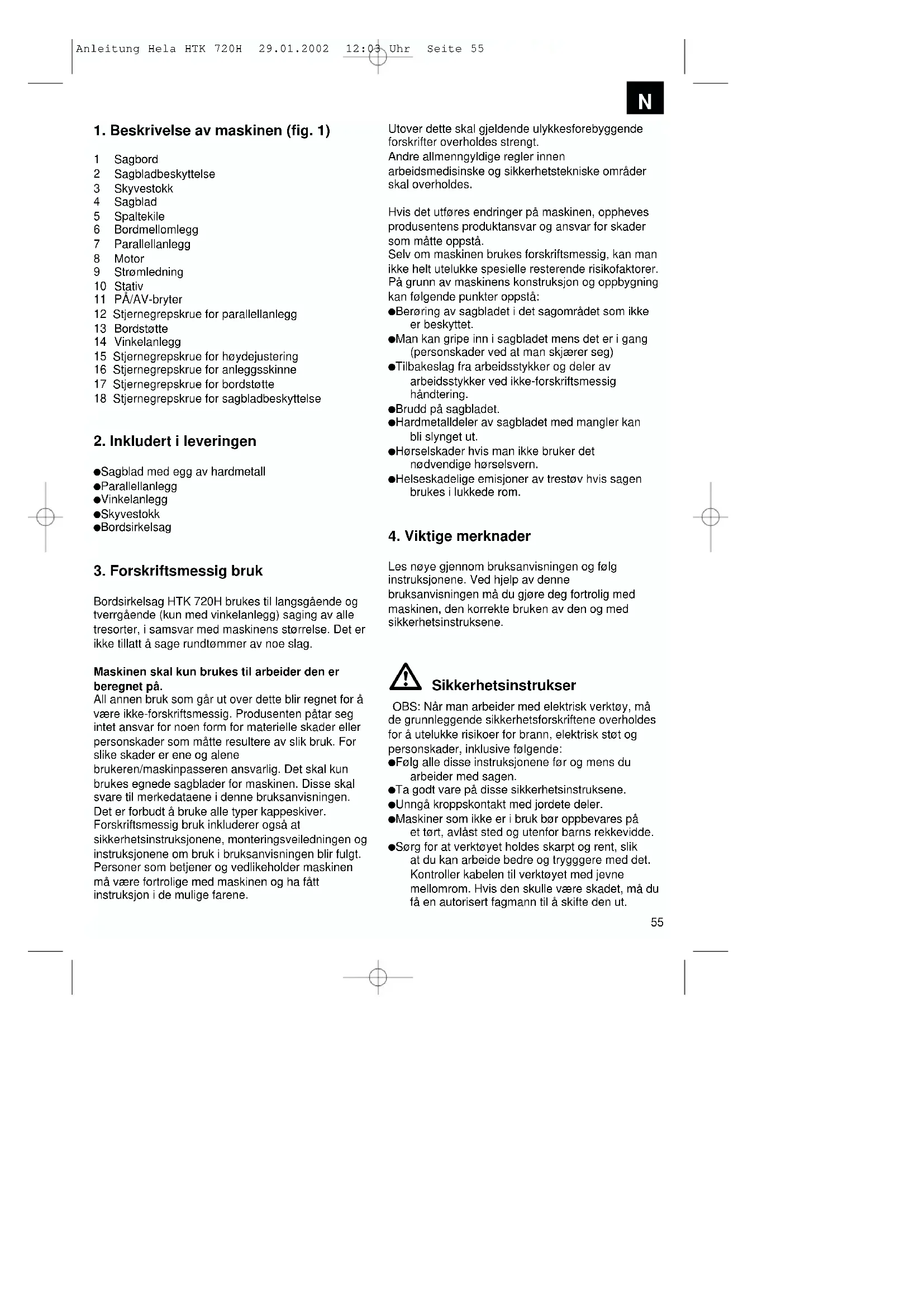 Anleitung Hela HTK 720H 29.01.2002 12:03 Uhr Seite 5556 Kontroller skjøteledningene med jevne mellomrom og skift dem ut hvis de er blitt skadet. Utendørs må du kun bruke hertil godkjente og tilsvarende merkede skjøteledninger. Vær oppmerksom på det du gjør. Ta i fatt med arbeidet på fornuftig måte. Ikke bruk verktøyet hvis du er trett. Ikke bruk verktøy hvor det ikke er mulig å slå bryteren på og av. Advarsel! Hvis du benytter andre redskaper eller annet tilbehør, kan det være fare for personskader. Trekk alltid ut nettstøpslet når det skal utføres justeringer og vedlikeholdsarbeider. Gi sikkerhetsinstruksjonene videre til alle personer som arbeider med maskinen. Ikke bruk sagen til å sage ved med. Ikke bruk sagen til tverrkapping av rundtømmer. Forsiktig ! På grunn av det roterende sagbladet er det fare for å skade hender og fingre. Maskinen er utstyrt med en sikkerhetsbryter (11) som forhindrer at den startes igjen etter svikt på spenningen. Før du setter maskinen i drift, må du kontrollere at spenningen på maskinens merkeplate stemmer overens med nettspenningen. Hvis det kreves bruk av en skjøteledning, må du forvisse deg om at skjøteledningens tverrsnitt er tilstrekkelig stort for sagens strømforbruk. Minste tverrsnitt 1 mm2 Kabeltrommelen skal kun brukes i avrullet tilstand. Ikke bær sagen etter nettkabelen. strømledninger med feil eller skader. Bruk ikke kabelen til å trekke støpslet ut av stikkontakten. Utsett ikke kabelen for varme, olje og skarpe kanter. Ikke utsett sagen for regn og ikke bruk maskinen i fuktige eller våte omgivelser. Sørg for god belysning. Når man arbeider utendørs, anbefales det å sklisikkert skotøy. Sagen skal ikke brukes i nærheten av brennbare væsker eller gasser. Bruk egnede arbeidsklær! Vidtsittende klær eller smykker kan bli revet med av det roterende sagbladet. Bruk hårnett hvis du har langt hår. Unngå å innta unormale holdninger med kroppen. Personer som betjener maskinen må være minst 18 år gamle, personer under utdanning minst 16 år gamle, sistnevnte imidlertid kun under tilsyn. Uorden i arbeidssonen kan føre til ulykker. Ikke la andre personer berøre verktøyet eller nettkabelen, spesielt ikke barn. Hold slike personer på avstand fra arbeidsplassen. Hold barn på avstand fra en maskin som er koplet til nettet. Hold arbeidsplassen fri for treavfall og deler som ligger og slenger. Oppmerksomheten til personer som arbeider med maskinen må ikke avledes. Vær oppmerksom på motorens og sagbladets dreieretning. Sagbladene (4) må ikke under noen omstendighet bremses ved at man presser mot dem fra siden etter at drivverket er slått av. Monter kun skarpe sagblader (4) som er fri for sprekker og deformasjoner. Ikke bruk sirkelsagblader (4) av høylegert hurtigstål (HSS -stål). Det er ikke tillatt å demontere eller sette ut av funksjon sikkerhetsanordningene (2, 5) på maskinen. Der er kun tillatt å bruke verktøy som svarer til normen prEN 847-1:1996 på maskinen. Sagblader (4) med feil må skiftes ut øyeblikkelig. Ikke bruk sagblader som ikke svarer til de merkedata som er angitt i denne bruksanvisningen. Man må kontrollere at alle anordningene (2, 15) som dekker til sagbladet, fungerer upåklagelig. OBS: Det er ikke tillatt å utføre innskjæringer med denne sagen. Sikkerhetsanordninger med skader eller feil må skiftes ut umiddelbart. Spaltekilen (5) er en viktig sikkerhetsanordning som fører arbeidsstykket og forhindrer at skjærefugen bak sagbladet lukkes og at arbeidsstykket slår tilbake. Vær oppmerksom på spaltekilens tykkelse. Spaltekilen må ikke være tynnere enn sagbladlegemet og ikke tykkere enn bredden på sagbladets skjærefuge. Under hver arbeidsgang må beskyttelsesdekslet (2) være senket ned på arbeidsstykket. Det er tvingende nødvendig å bruke en skyvestokk (3) (bredde mindre enn 120 mm) ved langsgående saging av smale arbeidsstykker. Ikke sag arbeidsstykker som er for små til at man kan holde dem trygt med hånden. Under tilskjæring av smale trestykker må parallellanlegget spennes fast på høyre side av sagbladet. Arbeidsstillingen må alltid være på siden av sagbladet. Ikke belast maskinen så mye at den stanser.