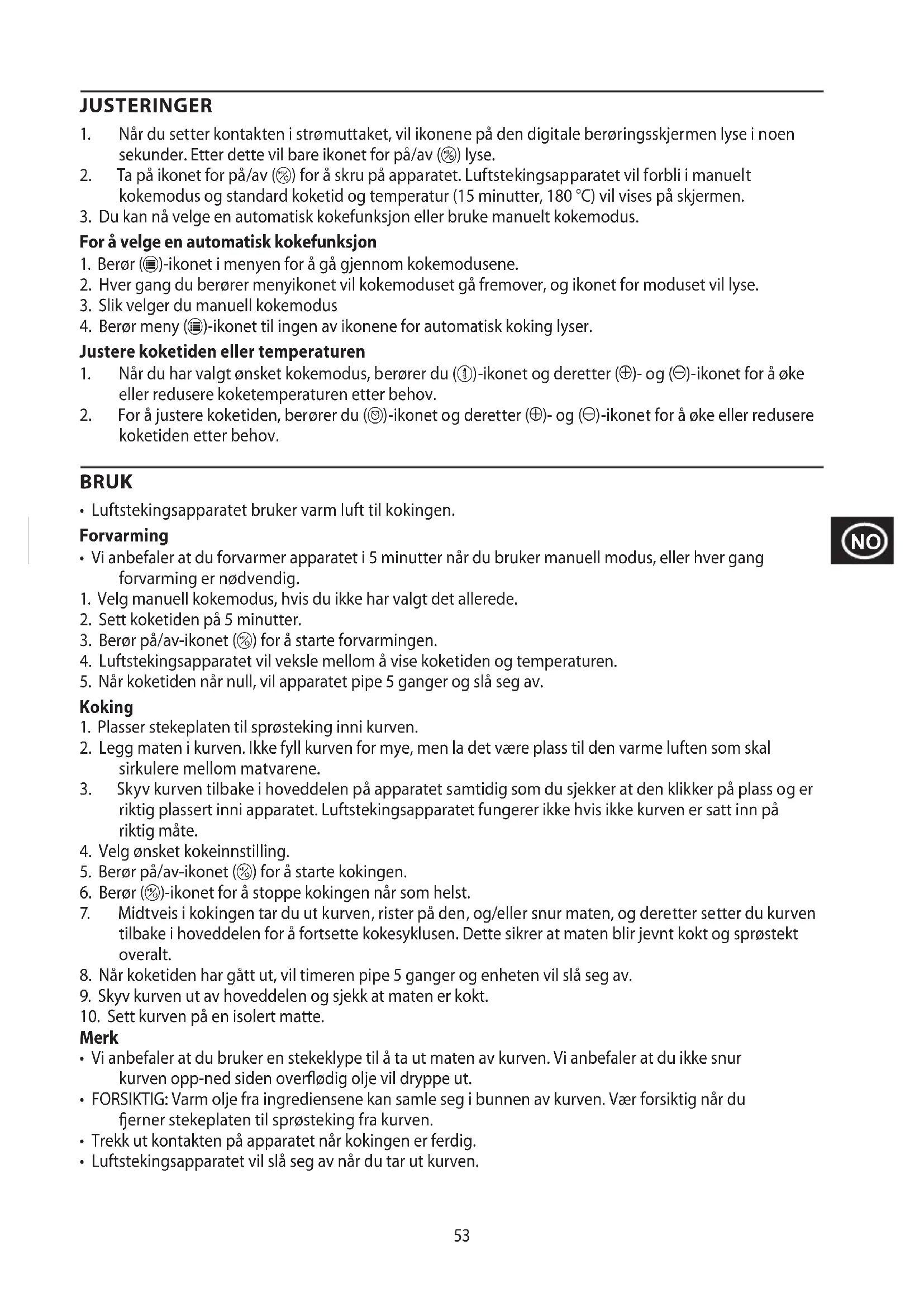 Tid (min) Remarks Chips 200 15-20 Potetbåter 200 15-20 Pommes frites 200 12-20 Kyllingnuggets 200 6-10 Fiskefileter 200 10-12 Fiskepinner 180 6-10 Løkringer 180 10-15 Scampi 180 10-1555 Merk: Kjøtt med mye fett (f.eks. svinekjøtt) kan avgi mye røyk Dette er normalt siden overflødig olje kokes på høy temperatur. Hvis du setter ned temperaturen kan det avgis mindre røyk.