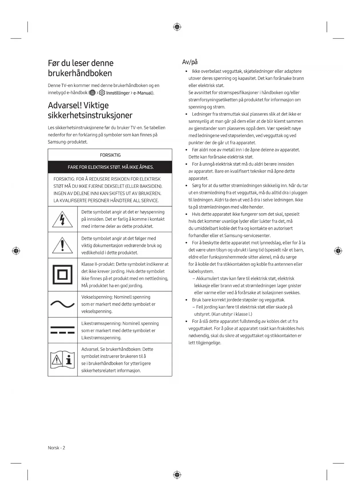 - Figurene og illustrasjonene i denne brukerveiledningen er bare til referanse og kan avvike fra det faktiske produktutseendet. Produktdesign og -spesifikasjoner kan endres uten forvarsel. Etter reparasjon av en ikke-autorisert tjenesteleverandør, selvreparasjon eller ikke-profesjonell reparasjon av produktet, er Samsung ikke ansvarlig for skade på produktet personskade eller andre produktsikkerhetsproblemer forårsaket av ethvert forsøk på å reparere produktet som ikke følger disse reparasjons- og vedlikeholdsinstruksjonene nøye. Eventuelle skader på produktet forårsaket av et forsøk på å reparere produktet av andre personer enn en Samsung-sertifisert tjenesteleverandør vil ikke dekkes av garantien. Besøk samsung.com/support for å finne ytterligere informasjon om ekstern strømadapter og fjernkontroll tilknyttet EUs Ecodesign-direktiv - ErP-regulering Redusert strømforbruk Når du slår av TV-en, går den inn i standby-modus. I standby- modus fortsetter den å trekke en liten mengde strøm. Du kan redusere strømforbruket ved å koble fra strømledningen når du ikke skal bruke TV-en i en lengre periode. Lisenser The terms HDMI and HDMI High-Definition Multimedia Interface, and the HDMI Logo are trademarks or registered trademarks of HDMI Licensing LLC in the United States and other countries. Samsung erklærer herved at dette radioutstyret er i samsvar med direktiv 2014/53/EU og relevante britiske lovkrav. Hele teksten i samsvarserklæringen er tilgjengelig på følgende Internett-adresse: http://www.samsung.com gå til Support og angi modellnavnet. Dette utstyret kan brukes i alle EU-land og Storbritannia. 5 GHz WLAN (Wi-Fi)-funksjonen på dette utstyret kan kun brukes innendørs. BT maks overføringseffekt: 100 mW ved 2,4 GHz – 2,4835 GHz Wi-Fi maks. overføringseffekt: 100mW at 2.4GHz-2.4835GHz, 200mW på 5.15GHz-5.25GHz, 100mW 5.25GHz-5.35GHz & 5.47GHz - 5.725GHz Norsk - 7 NorskKaste batteriene i produktet på riktig måte (Gjelder i land med avfallssortering) Dette merket på batteriet, veiledningen eller emballasjen indikerer at batteriene i dette produktet ikke skal kastes som vanlig husholdningsavfall når de ikke lenger er i bruk. Der det er merket, angir de kjemiske symbolene Hg, Cd eller Pb at batteriet inneholder kvikksølv, kadmium eller bly over referansenivåene i EC-direktiv 2006/66. Hvis batteriene ikke avhendes på riktig måte, kan innholdet skade miljøet eller menneskers helse. For å beskytte naturressurser og fremme gjenbruk av materialer må du skille batterier fra andre typer avfall og resirkulere dem gjennom det lokale gratissystemet for batteriretur.