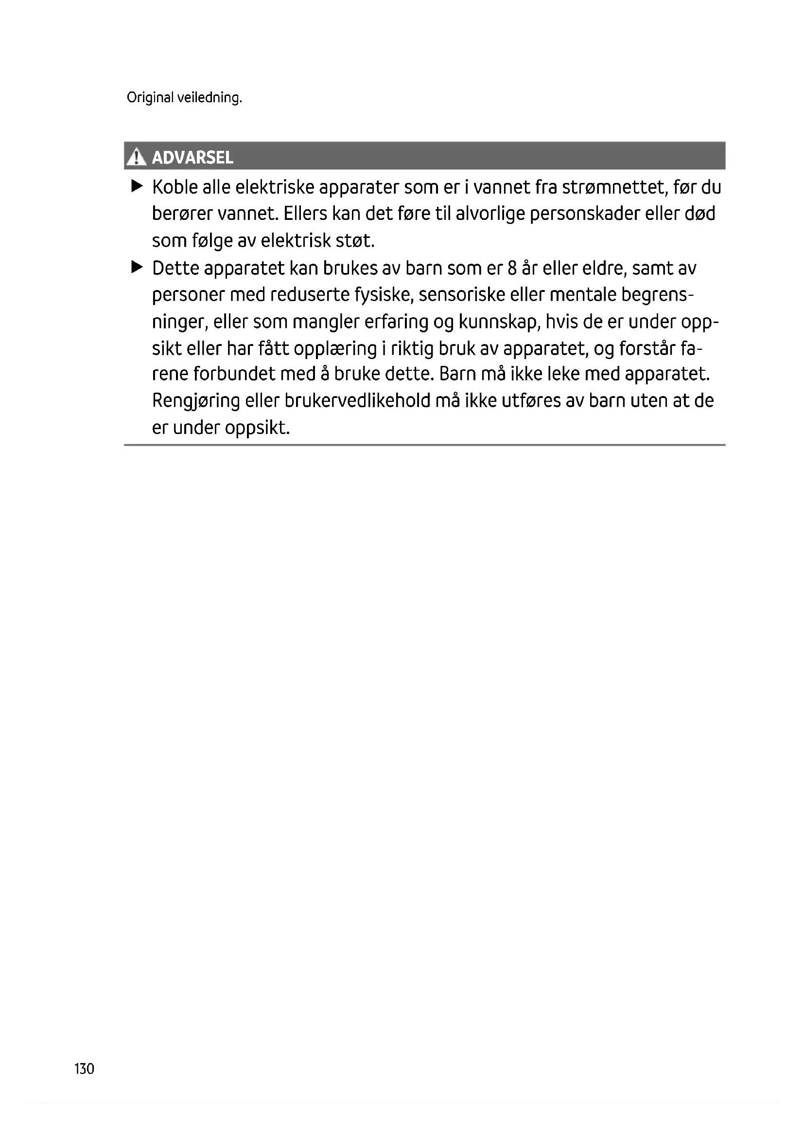 ADVAR SEL ADVARSEL Koble alle elektriske apparater som er i vannet fra strømnettet, før du berører vannet. Ellers kan det føre til alvorlige personskader eller død som følge av elektrisk støt. Dette apparatet kan brukes av barn som er 8 år eller eldre, samt av personer med reduserte fysiske, sensoriske eller mentale begrens- ninger, eller som mangler erfaring og kunnskap, hvis de er under opp- sikt eller har fått opplæring i riktig bruk av apparatet, og forstår fa- rene forbundet med å bruke dette. Barn må ikke leke med apparatet. Rengjøring eller brukervedlikehold må ikke utføres av barn uten at de er under oppsikt.NO