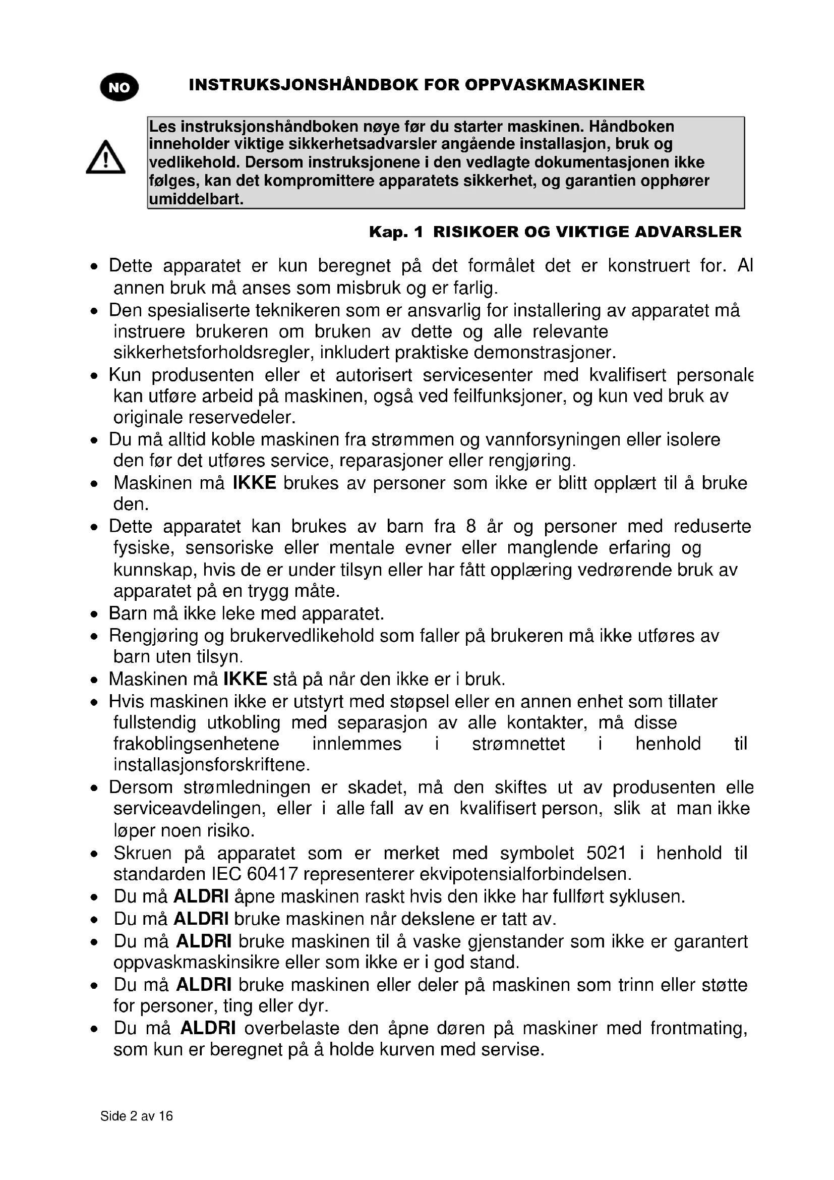 Les instruksjonshåndboken nøye før du starter maskinen. Håndboken inneholder viktige sikkerhetsadvarsler angående installasjon, bruk og vedlikehold. Dersom instruksjonene i den vedlagte dokumentasjonen ikke følges, kan det kompromittere apparatets sikkerhet, og garantien opphører umiddelbart. Kap. 1 RISIKOER OG VIKTIGE ADVARSLER Dette apparatet er kun beregnet på det formålet det er konstruert for. All annen bruk må anses som misbruk og er farlig. Den spesialiserte teknikeren som er ansvarlig for installering av apparatet må instruere brukeren om bruken av dette og alle relevante sikkerhetsforholdsregler, inkludert praktiske demonstrasjoner. Kun produsenten eller et autorisert servicesenter med kvalifisert personale kan utføre arbeid på maskinen, også ved feilfunksjoner, og kun ved bruk av originale reservedeler. Du må alltid koble maskinen fra strømmen og vannforsyningen eller isolere den før det utføres service, reparasjoner eller rengjøring. Maskinen må IKKE brukes av personer som ikke er blitt opplært til å bruke den. Dette apparatet kan brukes av barn fra 8 år og personer med reduserte fysiske, sensoriske eller mentale evner eller manglende erfaring og kunnskap, hvis de er under tilsyn eller har fått opplæring vedrørende bruk av apparatet på en trygg måte. Barn må ikke leke med apparatet. Rengjøring og brukervedlikehold som faller på brukeren må ikke utføres av barn uten tilsyn. Maskinen må IKKE stå på når den ikke er i bruk. Hvis maskinen ikke er utstyrt med støpsel eller en annen enhet som tillater fullstendig utkobling med separasjon av alle kontakter, må disse frakoblingsenhetene innlemmes i strømnettet i henhold til installasjonsforskriftene. Dersom strømledningen er skadet, må den skiftes ut av produsenten eller serviceavdelingen, eller i alle fall av en kvalifisert person, slik at man ikke løper noen risiko. Skruen på apparatet som er merket med symbolet 5021 i henhold til standarden IEC 60417 representerer ekvipotensialforbindelsen. Du må ALDRI åpne maskinen raskt hvis den ikke har fullført syklusen. Du må ALDRI bruke maskinen når dekslene er tatt av. Du må ALDRI bruke maskinen til å vaske gjenstander som ikke er garantert oppvaskmaskinsikre eller som ikke er i god stand. Du må ALDRI bruke maskinen eller deler på maskinen som trinn eller støtte for personer, ting eller dyr. Du må ALDRI overbelaste den åpne døren på maskiner med frontmating, som kun er beregnet på å holde kurven med servise.INSTRUKSJONSHÅNDBOK FOR OPPVASKMASKINER Side 3 av 16