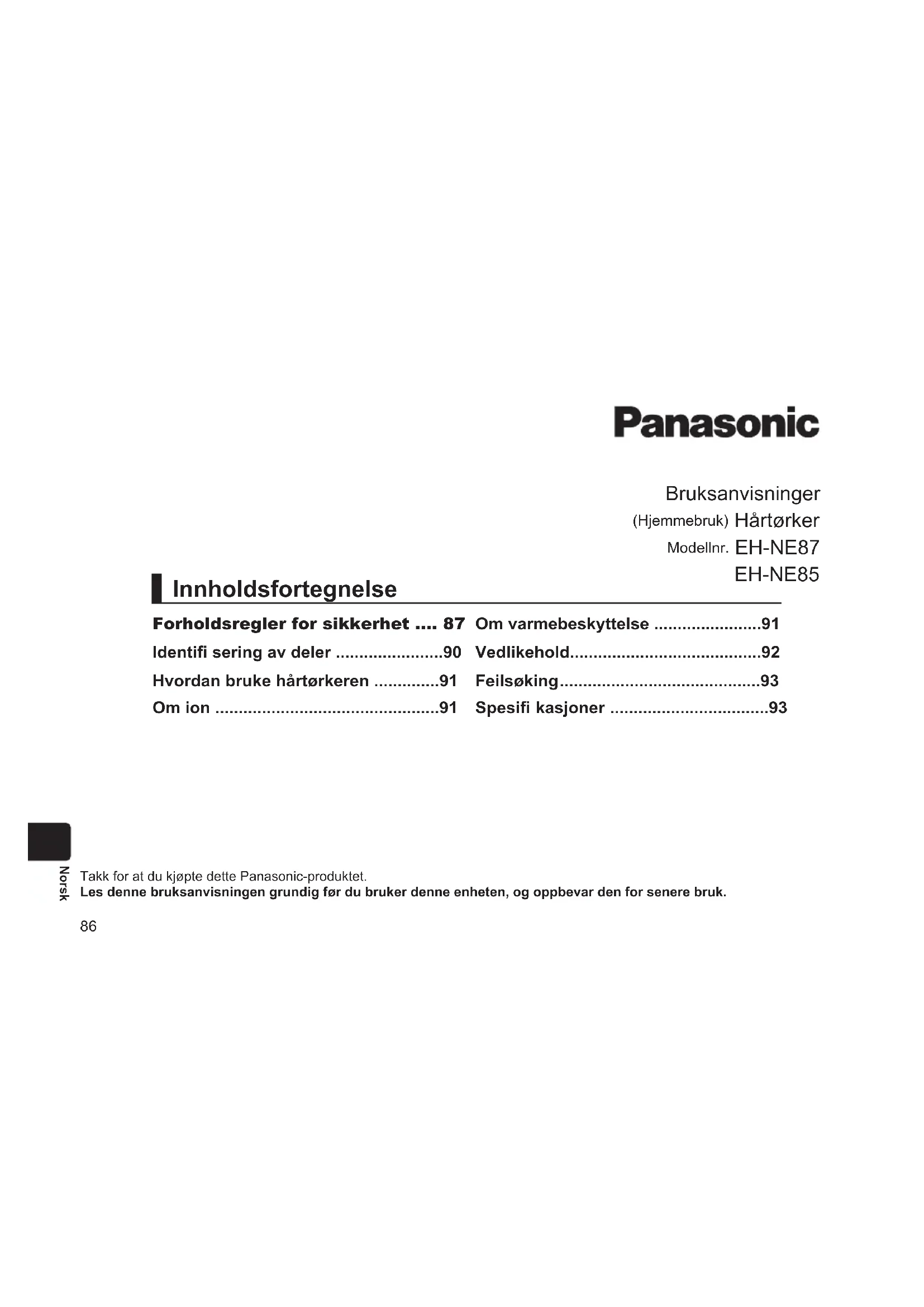 EHNE85 - Hårføner PANASONIC - Gratis bruksanvisning og manual