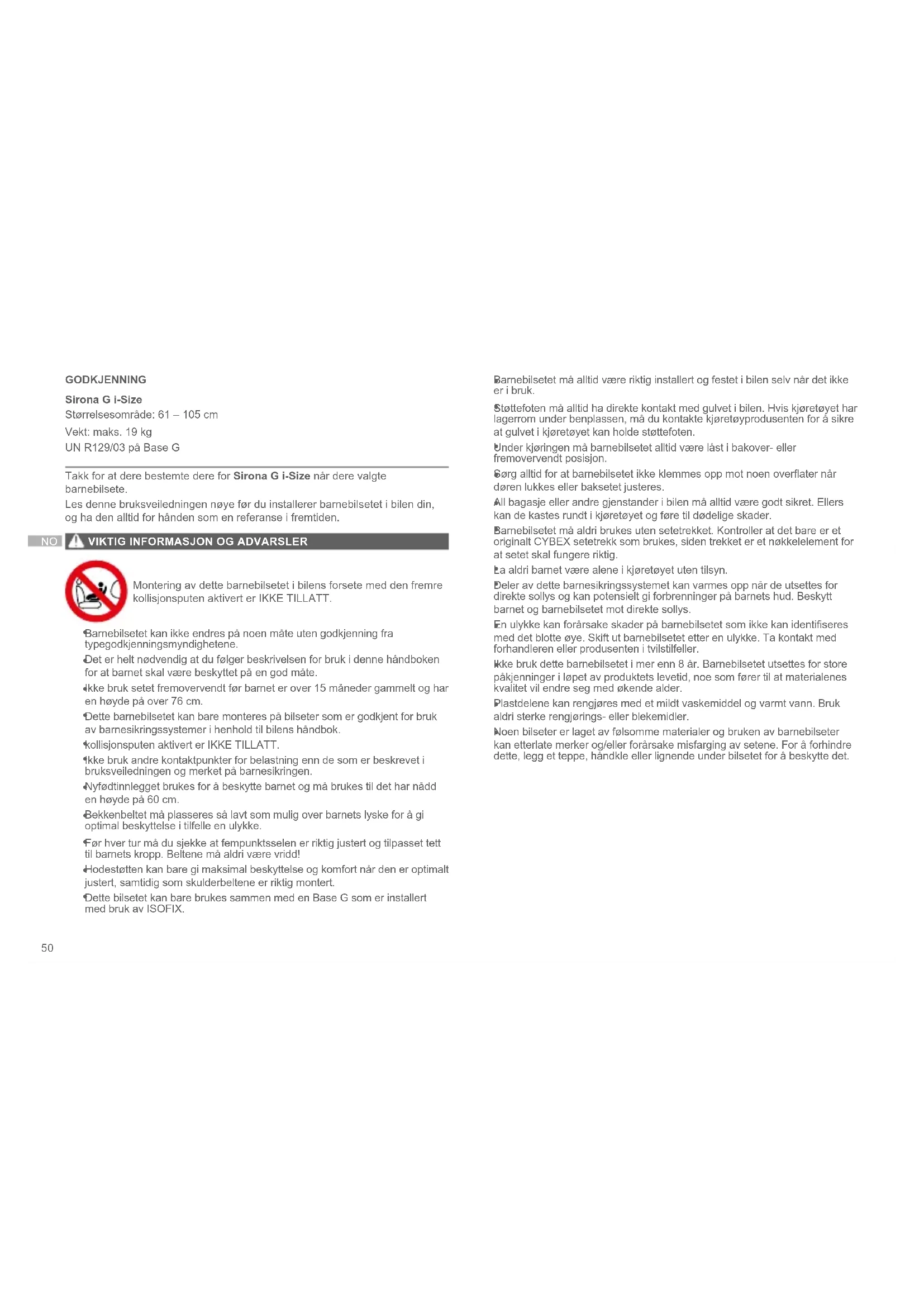 GODKJENNING Sirona G i-Size Størrelsesområde: 61 – 105 cm Vekt: maks. 19 kg UN R129/03 på Base G Takk for at dere bestemte dere for Sirona G i-Size når dere valgte barnebilsete. Les denne bruksveiledningen nøye før du installerer barnebilsetet i bilen din, og ha den alltid for hånden som en referanse i fremtiden.
