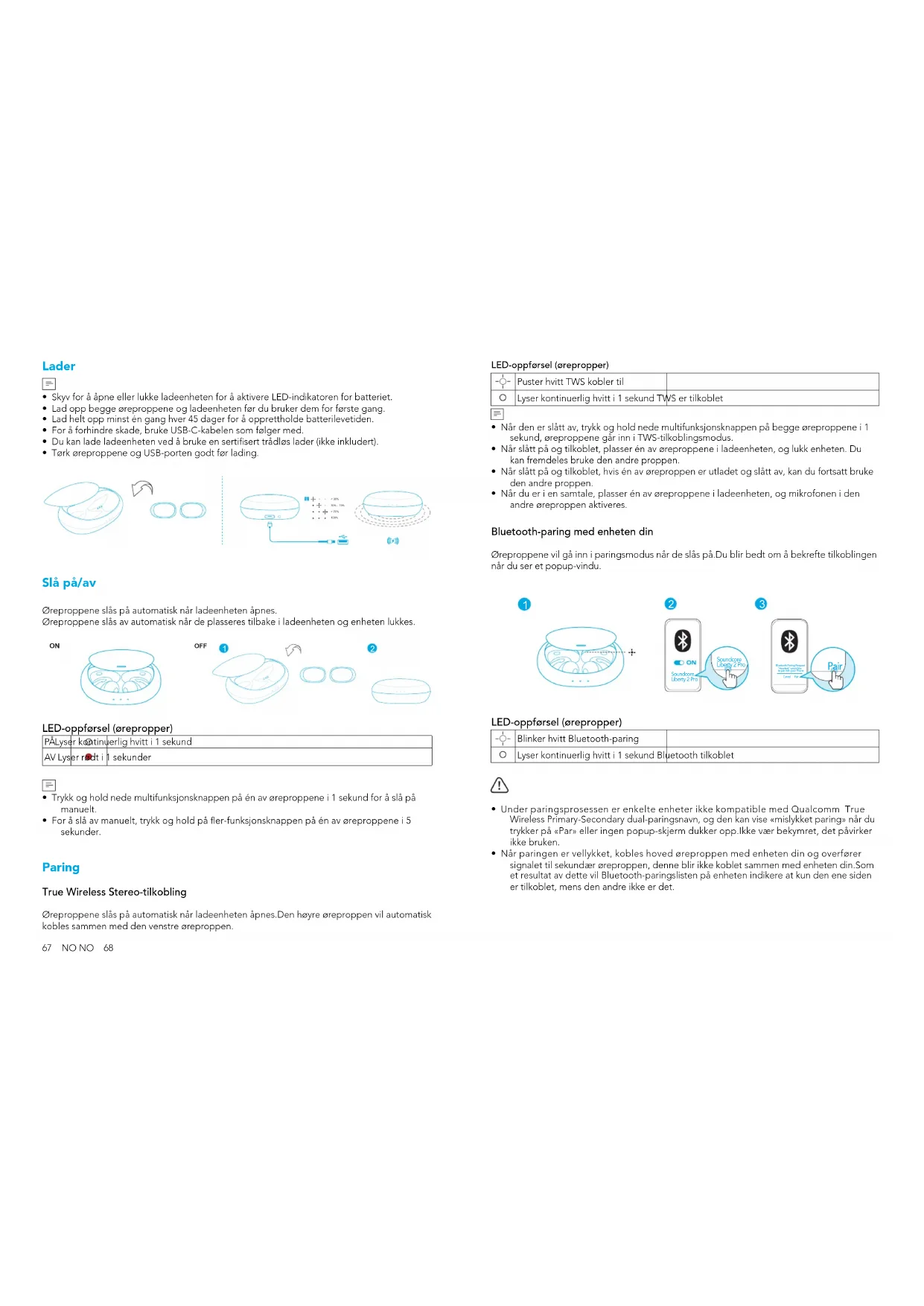 - For å slå av manuelt, trykk og hold på er-funksjonsknappen på én av øreproppene i 5 sekunder. Paring True Wireless Stereo-tilkobling Øreproppene slås på automatisk når ladeenheten åpnes.Den høyre øreproppen vil automatisk kobles sammen med den venstre øreproppen. LED-oppførsel (ørepropper) Puster hvitt TWS kobler til Lyser kontinuerlig hvitt i 1 sekund TWS er tilkoblet