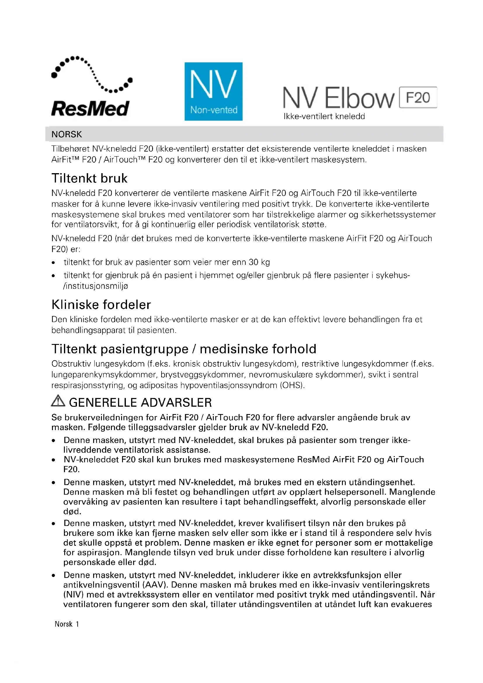 - tiltenkt for gjenbruk på én pasient i hjemmet og/eller gjenbruk på flere pasienter i sykehus- /institusjonsmiljø Kliniske fordeler Den kliniske fordelen med ikke-ventilerte masker er at de kan effektivt levere behandlingen fra et behandlingsapparat til pasienten. Tiltenkt pasientgruppe / medisinske forhold Obstruktiv lungesykdom (f.eks. kronisk obstruktiv lungesykdom), restriktive lungesykdommer (f.eks. lungeparenkymsykdommer, brystveggsykdommer, nevromuskulære sykdommer), svikt i sentral respirasjonsstyring, og adipositas hypoventilasjonssyndrom (OHS). GENERELLE ADVARSLER Se brukerveiledningen for AirFit F20 / AirTouch F20 for flere advarsler angående bruk av masken. Følgende tilleggsadvarsler gjelder bruk av NV-kneledd F20.