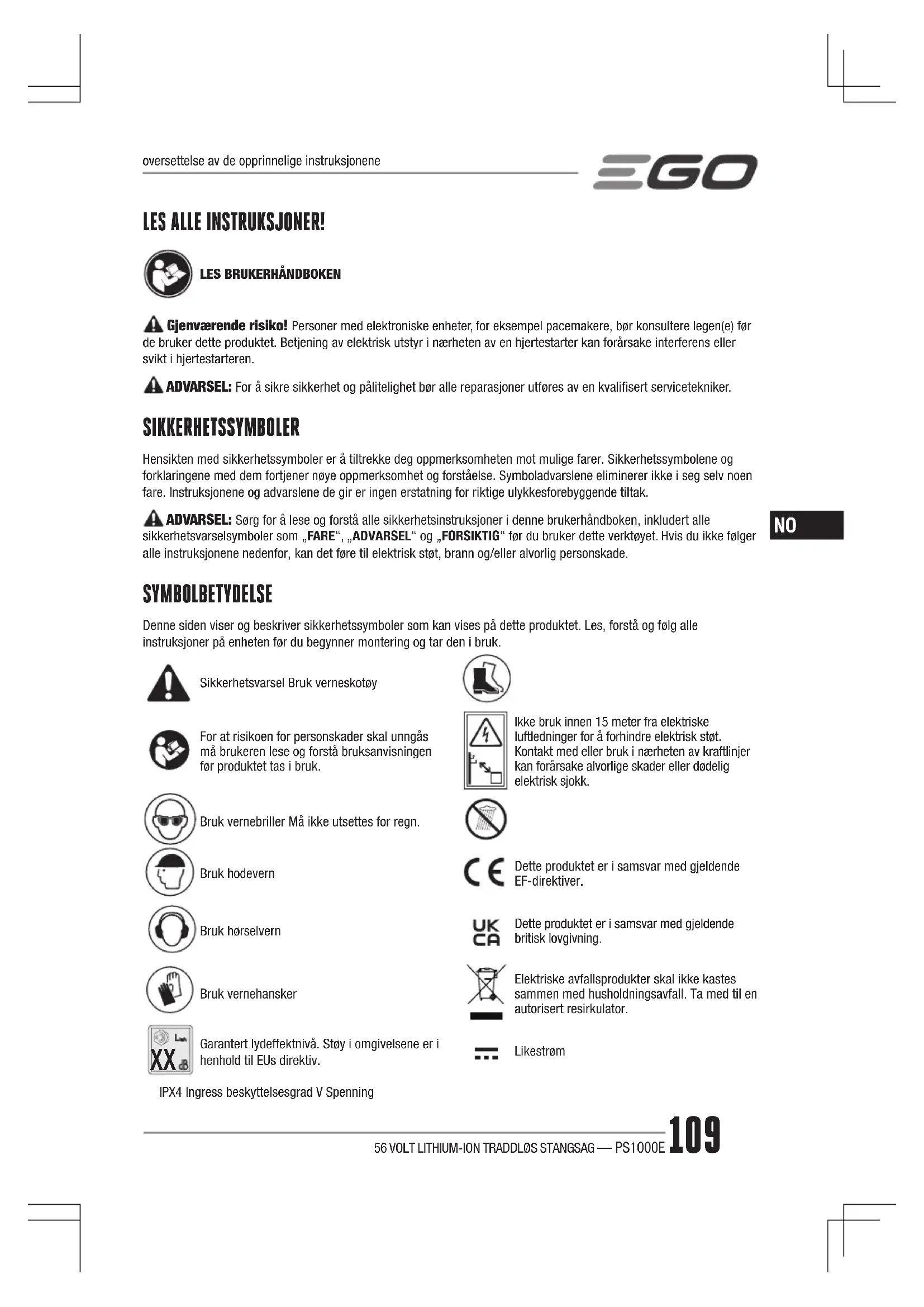 Gjenværende risiko! Personer med elektroniske enheter, for eksempel pacemakere, bør konsultere legen(e) før de bruker dette produktet. Betjening av elektrisk utstyr i nærheten av en hjertestarter kan forårsake interferens eller svikt i hjertestarteren. ADVARSEL: For å sikre sikkerhet og pålitelighet bør alle reparasjoner utføres av en kvalifisert servicetekniker. SIKKERHETSSYMBOLER Hensikten med sikkerhetssymboler er å tiltrekke deg oppmerksomheten mot mulige farer. Sikkerhetssymbolene og forklaringene med dem fortjener nøye oppmerksomhet og forståelse. Symboladvarslene eliminerer ikke i seg selv noen fare. Instruksjonene og advarslene de gir er ingen erstatning for riktige ulykkesforebyggende tiltak. ADVARSEL: Sørg for å lese og forstå alle sikkerhetsinstruksjoner i denne brukerhåndboken, inkludert alle sikkerhetsvarselsymboler som „FARE“, „ADVARSEL“ og „FORSIKTIG“ før du bruker dette verktøyet. Hvis du ikke følger alle instruksjonene nedenfor, kan det føre til elektrisk støt, brann og/eller alvorlig personskade. SYMBOLBETYDELSE Denne siden viser og beskriver sikkerhetssymboler som kan vises på dette produktet. Les, forstå og følg alle instruksjoner på enheten før du begynner montering og tar den i bruk. Sikkerhetsvarsel Bruk verneskotøyFor at risikoen for personskader skal unngås må brukeren lese og forstå bruksanvisningen før produktet tas i bruk.Ikke bruk innen 15 meter fra elektriske luftledninger for å forhindre elektrisk støt. Kontakt med eller bruk i nærheten av kraftlinjer kan forårsake alvorlige skader eller dødelig elektrisk sjokk.Bruk vernebriller Må ikke utsettes for regn.Bruk hodevernDette produktet er i samsvar med gjeldende EF-direktiver.Bruk hørselvernDette produktet er i samsvar med gjeldende britisk lovgivning.Bruk vernehanskerElektriske avfallsprodukter skal ikke kastes sammen med husholdningsavfall. Ta med til en autorisert resirkulator.