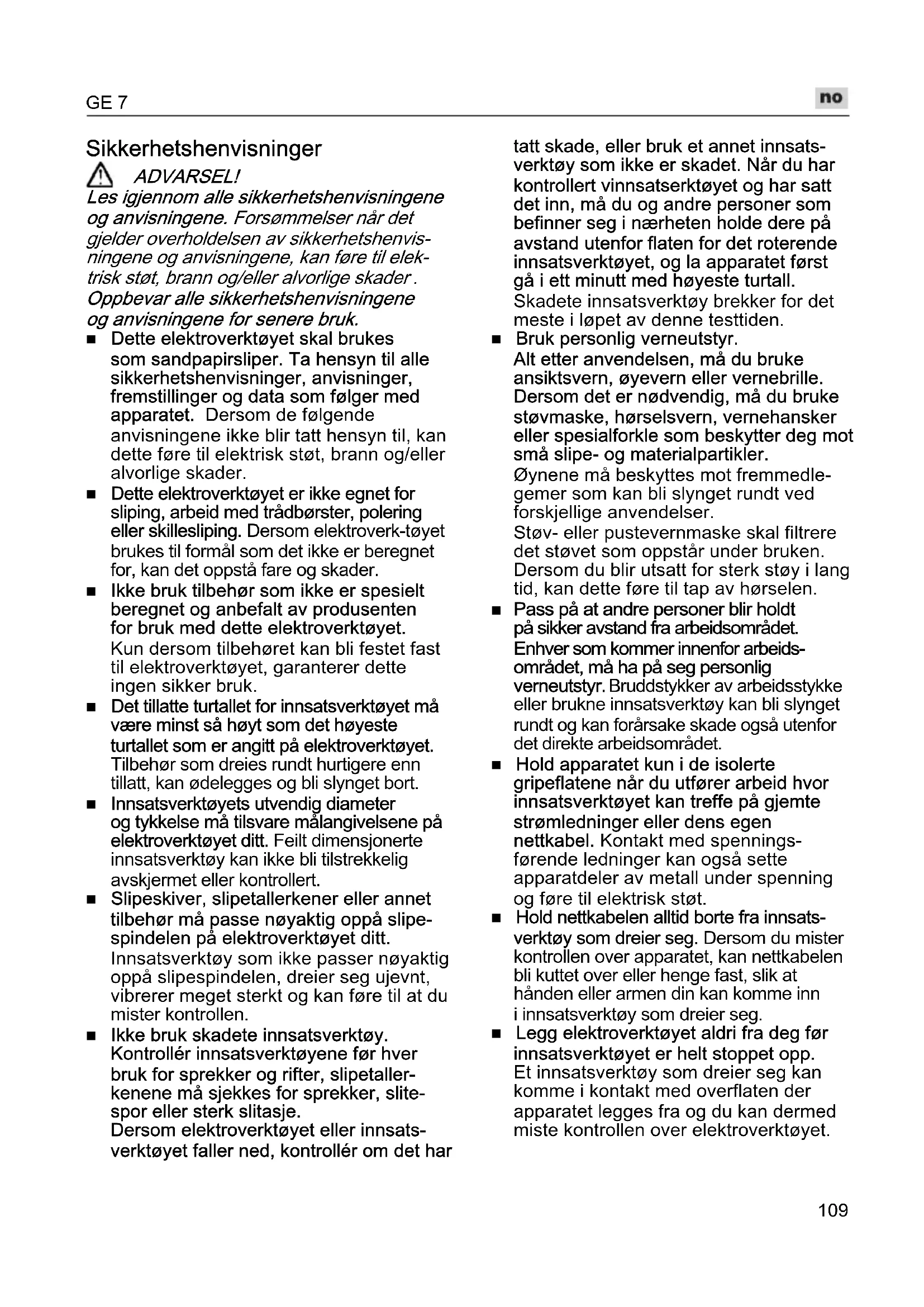 La ikke elektroverktøyet være i gang mens du bærer det. Klærne dine kan ved en tilfeldighet komme i kontakt med innsatsverktøy som dreier seg og henge fast i disse slik at innsatsverktøyet kan bore seg inn i kroppen din. Rengjør regelmessig ventilasjonssprek- kene på elektroverktøyet ditt. Motorviften trekker støv inn i kassen og en sterk oppsamling av metallstøv kan føre til elektrisk fare. Ikke bruk elektroverktøyet i nærheten av brennbare materialer. Gnister kan antenne disse materialene. Ikke bruk innsatsverktøy som krever flytende kjølemiddel. Bruk av vann eller andre flytende kjølemidler kan føre til elektrisk støt. Tilbakeslag og tilsvarende sikkerhetshenvisninger Tilbakeslag er en plutselig reaksjon som oppstår når et dreiende innsatsverktøy, som f.eks. slipeskive, slipetallerken, trådbørste osv henger seg opp eller blokkerer. Fastkjøring eller blokkering fører til en plut- selig stopp av det roterende verktøyet. Dermed blir et ukontrollert elektroverktøy akselerert imot dreieretningen til innsats- verktøyet ved blokkeringsstedet. Dersom f.eks. en slipeskive henger fast eller blokkerer i arbeidsstykket, kan kanten på slipeskiven som skjærer inn i arbeids- stykket bli hengende fast og dermed kan slipeskiven brekke ut eller forårsake et tilbakeslag. Slipeskiven beveger seg så enten imot betjeningspersonen eller bort fra denne, alt etter dreieretningen på skiven ved blok- keringsstedet. Derved kan slipeskivene også brekkes. Et tilbakeslag er følgen av en feil eller ikke sakkyndig bruk av elektroverktøyet. Dette kan forhindres ved egnete forsiktig- hetstiltak som beskrevet under. Hold elektroverktøyet godt fast og hold kroppen og armene i en posisjon som kan fange opp tilbakeslagskrefter. Bruk alltid tilleggshåndtaket, dersom dette finnes, for å ha mest mulig kontroll over tilbakeslagskrefter eller reaksjons- momenter når apparatet kjøres opp. Betjeningspersonen kan ved egnete forsiktighetstiltak beherske tilbakeslags- og reaksjonskreftene. Hendene må aldri komme i nærheten av innsatsverktøy som dreier seg. Innsatsverktøyet kan ved et tilbakeslag bevege seg over hånden din. Unngå at kroppen din kommer inn i det området hvor elektroverktøyet beveger seg ved et tilbakeslag. Et tilbakeslag driver elektroverktøyet i den motsatte retning av bevegelsen til slipeskiven ved blokkeringsstedet. Arbeid særlig forsiktig i områder ved hjørner, skarpe kanter osv. Forhindre at innsatsverktøyene blir slått tilbake fra arbeidsstykket og klemmes fast. Det roterende innsatsverktøyet har lett for å klemme fast ved hjørner, skarpe kanten eller når det kastes tilbake. Dette forårsaker at du mister kontrollen eller at det oppstår et tilbakeslag. Ikke bruk et sagblad med kjede eller tenner. Slike innsatsverktøy forårsaker ofte et tilbakeslag eller gjør at du mister kontrollen over elektroverktøyet. Spesielle sikkerhetshenvisninger for sliping med sandpapir: Ikke bruk overdimensjonerte slipeblad, men følg produsentens angivelser for størrelsen av slipeblad. Slipeblad som rager ut over slipetallerkenen, kan forårsake skader og føre til blokkering eller ødeleggelse av slipebladene, eller også til tilbakeslag.GE 7