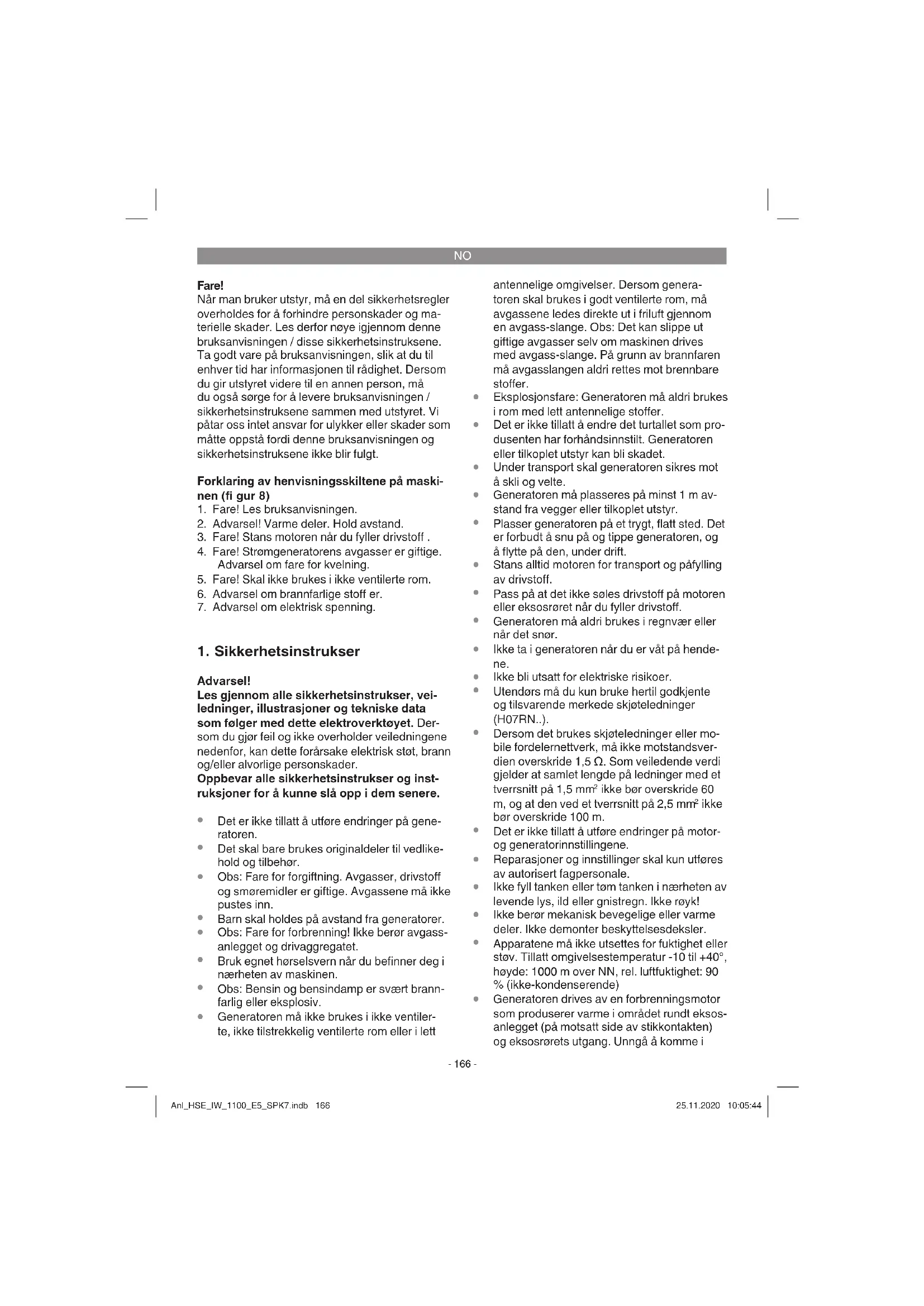 Generatoren drives av en forbrenningsmotor som produserer varme i området rundt eksos- anlegget (på motsatt side av stikkontakten) og eksosrørets utgang. Unngå å komme i Anl_HSE_IW_1100_E5_SPK7.indb 166Anl_HSE_IW_1100_E5_SPK7.indb 166 25.11.2020 10:05:4425.11.2020 10:05:44NO